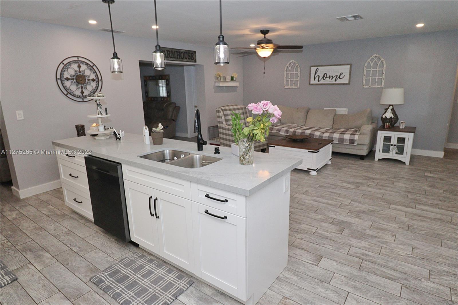 Sunswept Best Buy, Highly upgraded home with an open floor plan, Garage was converted by the former owner to an In-Law Quarters or fourth bedroom with a separate entrance, Remodeled Panda designed kitchen, Shaker cabinets, Quartz countertops, Samsung stainless steel appliances, Impact windows (Except French doors), Updated wood like tile floors throughout, Texture removed from living room and kitchen ceilings for a smooth finish, Two of the three bathrooms have been remodeled, Fenced yard, Stamped concrete driveway, Exterior just repainted, Storage shed, Avocado tree