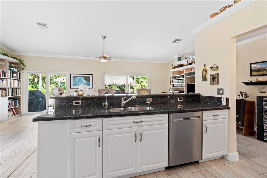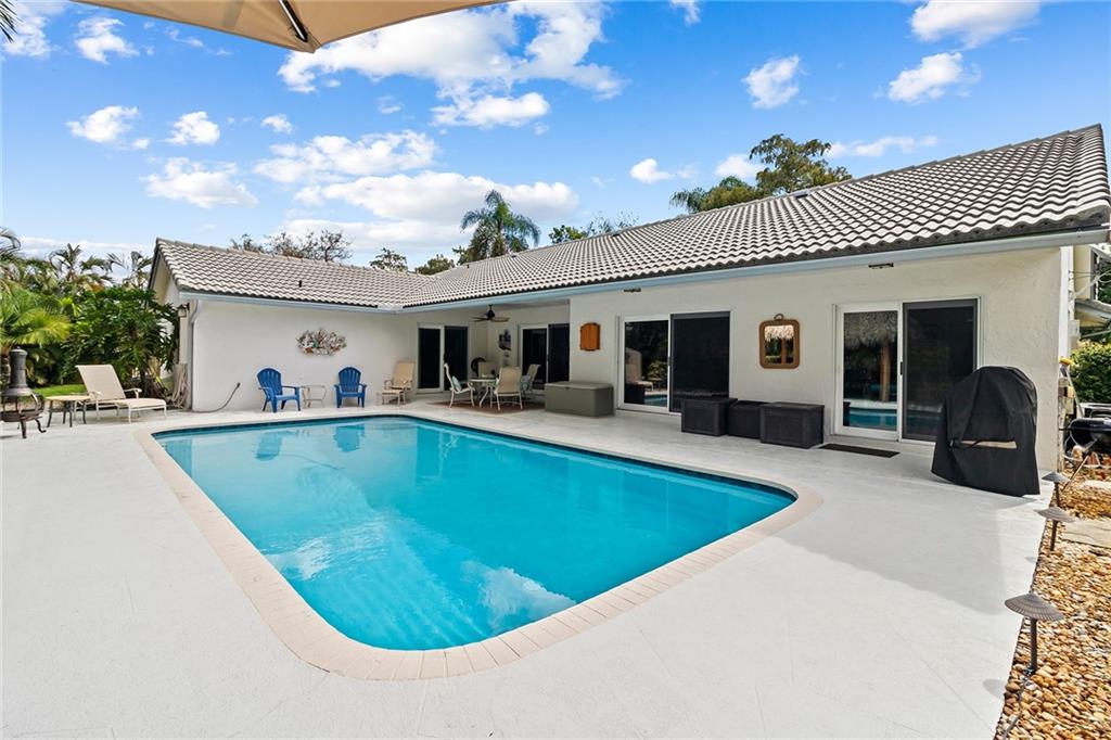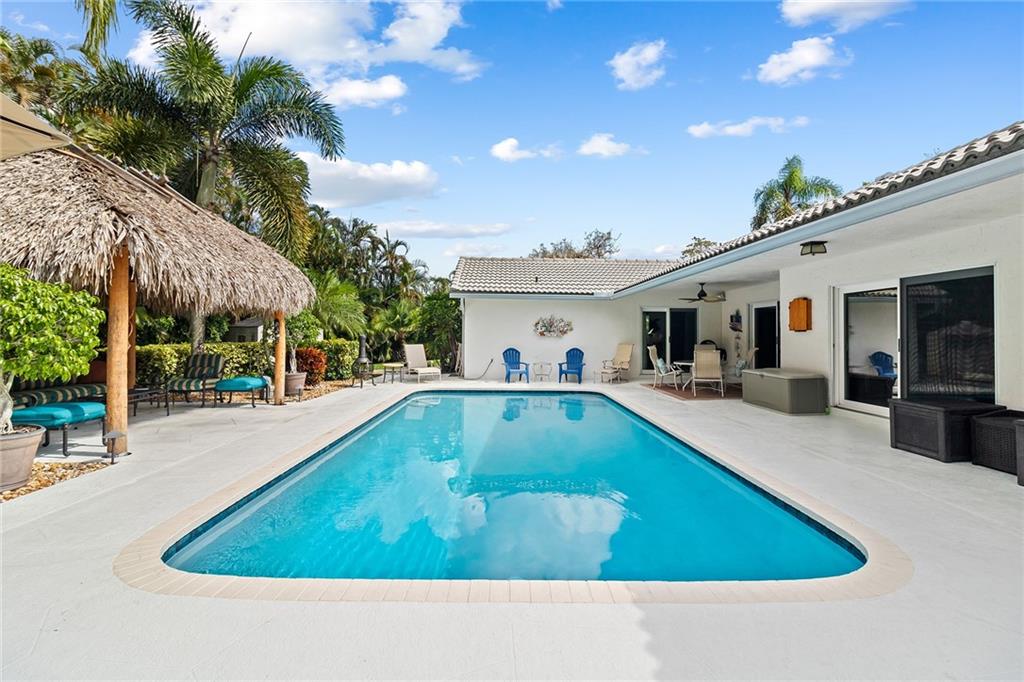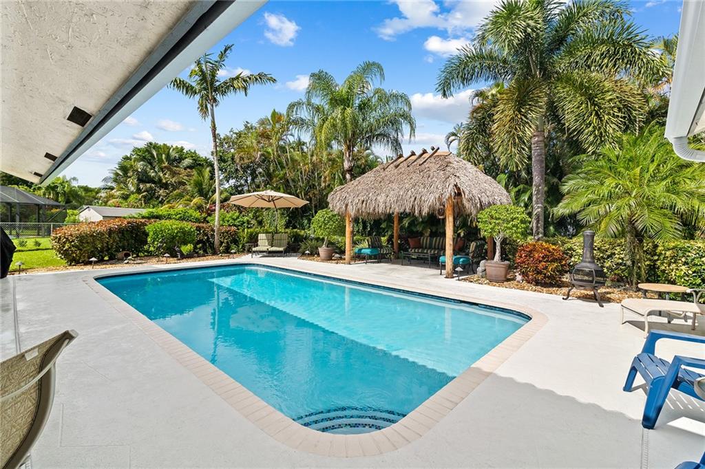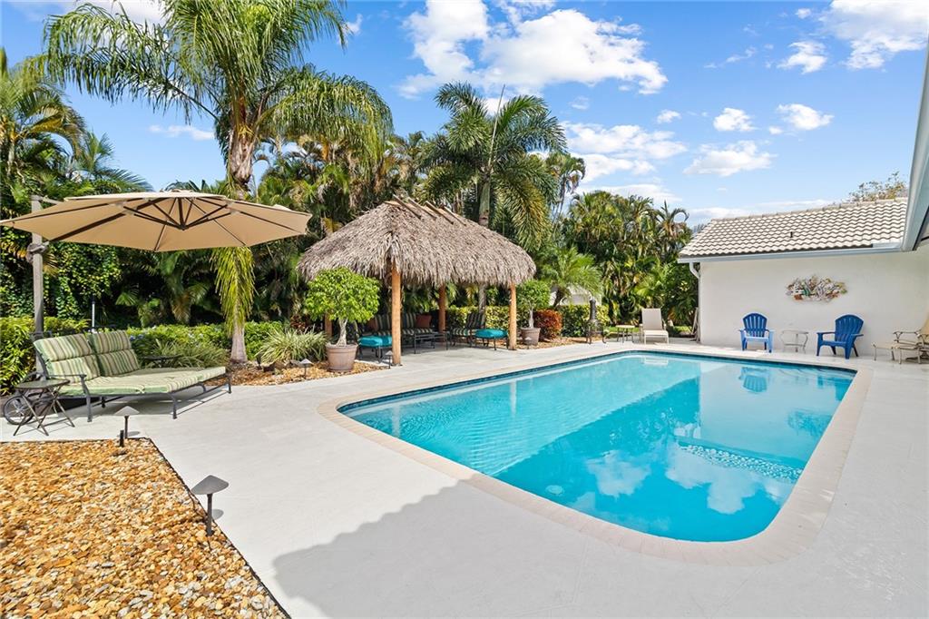 Highly desirable Ramblewood area pool home, 2cg -remodeled with a tropical/resort style and a very private 13, 631 sq ft manicured pie lot with 168 ft wide back yard full of greenery! Tiki hut and extended patio deck surround the oversized heated 30x15 pool which was remarcited in 2022. Updated designer kitchen and baths include stainless steel high-end appliances. New central ac 2017. Double pane argon filled hurricane windows with extra UV protection on the west and south sides. Custom base and crown molding throughout. Reverse osmosis filtration in the kitchen. 50 Amp car charging station in the garage. 6.5 kilowatt hurricane generator. Rust free sprinkler system. New tankless water heater 2021. Long time owners selling their private oasis. Very well maintained-move in condition!