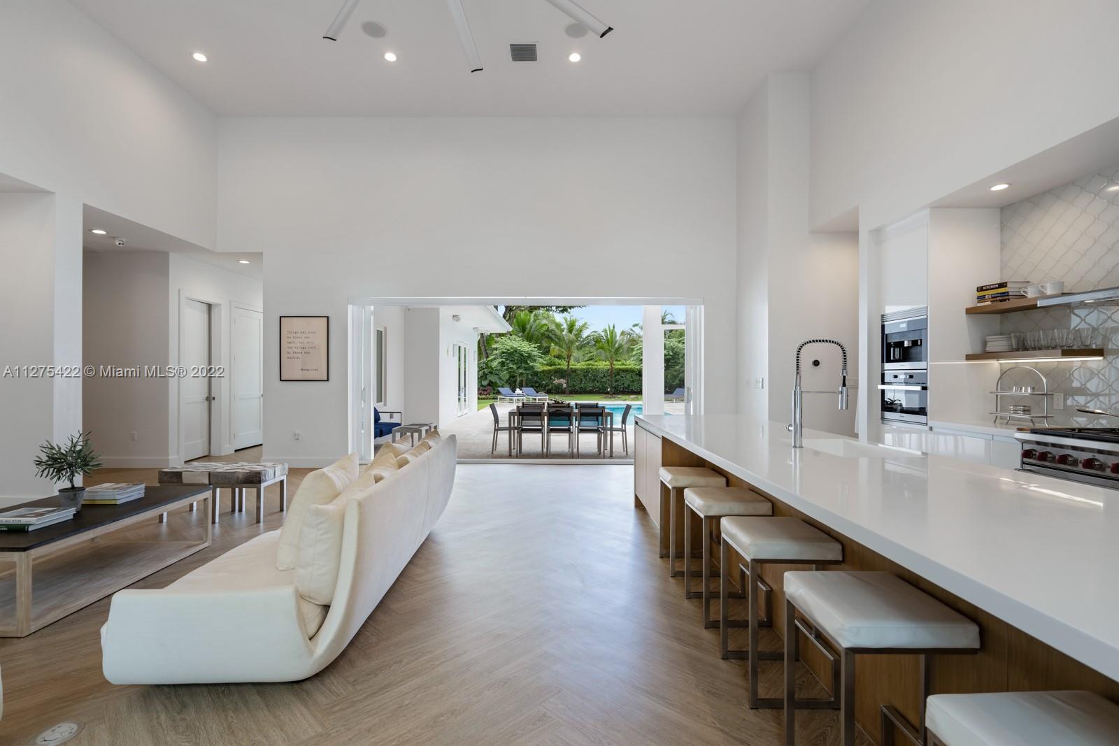 Modern luxury living at its best. Built in 2015 with exceptional attention to detail. Designed around dramatic 16' ceiling great room and Porcelanosa kitchen with 15' Krion waterfall island, top of the line appliances from Wolf Miele and Subzero. Excellent floor plan including downstairs master suite. Five-bedroom layout with den/gym that could easily work as sixth bedroom. Covered terrace with motorized mosquito screen, beautiful pool, large private back yard, summer kitchen and 3-car garage. Visser custom built closets and Sonos music system throughout. Set back in gated deep 28,314 sq ft lot with mature trees. This custom green home was built to LEED Silver certification standards. Full house generator. Great location – close to everything.