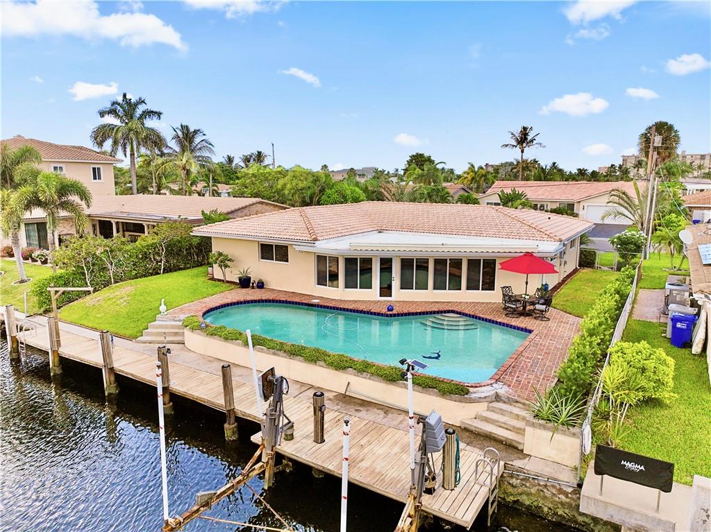 Waterfront home in Pompano Beach Isles with relaxing pool & canal views. 75ft of waterfront with dock. Situated on a dead end street with no through traffic, two homes in from the point. Easy access to intracoastal and Ocean. Circular driveway and a covered front porch leads you into this great home. The interior offers an open layout with multiple living/entertaining areas. Light & bright kitchen w/ tons of cabinets and counter space. Split bedroom floor plan offering comfort and privacy. Spacious primary bedroom with en-suite bathroom & walk-in closet. The two secondary bedrooms & updated guest bath are situated on the opposite side of the home. All impact windows & doors, updated electrical panels, 1 yr old pool pump, 1.5 car garage and much more.
