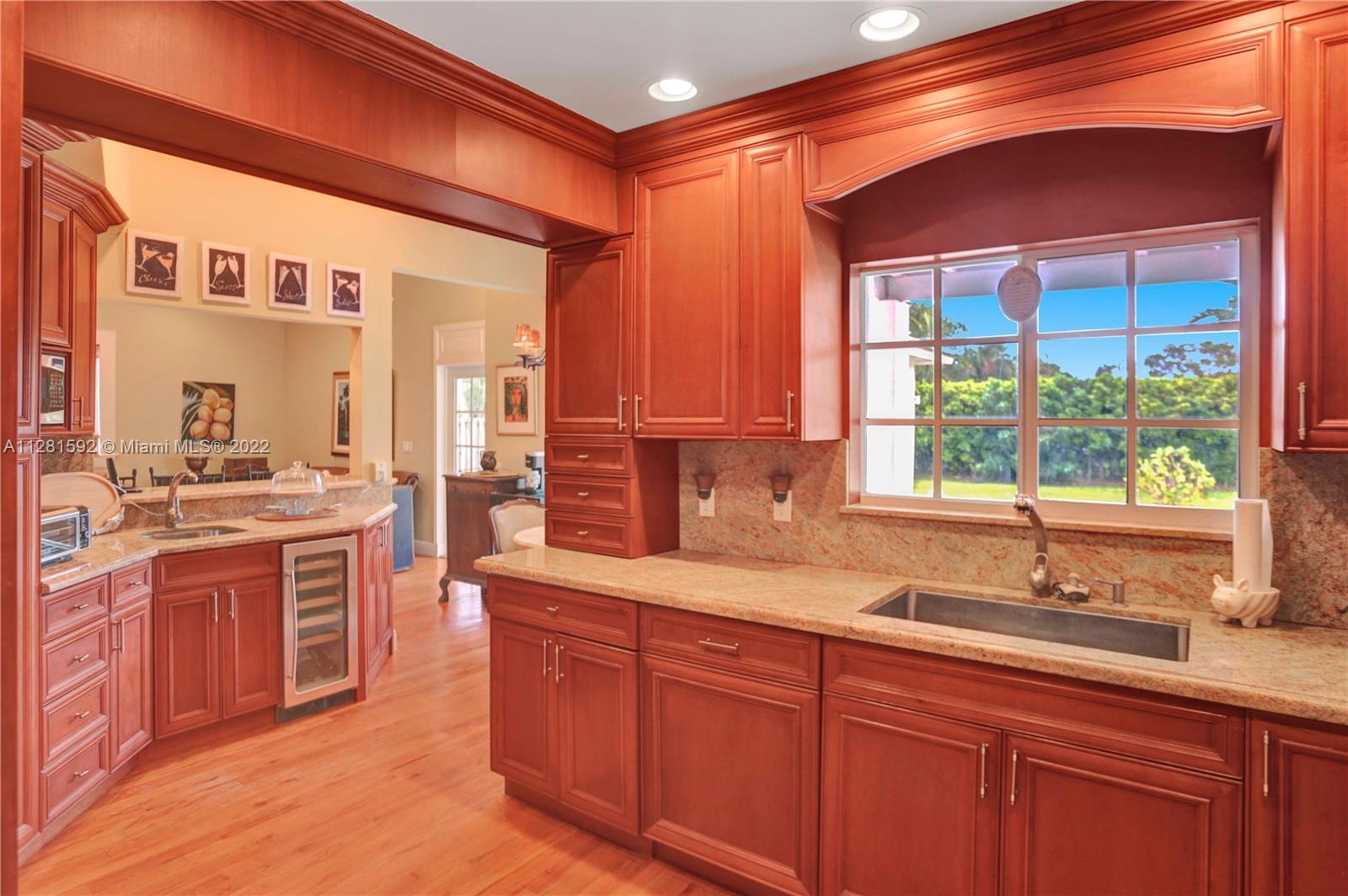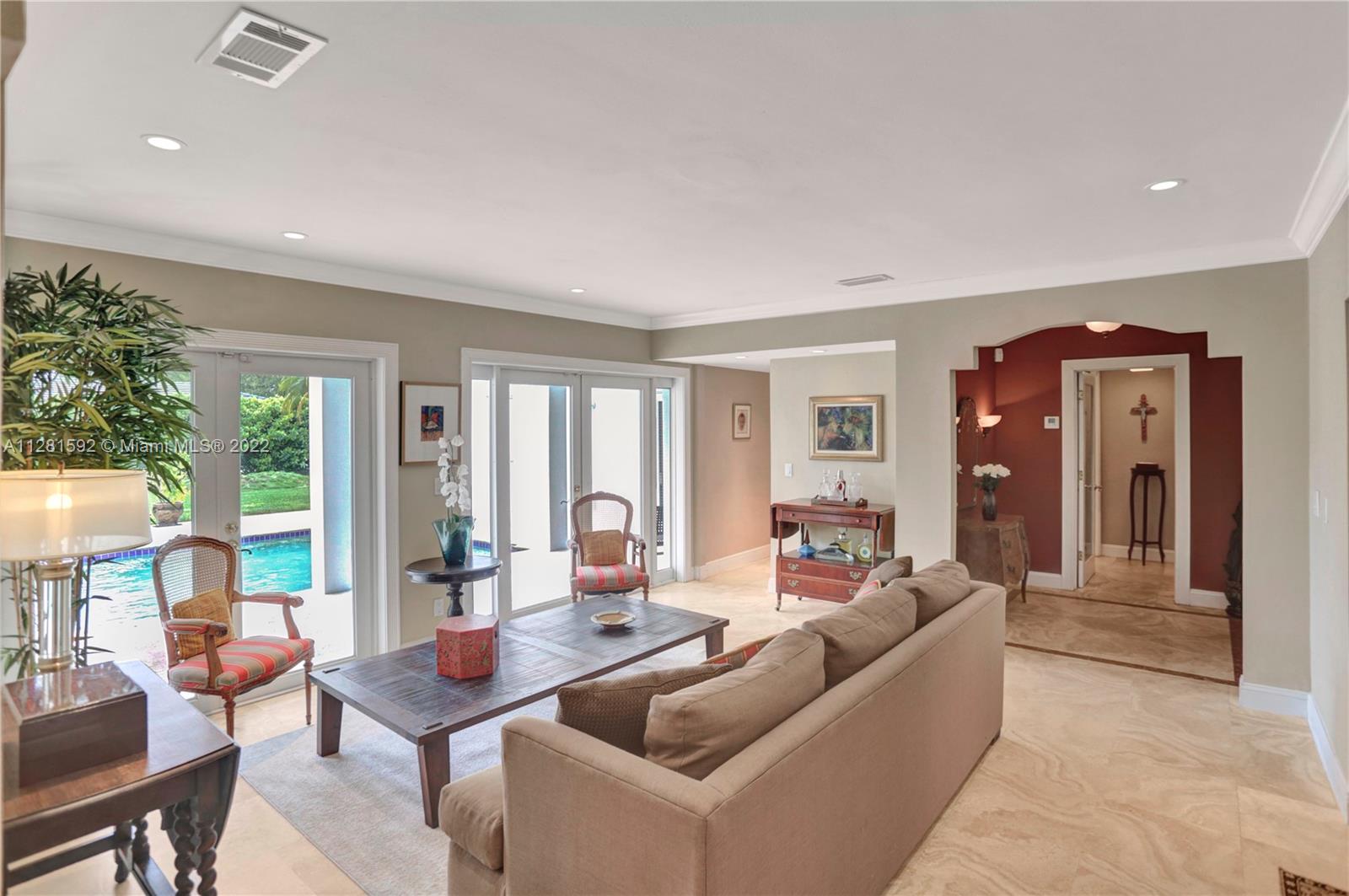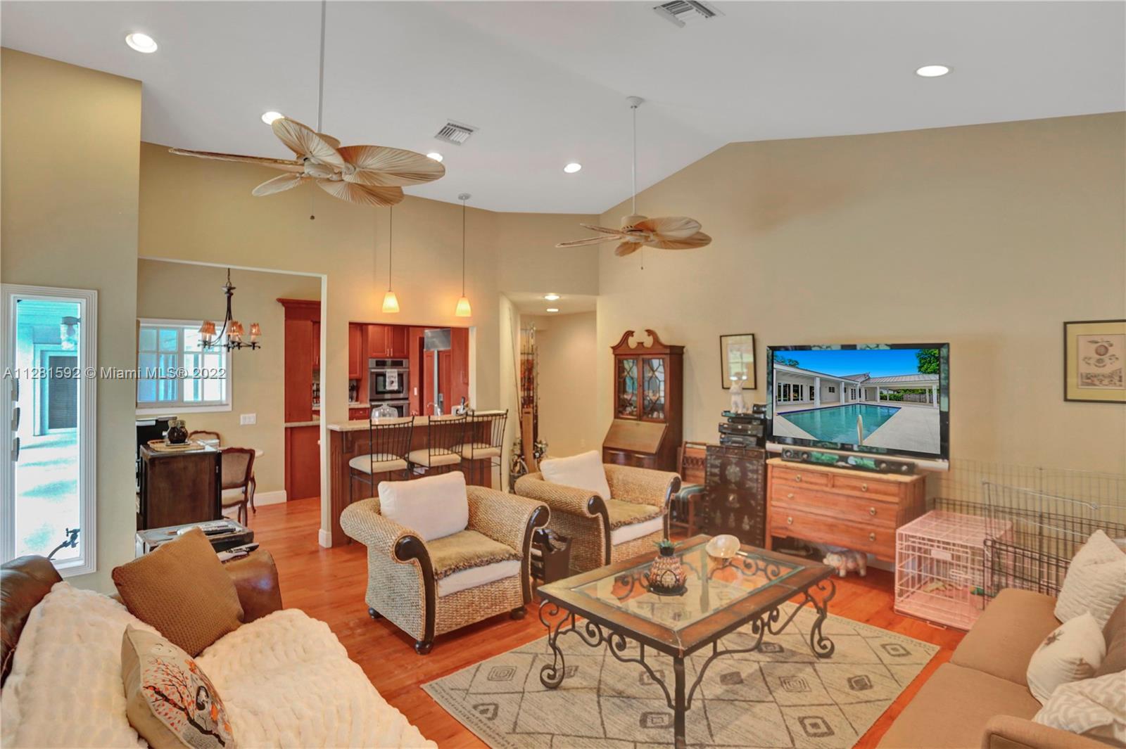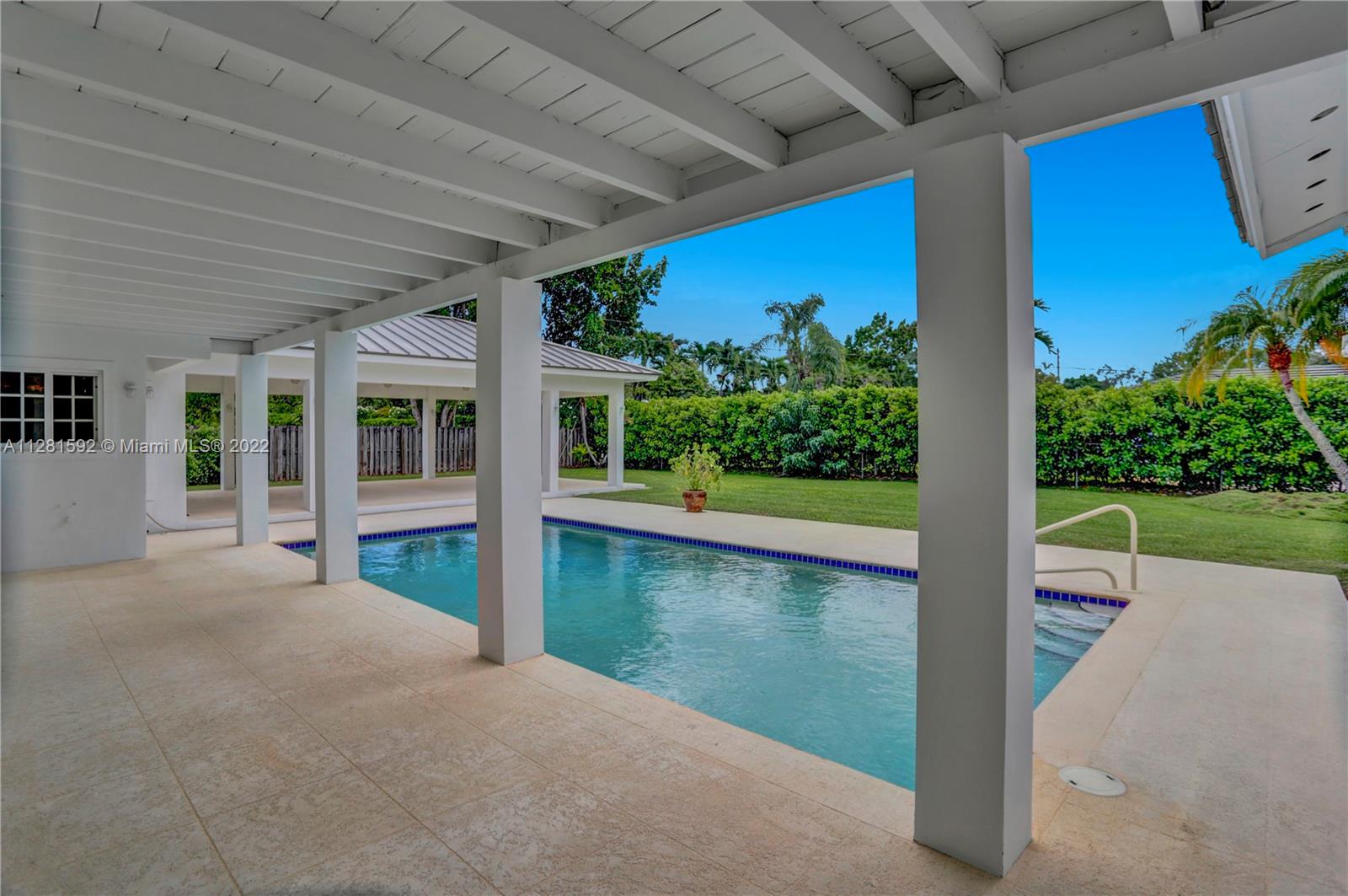 Drive down the tree-lined street in a prime section of Pinecrest to this beautiful home. This home has a wonderful floor plan with the kitchen open to the large family room. The family room has high, vaulted ceilings. There are lovely architectural details in the interior. The backyard is very private and features a large patio and a large, covered area that would be perfect for an outdoor kitchen. There is a sparkling pool and fenced yard. Home is located on a quiet corner lot with double-door gate on the side for ease of access to park a boat.