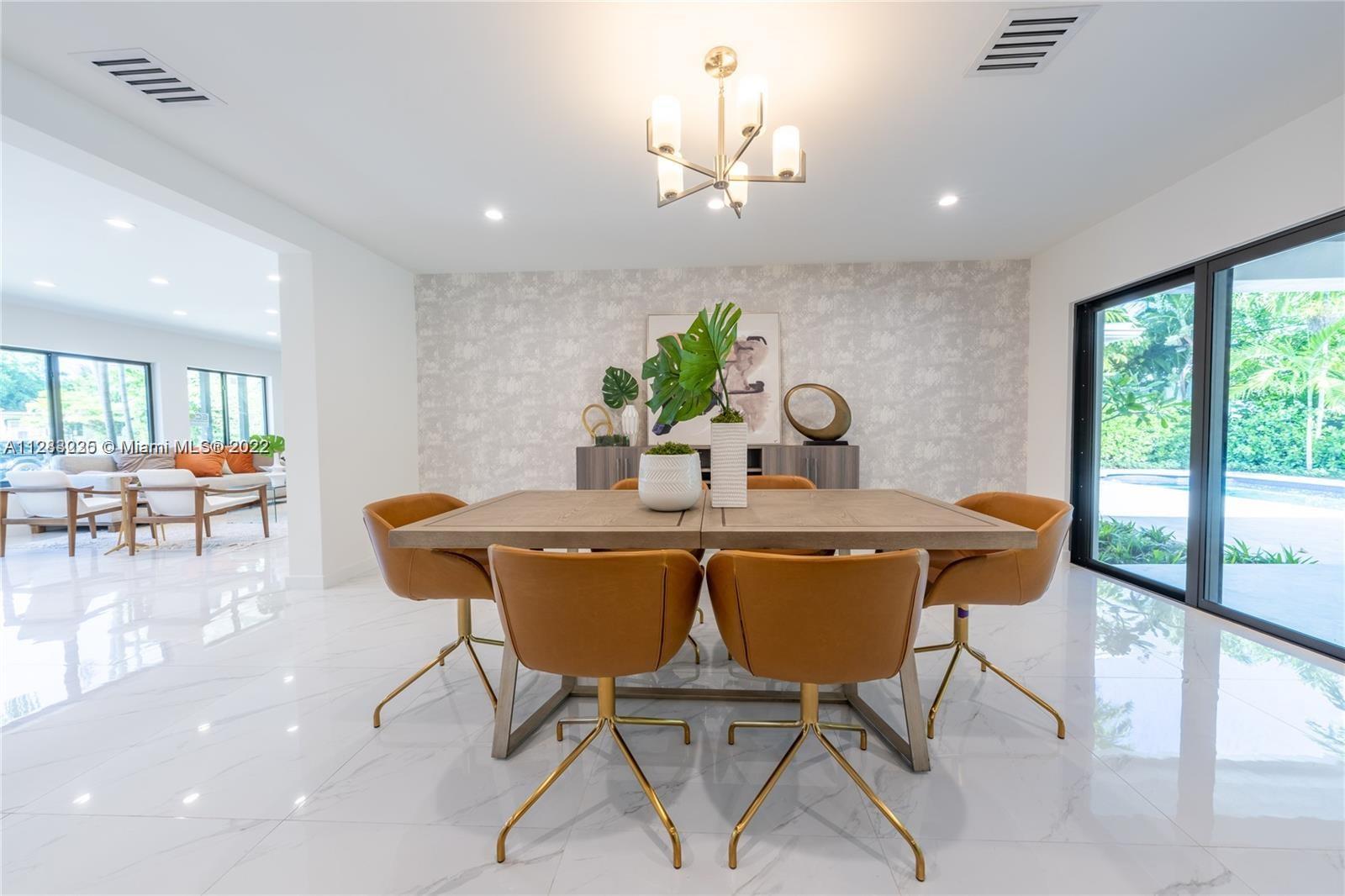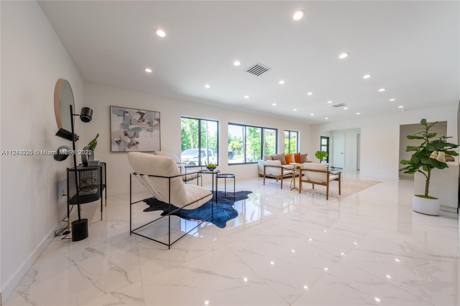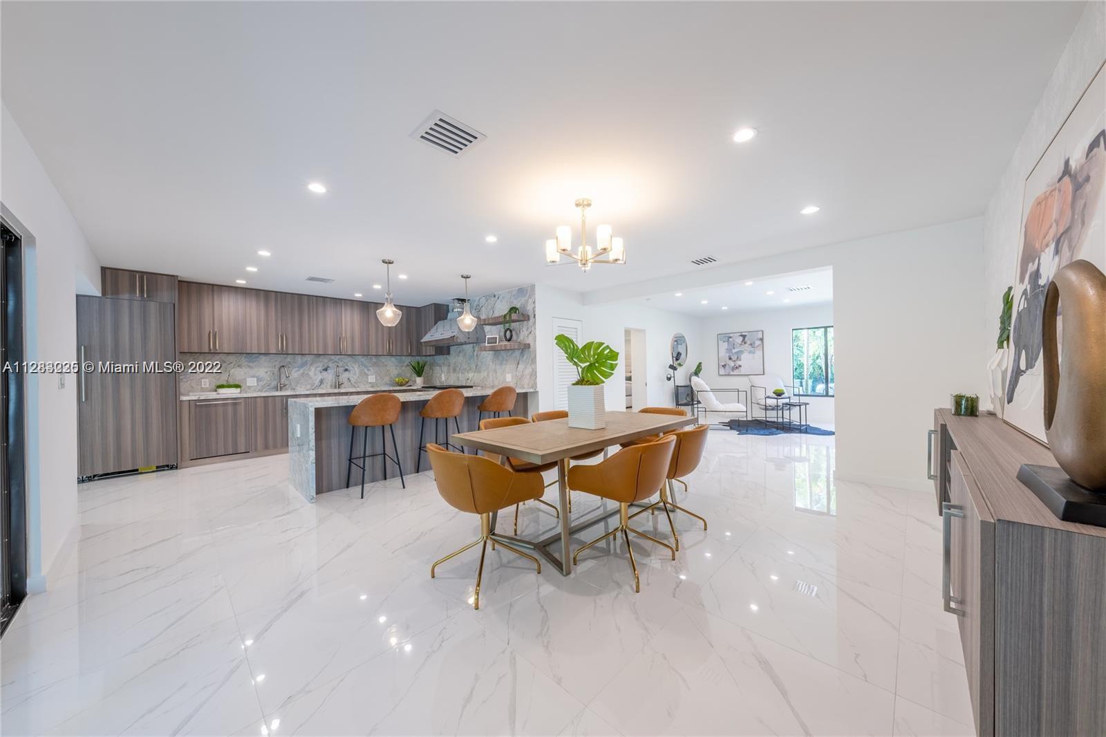 Fine design meets resort luxury with this beautifully redesigned Bay Harbor Islands home. Completed in July 2022, it features 4 bedrooms + a den and 4.5 bathrooms on an oversized 10,938 ft.² lot. The fabulous floorplan connects the generous living room, sun-filled dining room, and high-end open kitchen with rich wood cabinetry, quartzite stone countertops, and Wolf & Dacor appliances, including an oversized gas stove. Relax, refresh, and entertain in style with a new patio and saltwater pool surrounded by lush palms. The home has high-impact windows & doors, new plumbing & electric, gas water heater & dryer, and a control 4 smart home system. Living area is 3,324 Sq.Ft