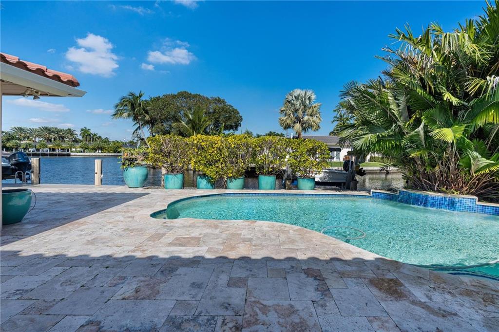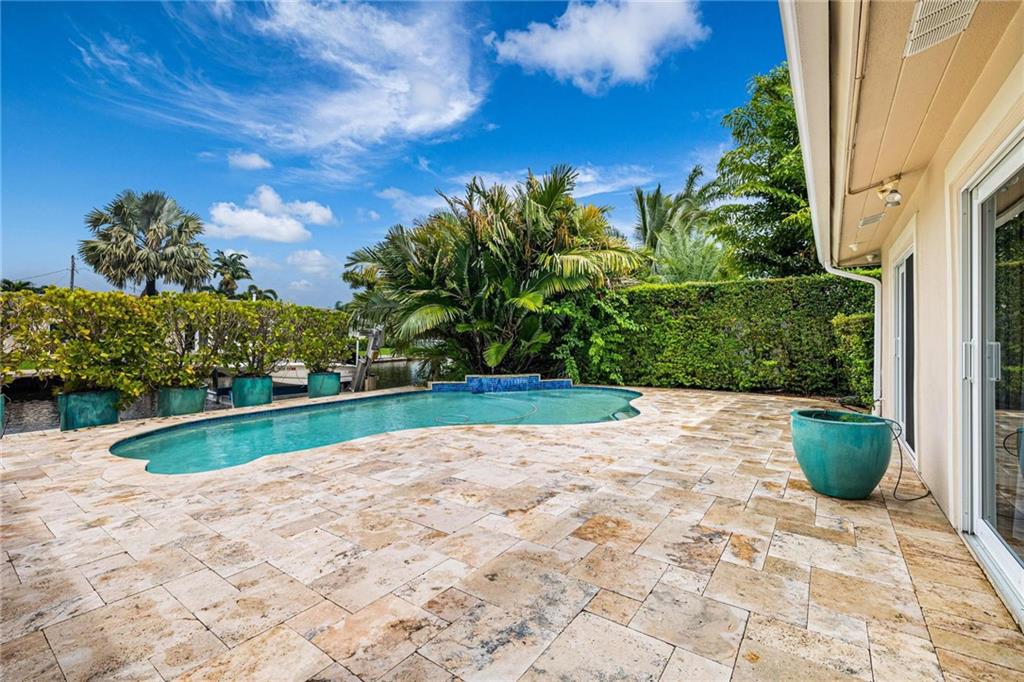 Live a dream life on Poinsettia Dr in E. Ft Lauderdale. This resort-style, ocean access, riverfront, pool home features a total of 4 beds 3 baths with a large open living room in a split floor plan. As a bonus, one bed & bath are in a rare, permitted, enclosed-garage, guest house. The separate entrance guest house includes its own TV room & kitchen. Perfect for visitors, in-laws, or potential rental income. This property boasts lush landscaping, large boat dock, Golden-brand boat lift, spacious main kitchen with Sub-Zero Refrigerator, Dacor oven & microwave, and Bosch dishwasher, Turkish marble floors throughout home and guest suite, granite counter tops, tumbled travertine pavers in front & back, irrigation system, updated electrical system, Impact PPG sliders/windows, & Euro Tech Doors.
