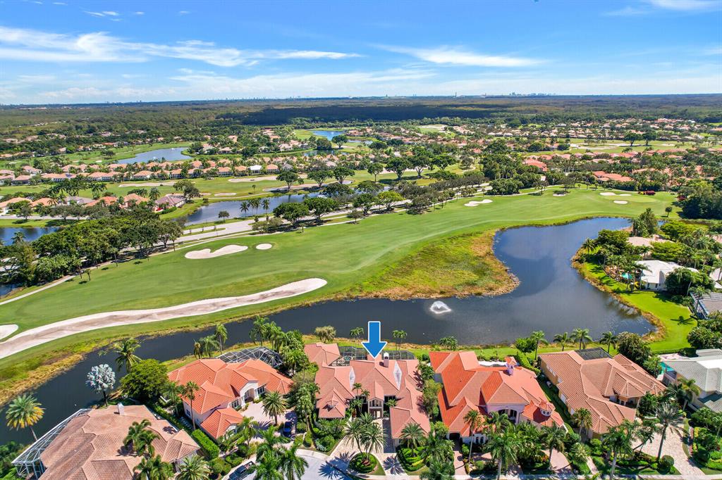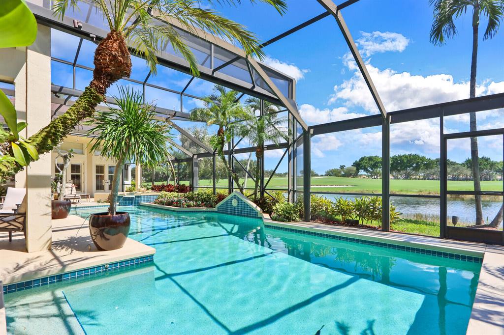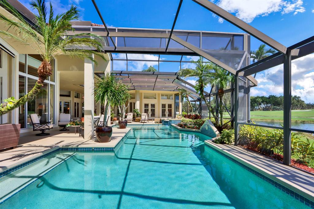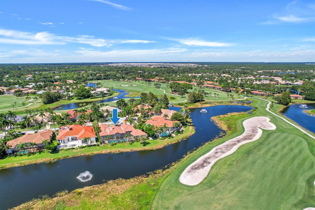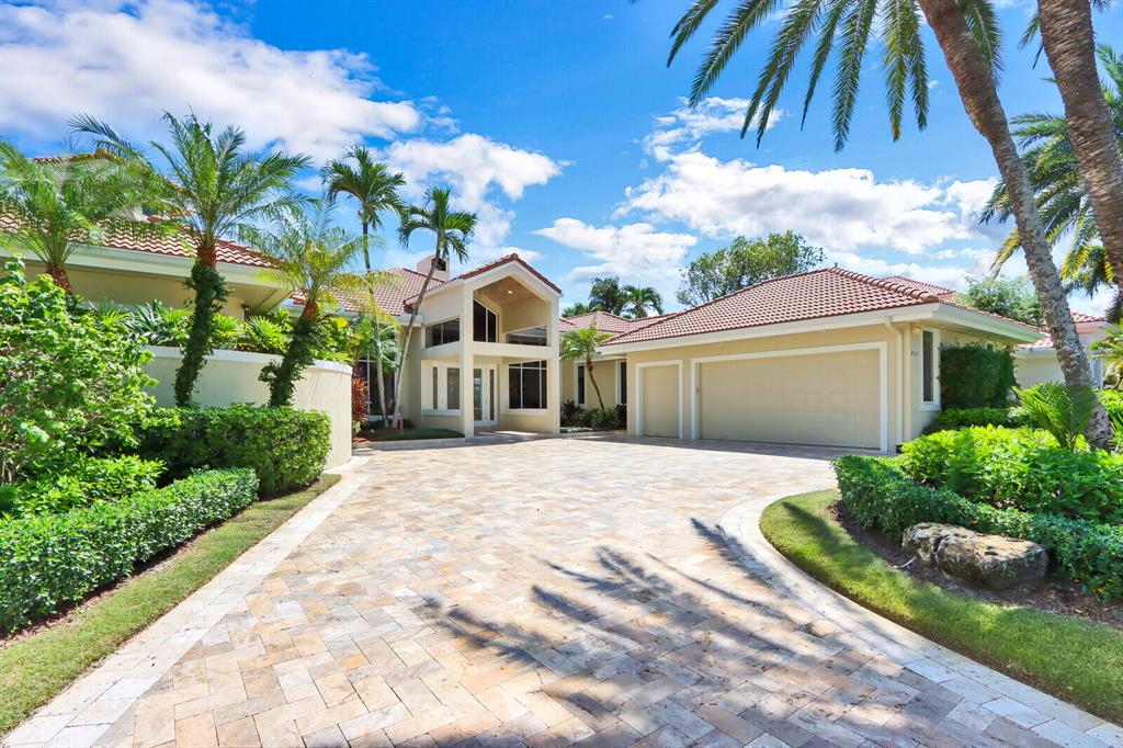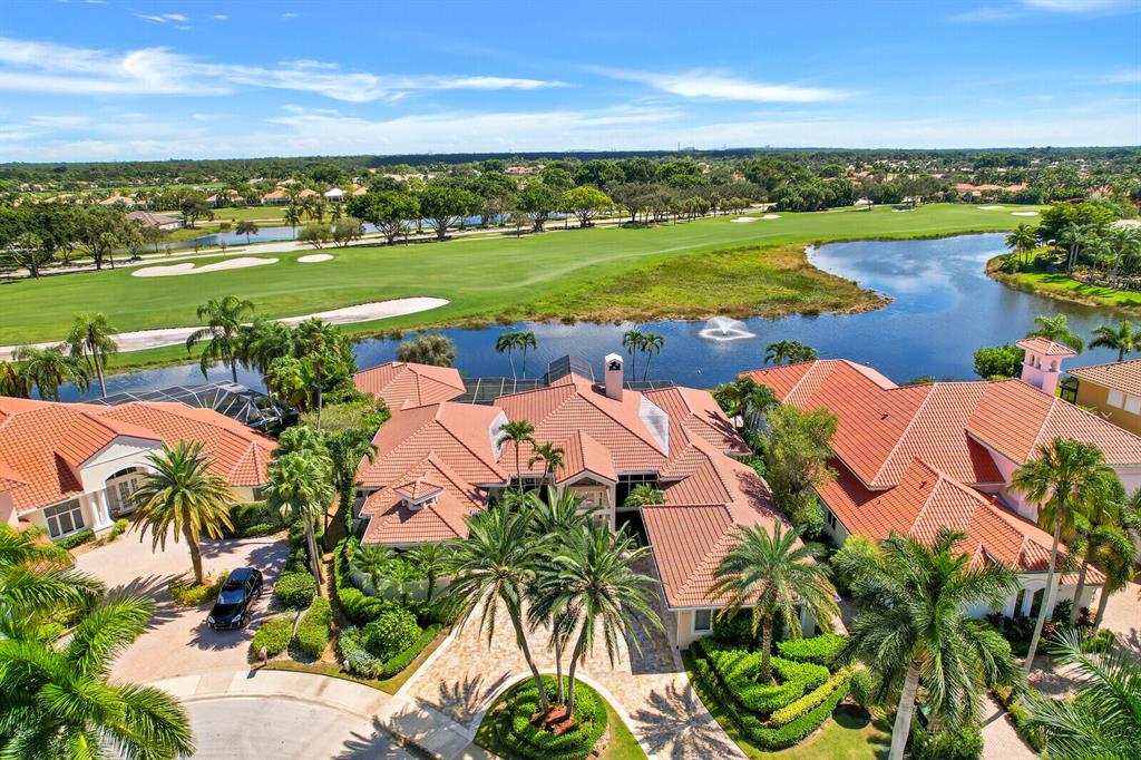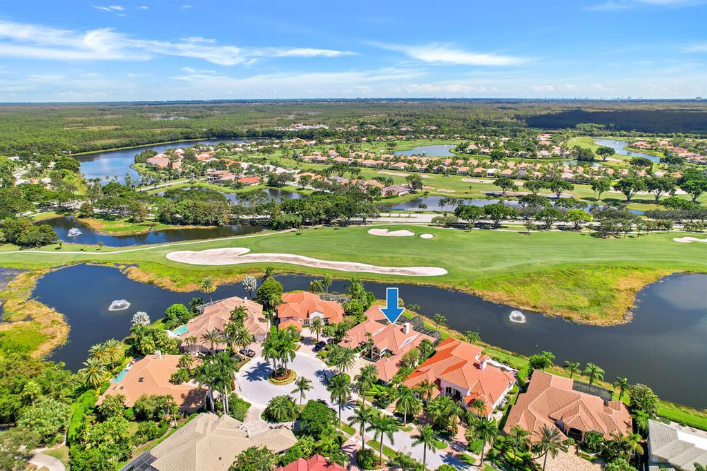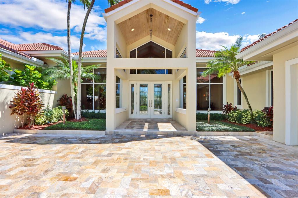 Prime CUL-DE-SAC location in desirable Egret Meadow with BREATHTAKING WATER AND GOLF VISTAS of the Jack Nicklaus-designed 8th fairway of the Legend course. This magnificent custom contemporary home is an ARCHITECTURAL MASTERPIECE harmoniously integrating the best of indoor and outdoor Florida living. From the herringbone pattern travertine driveway, you'll appreciate the custom, one-of-a-kind feel of this unique home. A dramatic vaulted front porch ceiling with wood accents welcomes you, and the design feature continues inside, into the WOW-foyer and over-the-top living room that looks like it could be a lobby for a tropical resort.