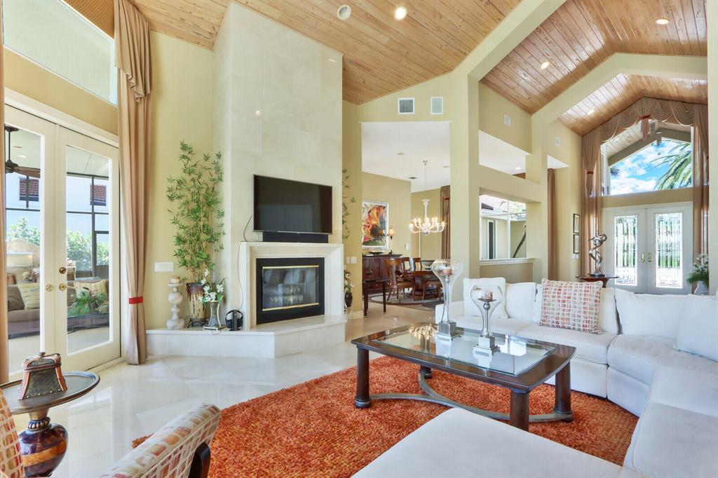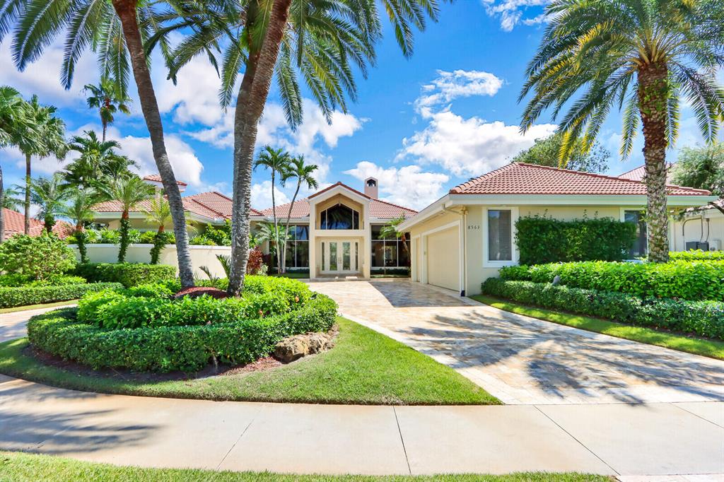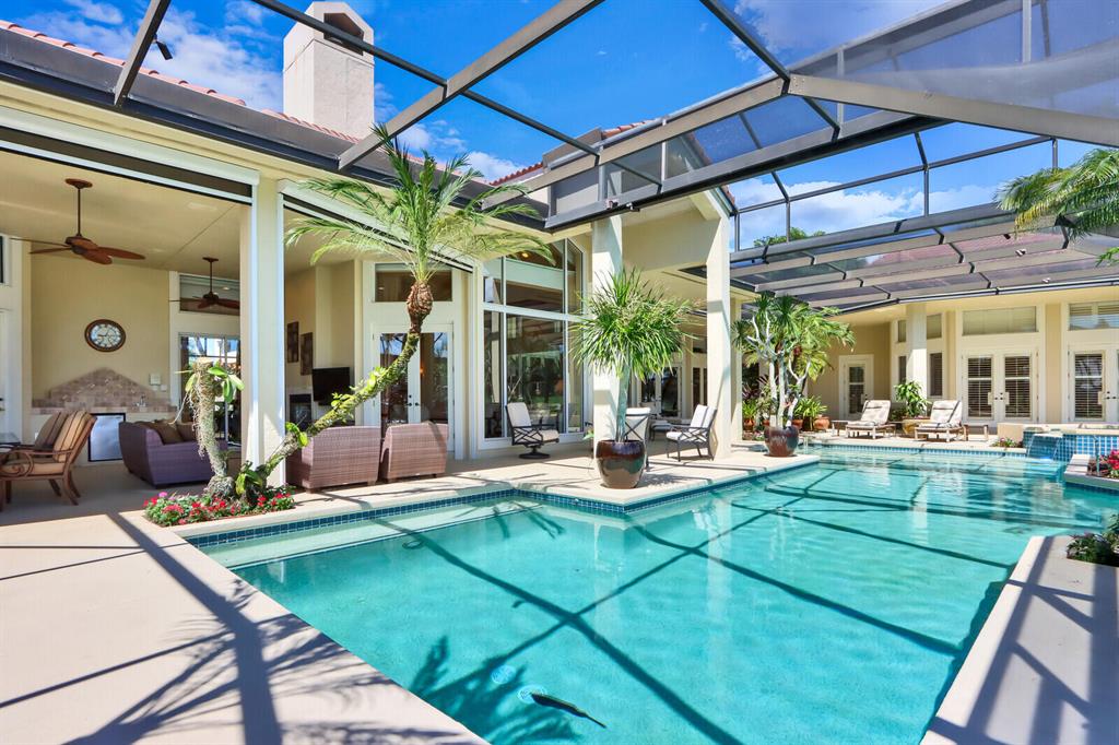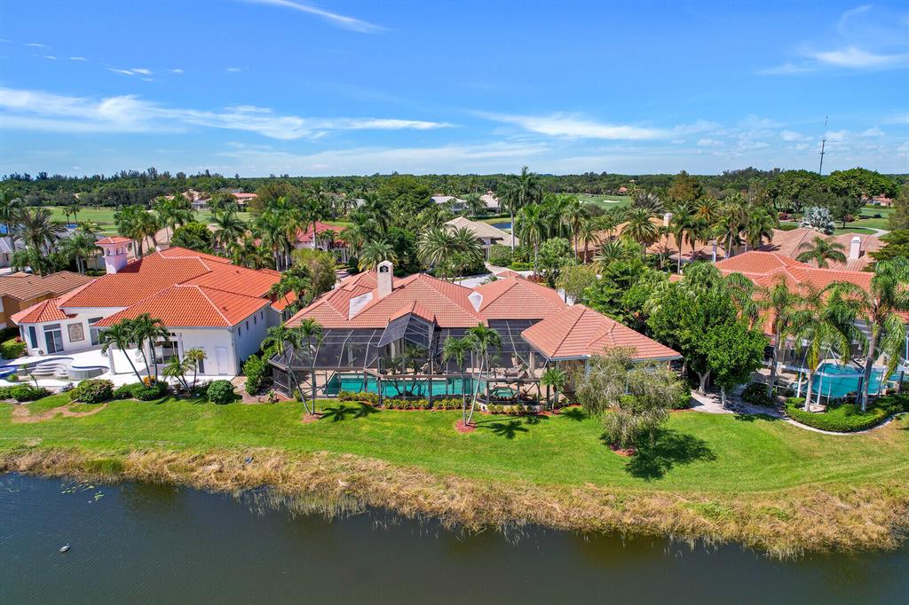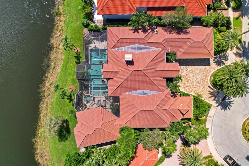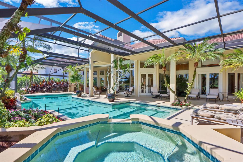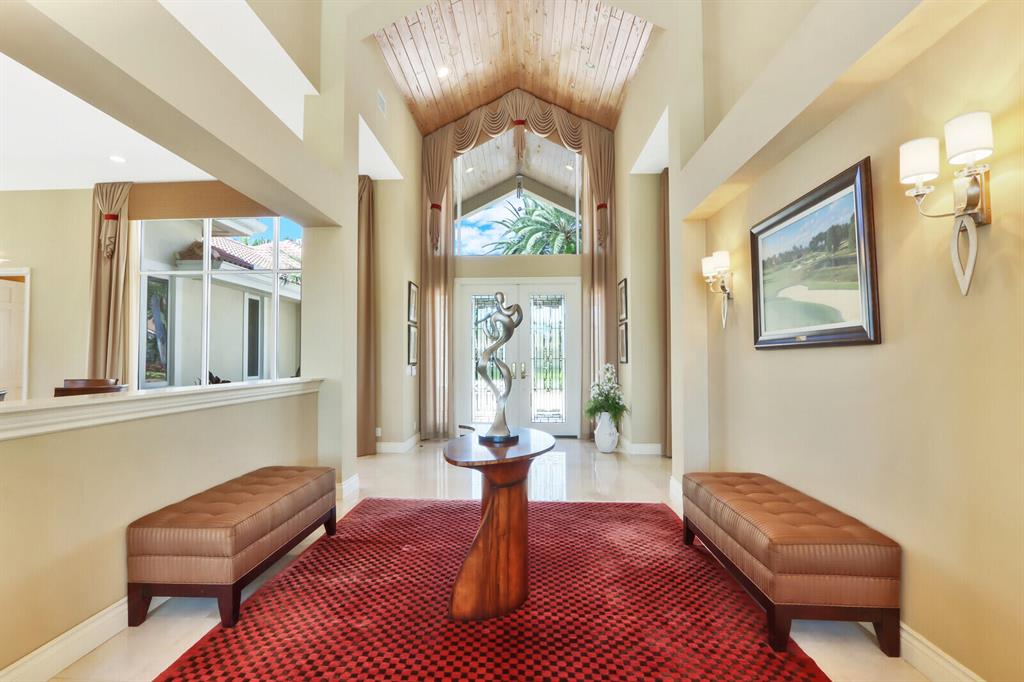 Prime CUL-DE-SAC location in desirable Egret Meadow with BREATHTAKING WATER AND GOLF VISTAS of the Jack Nicklaus-designed 8th fairway of the Legend course. This magnificent custom contemporary home is an ARCHITECTURAL MASTERPIECE harmoniously integrating the best of indoor and outdoor Florida living. From the herringbone pattern travertine driveway, you'll appreciate the custom, one-of-a-kind feel of this unique home. A dramatic vaulted front porch ceiling with wood accents welcomes you, and the design feature continues inside, into the WOW-foyer and over-the-top living room that looks like it could be a lobby for a tropical resort.