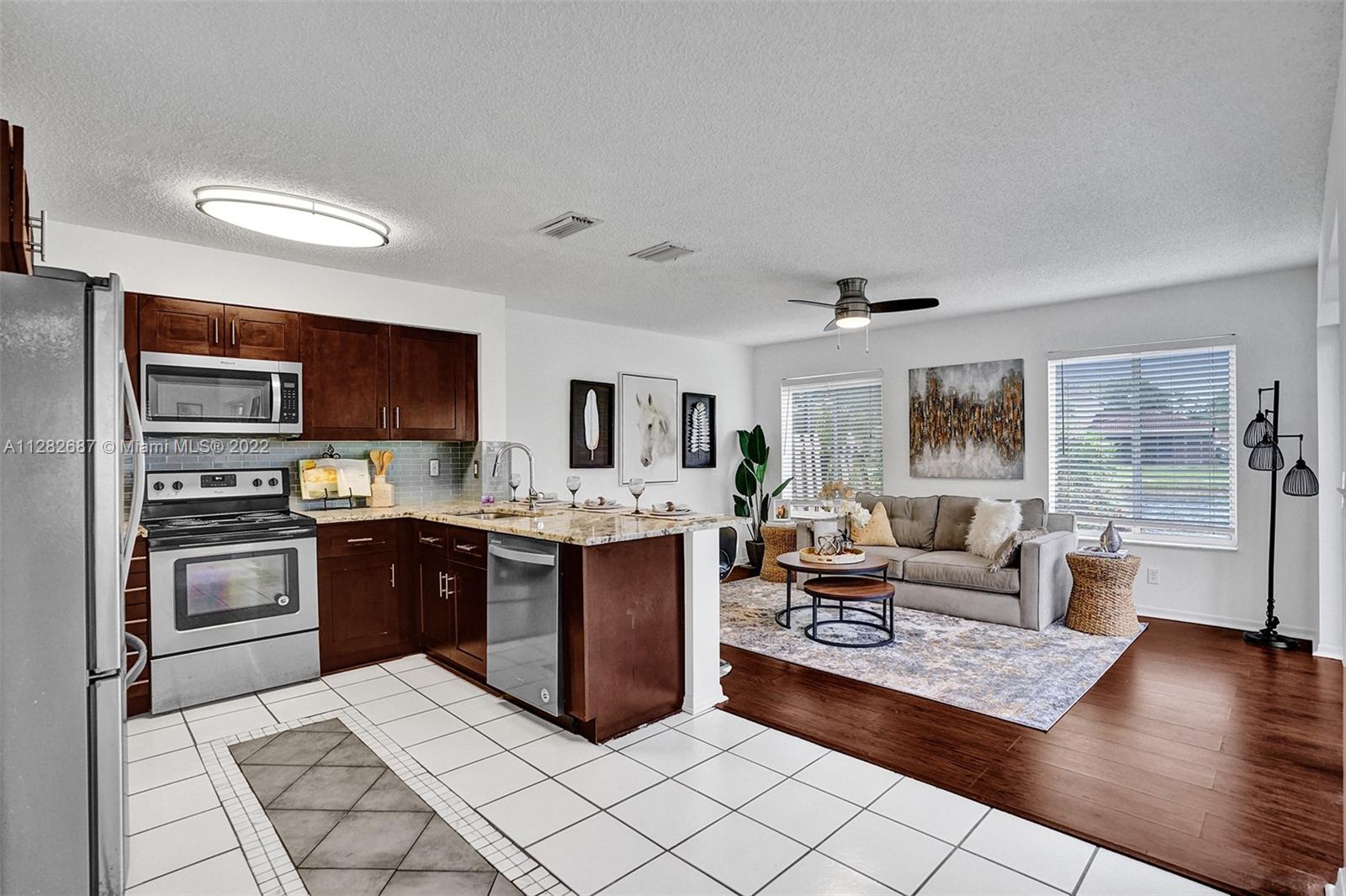 Looking for a place to call home, where you will actually meet your neighbors and children still play outside, then welcome to The Village at Harmony Lake !!! Spacious 4 bed, 2.5 bath townhome in Davie over 1800 sqft w/garage. Located on quiet cul de sac with peaceful water views & screened porch. This light and bright unit features upgraded granite kitchen and stainless steel appliances with breakfast bar overlooking large family room with water views. The dining room accesses the screened porch, perfect for family barbecues! Large master suite with updated bathroom and walk-in closet. Newer laminate flooring in all bedrooms. New A/C. Hurricane shutters in garage. Low HOA $472 quarterly. Community pool and playground. Superior schools. A pet friendly community perfect for your family!