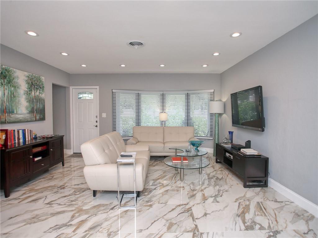 Beautifully remodeled 3/3 Single Family Home. A contemporary design thru-out w/36x24 tiled floors in main living areas & laminate in all bedrooms. Quartz counter tops, hardwood cabinets & SS appliances in kitchen. Granite topped vanities w/hardwood cabinets in all bathrooms. Chrome light fixtures & all new impact windows & doors. Updated electrical panel & pvc pipes replace original cast iron pipes. Double master bedrooms when garage was converted to living space. Large laundry/storage room & all appliances less than 2 yrs old including hot water heater. Main roof & A/C replace in 2014 & flat roof recently seal coated w/7 year warranty. Lushly landscaped yard w/irrigation system & private fenced back yard w/huge shed & plenty of room for a pool. Pine Crest Private School across the street.
