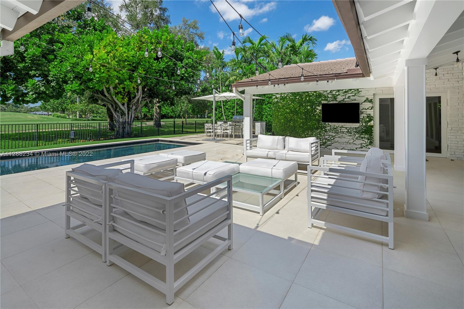Situated on one of the most gorgeous streets in the original George Merrick Pioneer Village. Perfectly positioned on the 15th hole of the Riviera Golf Course with breathtaking views. The 2016 home remodel included replacement of roof, electric, plumbing, and all interior and exterior finishes. Open concept floor plan with living and dining room, cohesive to family room and kitchen area features pre-wired Sonos sound system, gas fireplace and high ceilings – prime for entertaining family and friends. Stunning views from your backyard terrace is complete with plenty of space for lounging and hanging out by the heated salt-water pool. Built-in Summer kitchen with barbecue, ice maker and beverage refrigerator. This is a fabulous opportunity to own a house on the coveted Santa Maria Street.