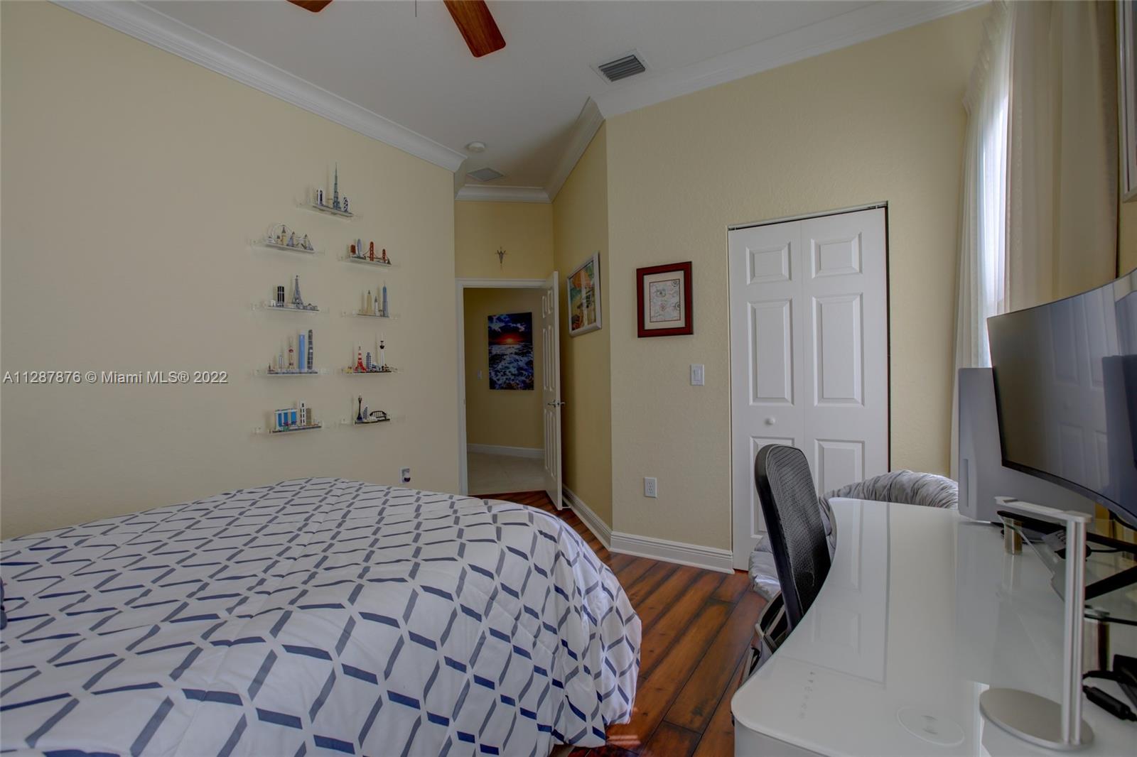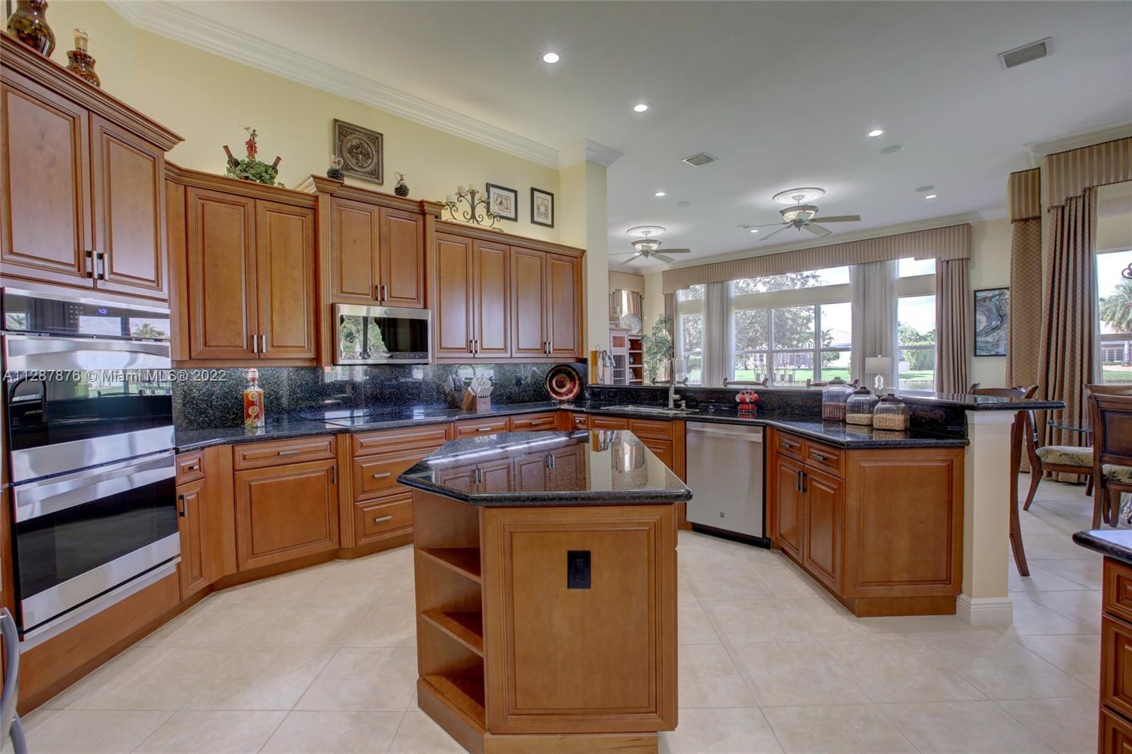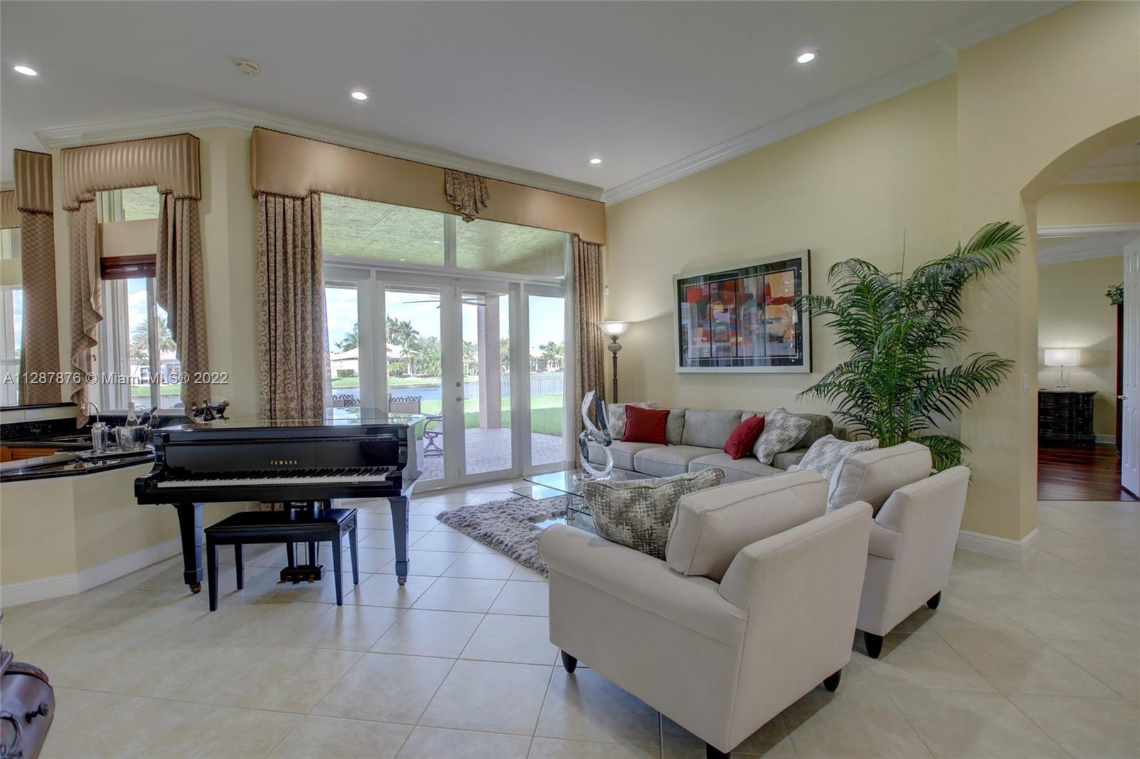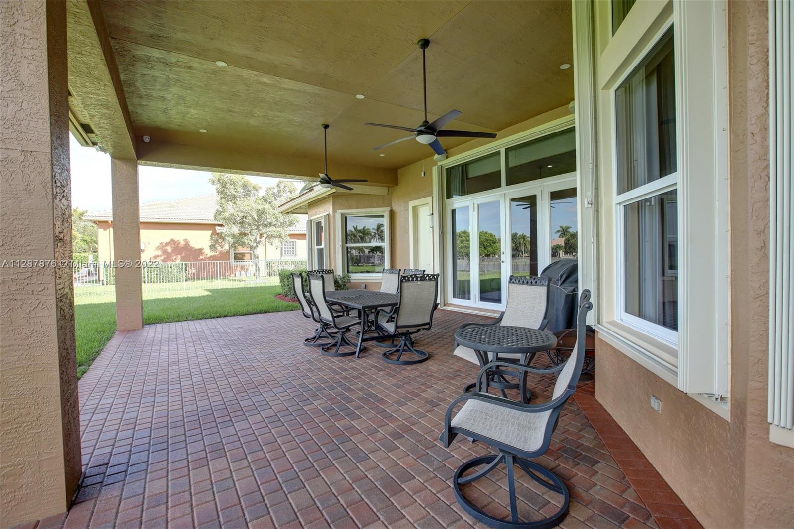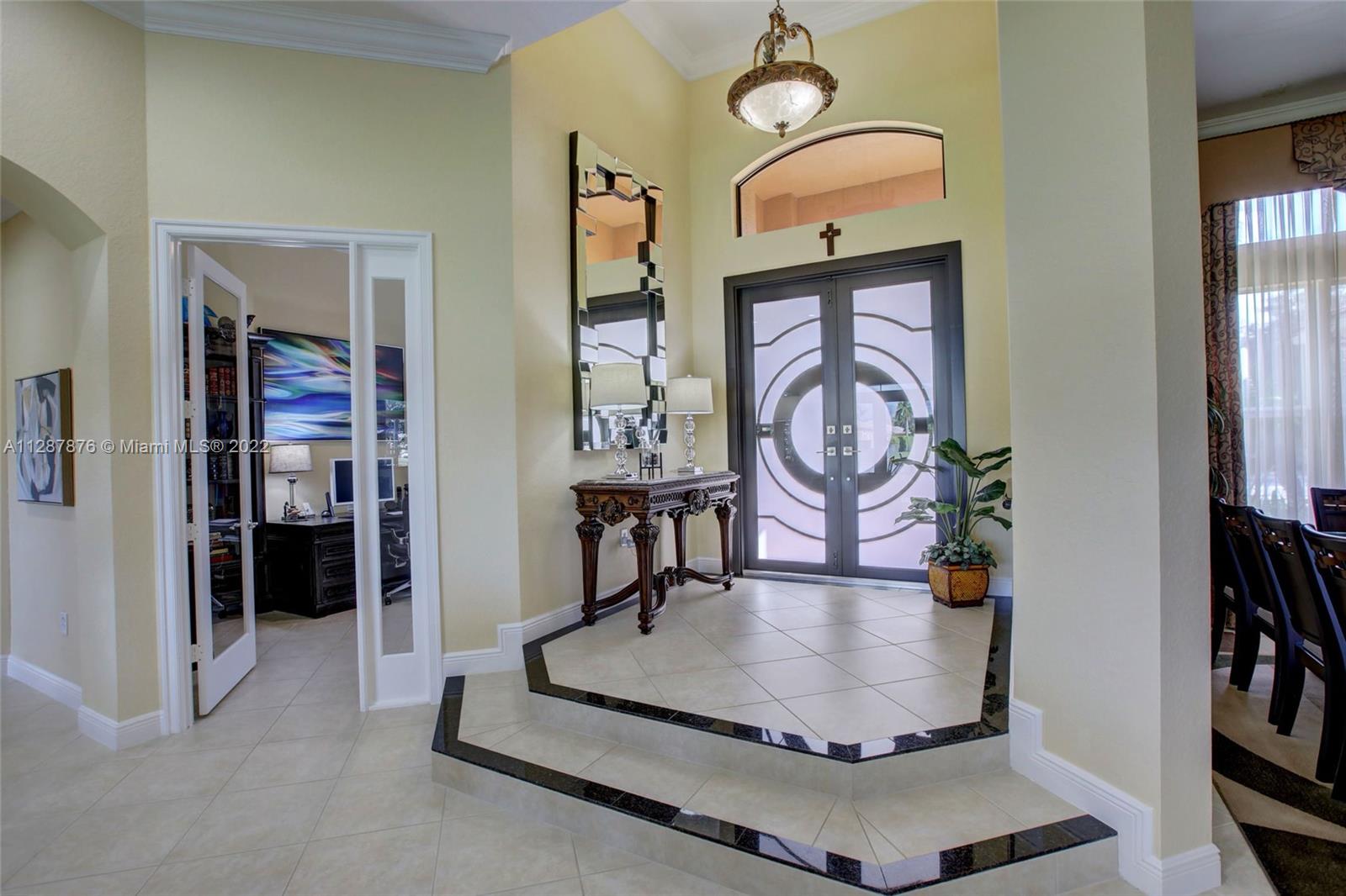 One of the largest open concept 1 story homes on water in the 24hr Gated Community of Riverstone on Cul-de-sac. Complete Impact windows & Doors in 2019 (spent $100k+) Tall 12ft volume Ceilings, Split Plan, Large Gourmet Granite & Wood Kitchen w/upgraded lighting, Center Island & modern fixtures. Bar & Wet Bar w/wine cooler, New GE appliances 2016, New Fridge 2020. 3 New UV AC Units 2019. Custom Closets, 4k security system, wifi/smart thermostats/lights/garage doors, Upgraded Garage. 2nd bed has ensuite bath, 3rd & 4th Bed share hall bath w/ dual sinks, 5th bed is office. 4th full bath is cabana style, perfect for guests. Enormous Covered Patio for entertaining, Room for a pool. No flood zone. Community Pavilion w/Tennis & Basketball, jogging path, 3 playgrounds, alarm included in HOA.