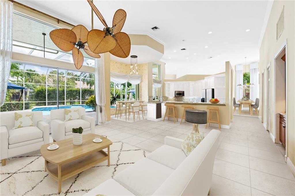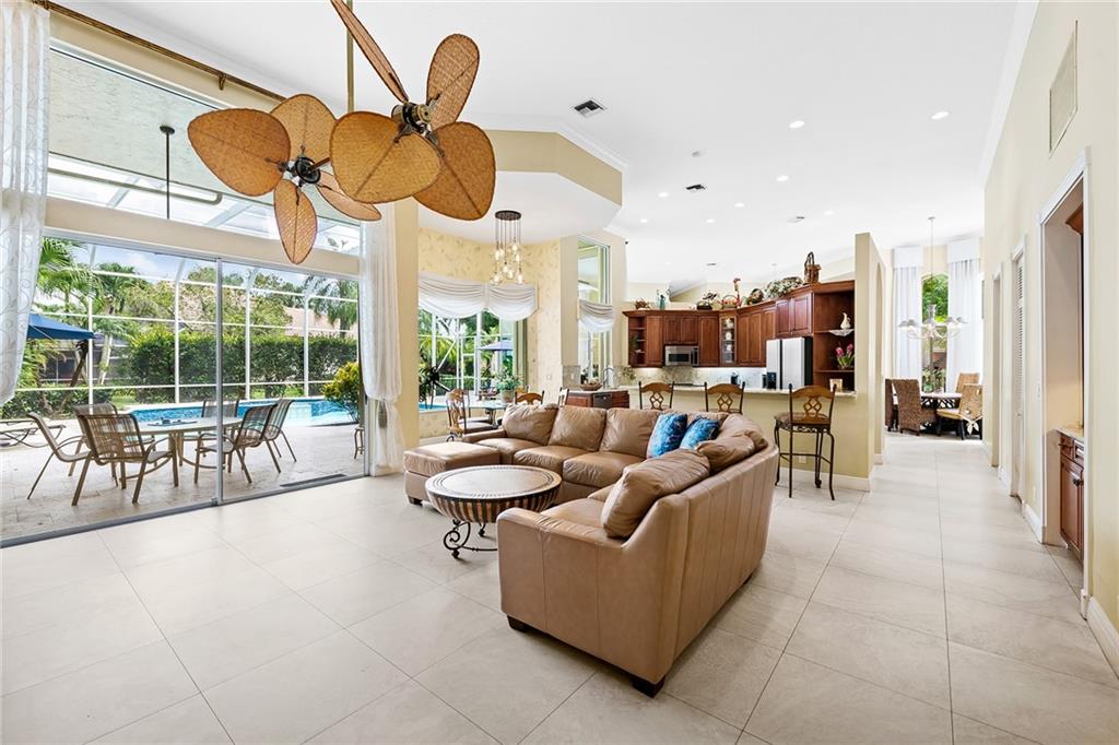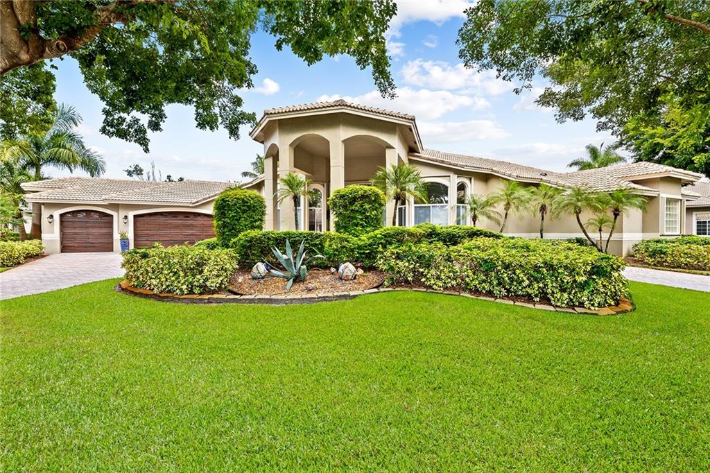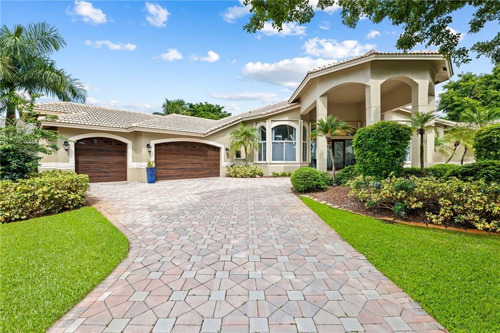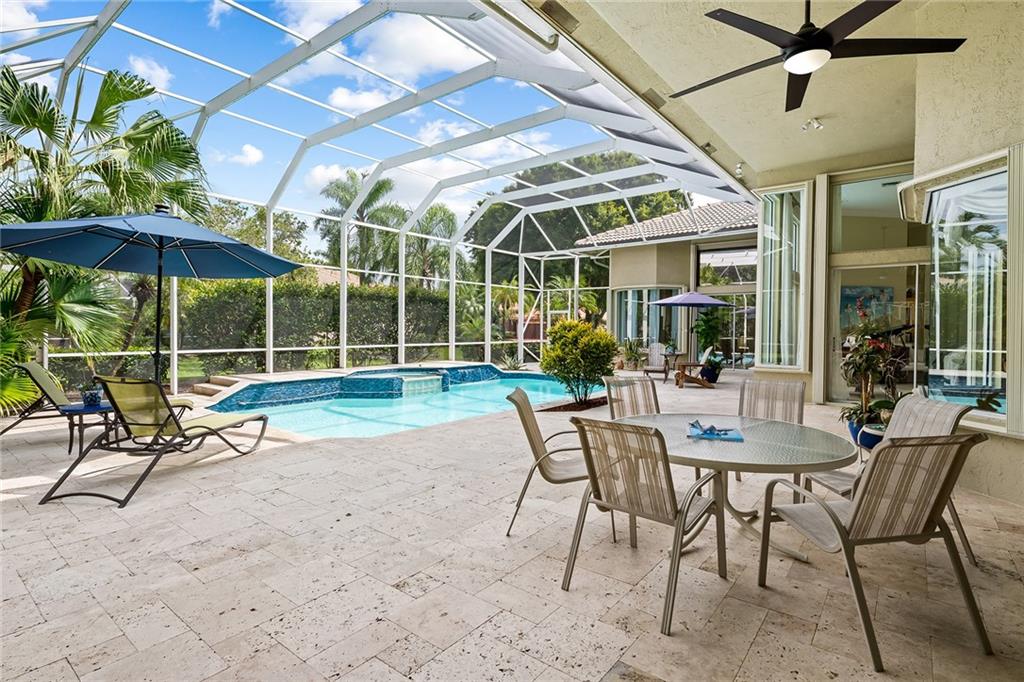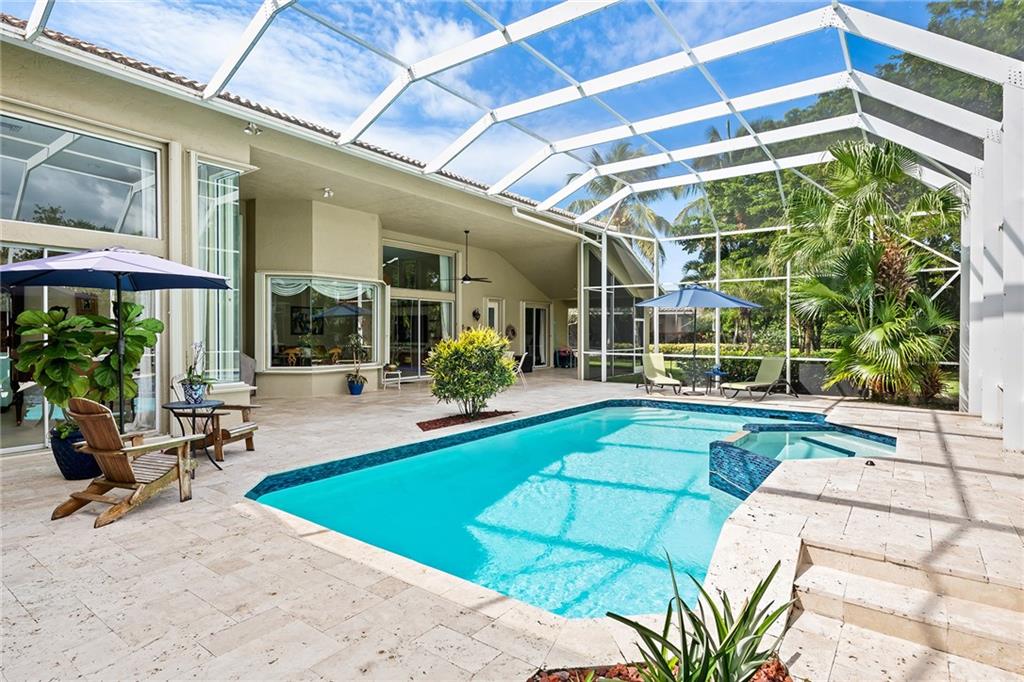 Located in prestigious gated Eagle Trace. Pristine updated home located on an oversized lot in the Greens features five bedrooms, four bathrooms,(5th BR used as office),paver circular driveway with an elegant porte-cochere entrance,three car garage and hurricane protection. You will feel at home the moment you enter this exceptional property with volume ceilings,open bright and spacious living room,dining room,family room w/built in wet bar overlooking a chefs kitchen with eating area,counter seating,granite counter tops,SS appliances,plenty of cabinets & a roomy walk in pantry. Enjoy the outdoor luxury lifestyle this home offers with an oversized screened in travertine patio overlooking a magnificent pool/spa. HOA amenities include Tennis,pickleball,playground, BBall