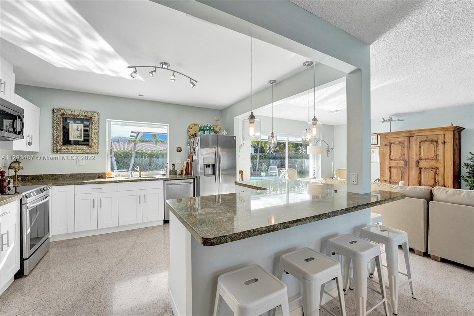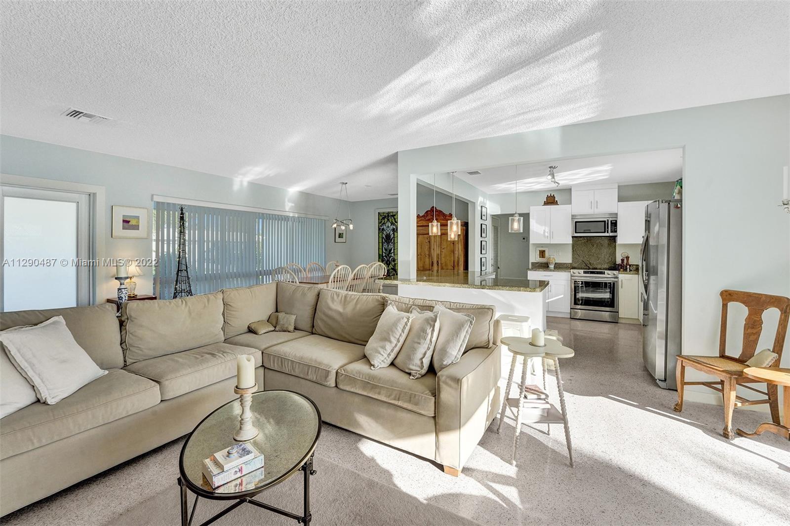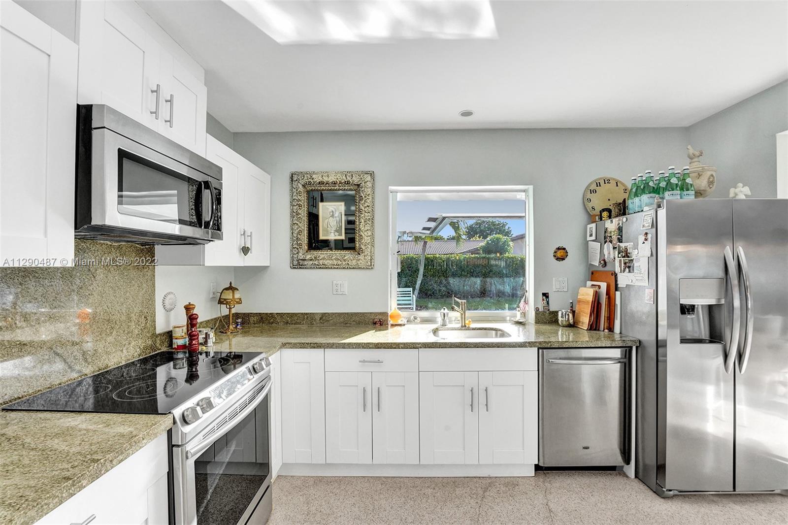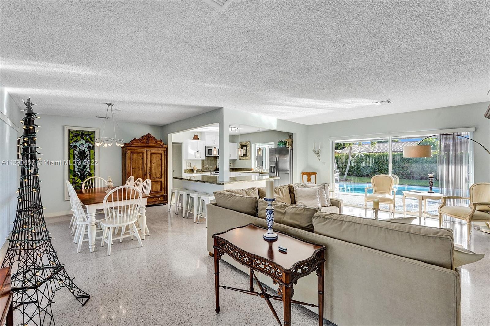 Immaculate 3/2 pool home in move-in condition. Many recent upgrades including white kitchen, SS appliances, granite counter, marble bathroom, glass shower, original gleaming Terrazzo floor, open floor plan w/pool garden view, private master wing with access to pool, walk in closet, guest wing w/private bath, pool access, double closets. Paved circular driveway, sprinklers, professional landscaping ,hurricane shutters, 2 car garage, laundry room, utility room and much more...
