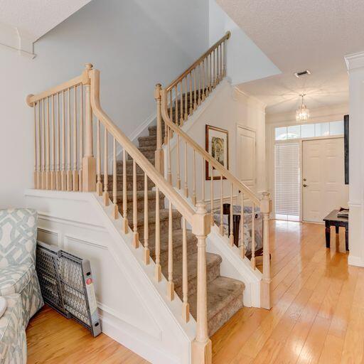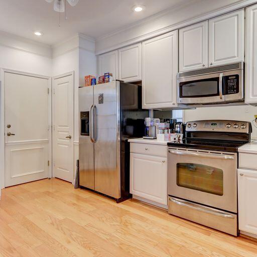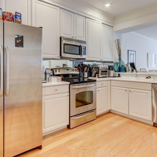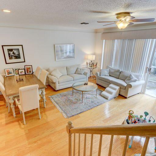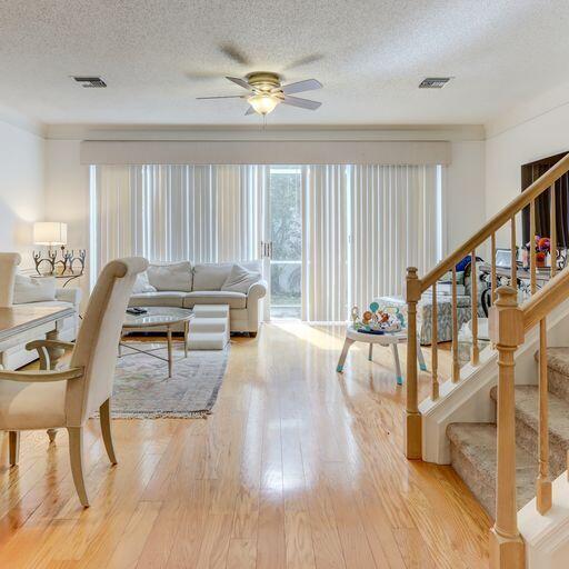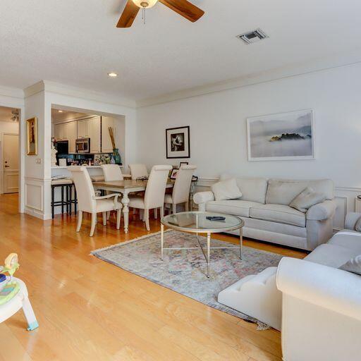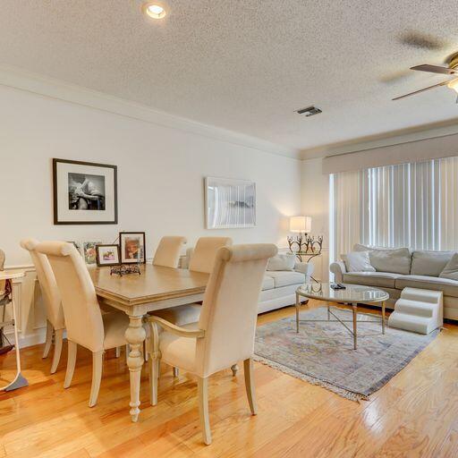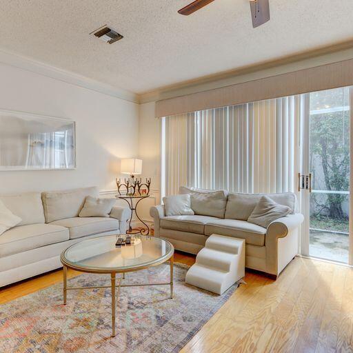 This lovely 2 bedroom/2 1/2 bath townhome on a private interior lot is light and bright featuring volume ceilings, light oak hardwood floors on the main floor & neutral carpeting upstairs; an open kitchen with white cabinetry & countertops and stainless steel appliances, crown moldings and decorative wall accents; flat wall finish and a one car garage. Primary and Secondary Bedrooms and a loft that can be converted into a third bedroom plus a utility room are located upstairs. Nice quiet location in the community and in central Boca Raton.