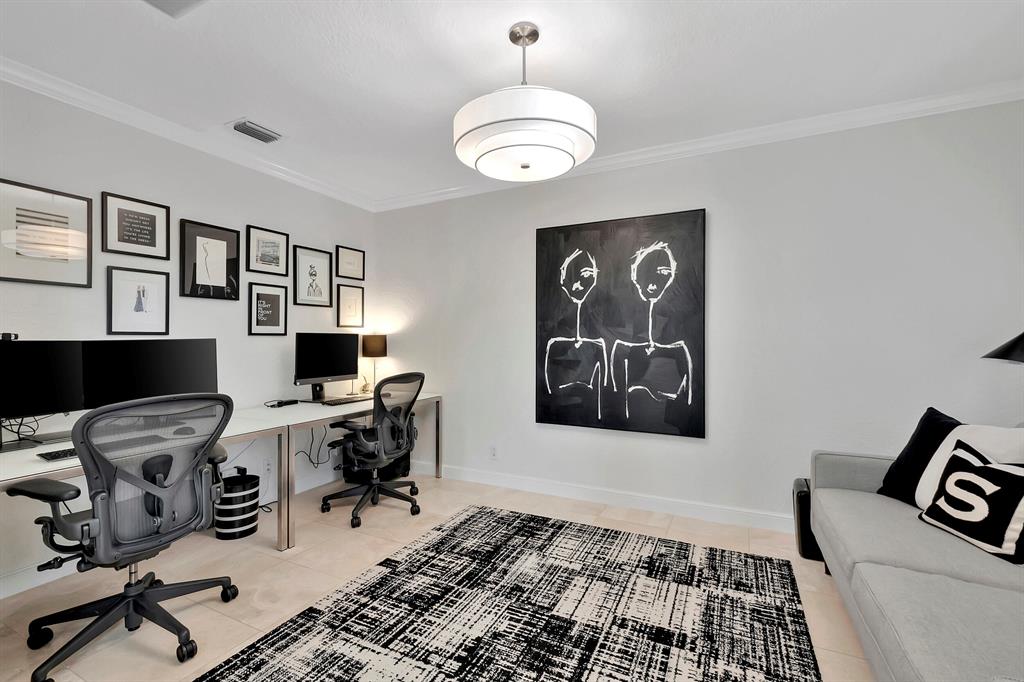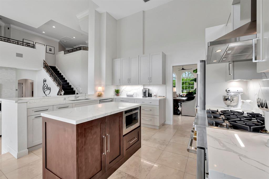 Breathtaking, two story home with golf courses views. Highlights include a mix of impact and accordion windows; new full house generator; roof under 3 years old; and hardwood floors in every bedroom. RH furniture and golf cart both negotiable.Gorgeous, renovated kitchen with KitchenAid appliances with a natural gas stove, breakfast nook, backyard views, and Restoration Hardware fixtures.The first story has the dining room with butler entry; office with french doors and plantation shutters; and guest suite with cabana bath and backyard entry.Upstairs, the two bedrooms share a Jack-and-Jill bath with vanity; the massive master has a newly renovated terrace overlooking the golf course.Backyard features a newly renovated heated pool and spa; mini-fridge & sink; covered patio