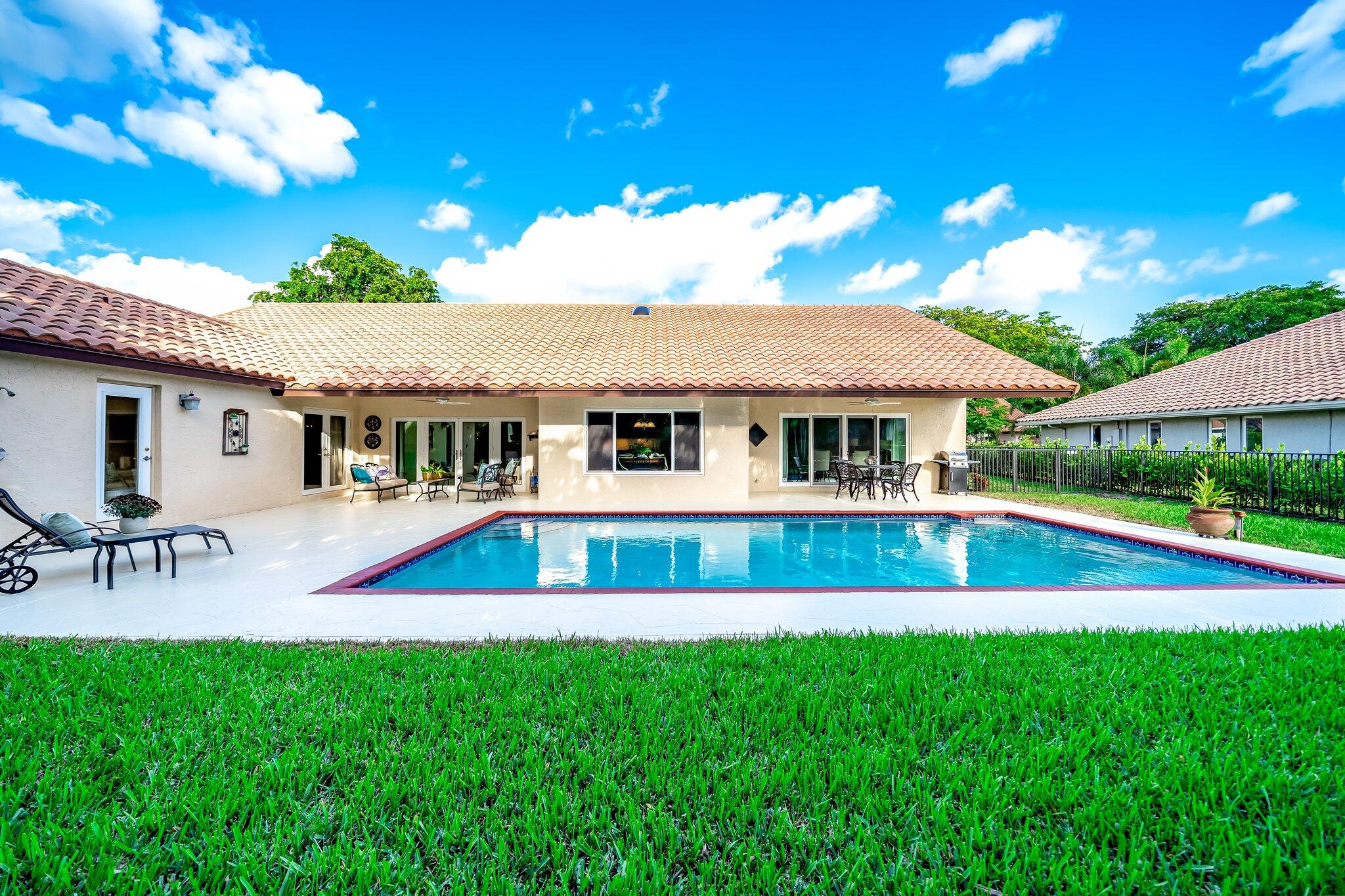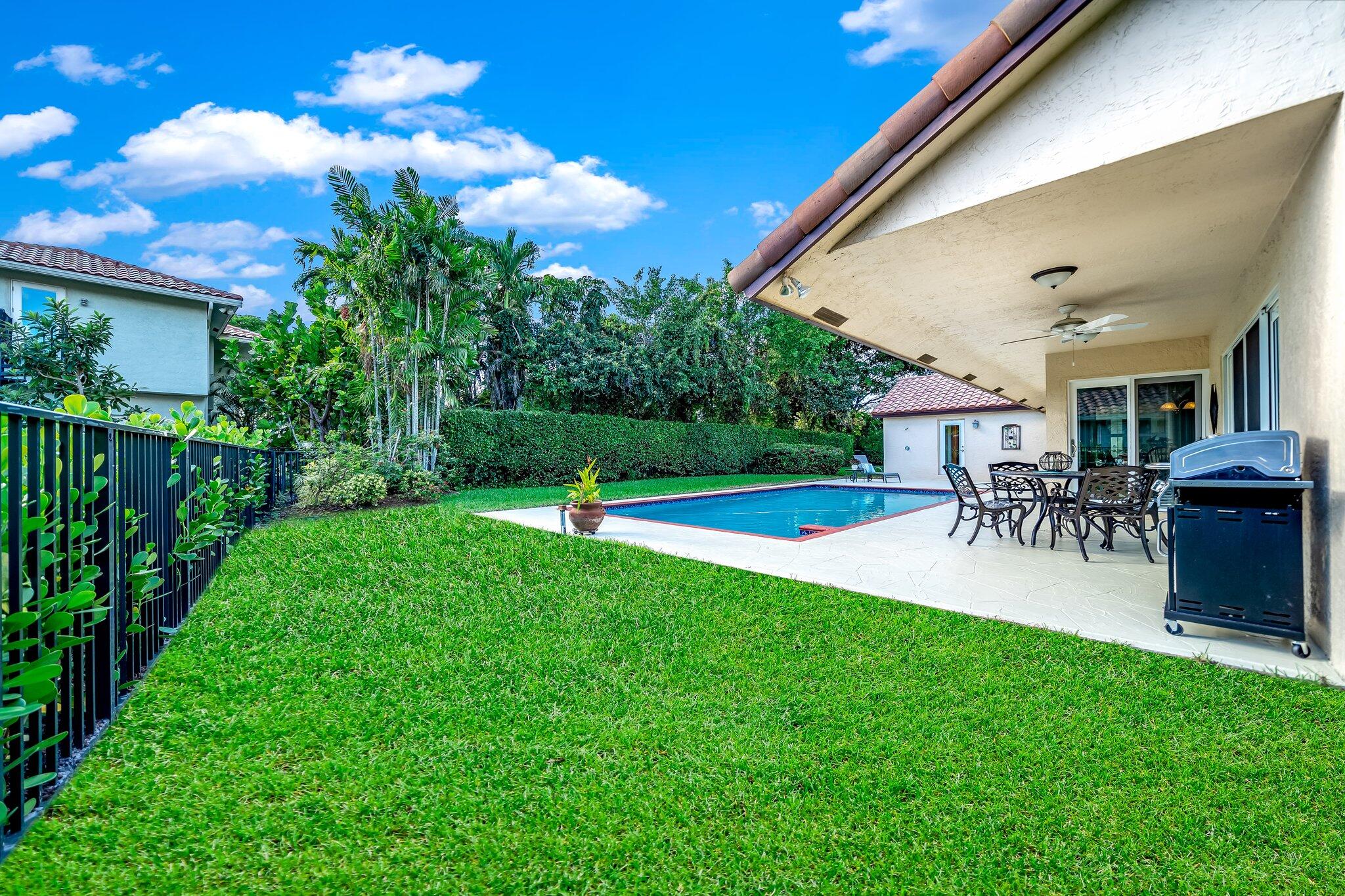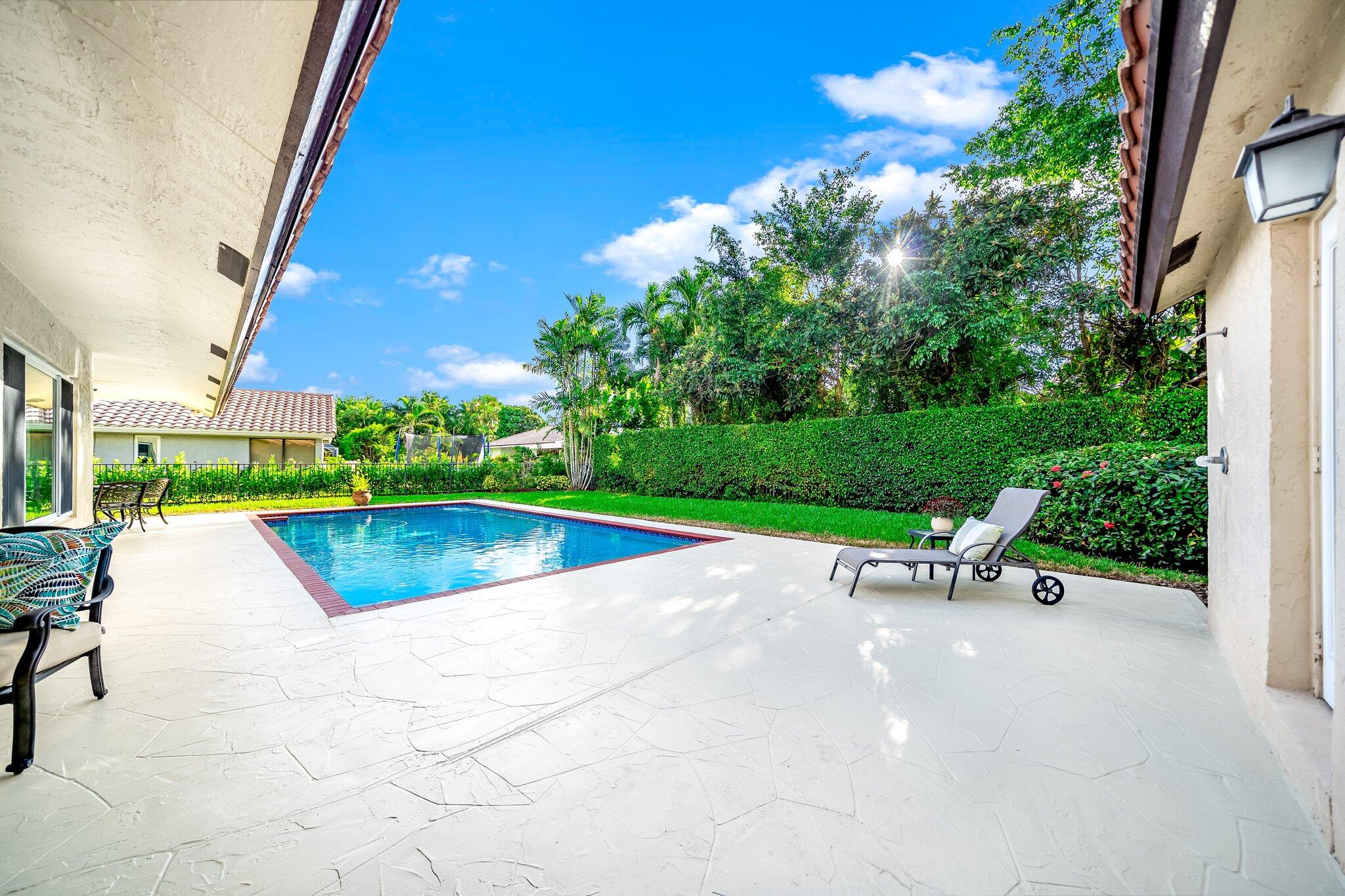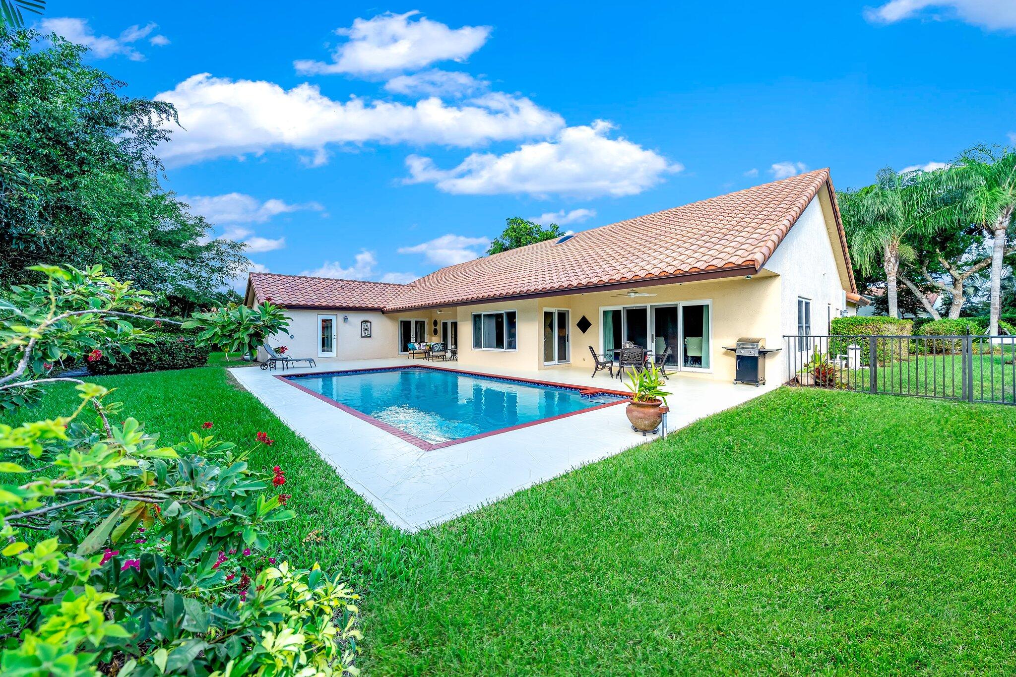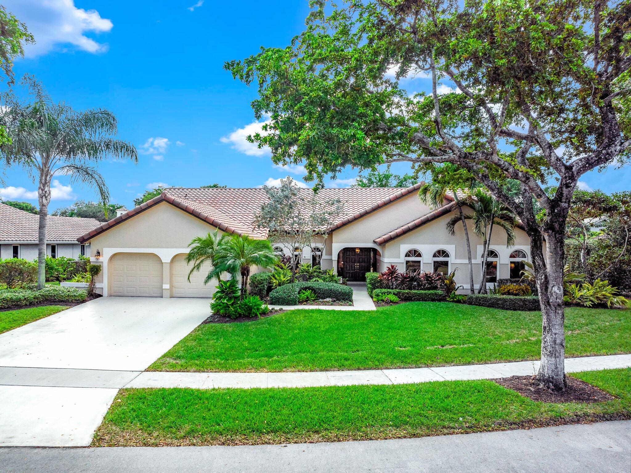 This 4 bedroom, 2 full and 2 half bathroom home is located on a beautiful, tree-lined street in the desirable New Floresta community in central Boca Raton. Enjoy a spacious one-level floor plan just under 3,000 living square feet with views of the large yard and pool. Ample cabinetry, tasteful granite counters throughout and a suite of GE appliances in the kitchen (including a double oven) are a chef's dream. Master suite with luxury touches including limestone flooring, soaker tub and immediate hot water system in the bathroom, plus custom closet installation with built-in chests and shelves. Elegant accents throughout the remaining beds and baths. Impact windows, sliders and patio doors. Close to Town Center Mall.