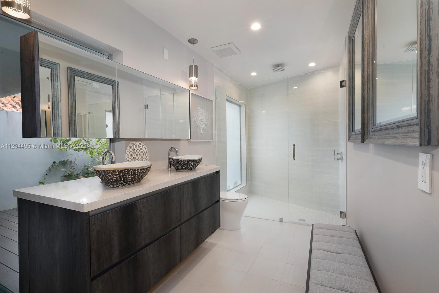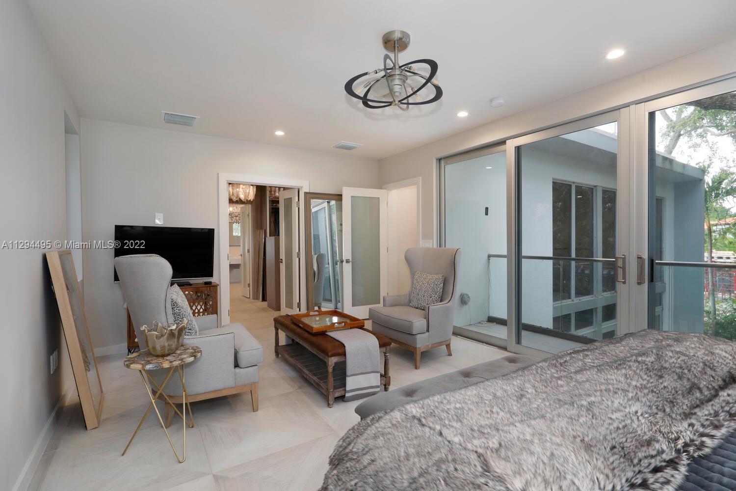 Exquisite, modern-style home in prestigious North Coconut Grove. Walk or bike to bayfront parks & marinas and to the Grove village galleries, boutiques, restaurants & sidewalk cafes. Major renovation by Kobi Karp Architecture in 2019, including a spectacular glass-enclosed wine cellar, custom built-ins and the finest fixtures & finishes throughout. 25 ft. high walls of glass provide unobstructed views from most rooms to the ultra-private tropical garden w/ magnificent Live Oaks. Unique floorplan features 2 fabulous master suites, one spanning the entire 2nd level features expansive walk-in closet, loft/office area & terrace overlooking the tree-tops. Whole house generator. 19' above sea level. Idyllic, tree-canopied pool & lounge area perfect for intimate dinners and outdoor entertaining.