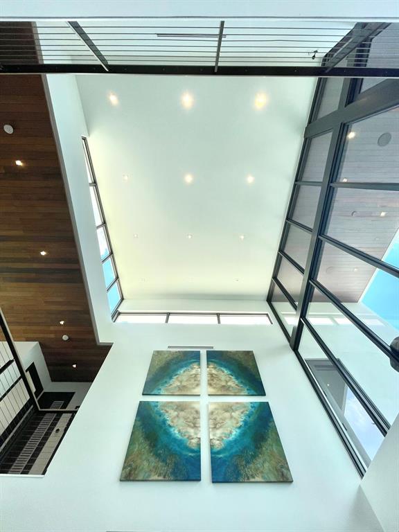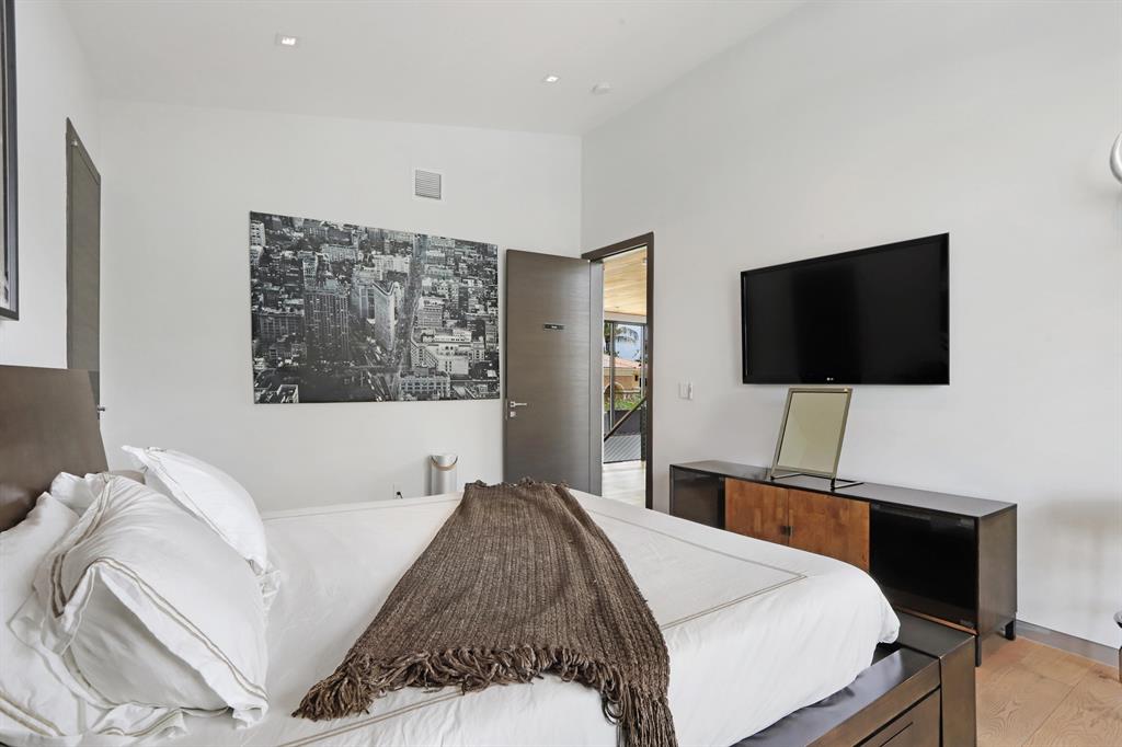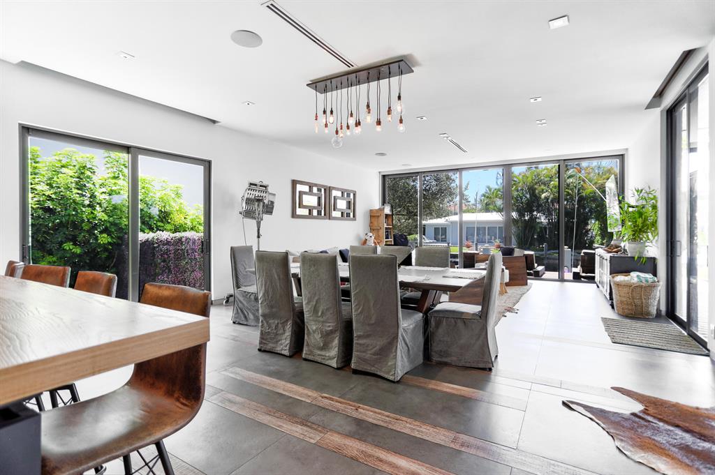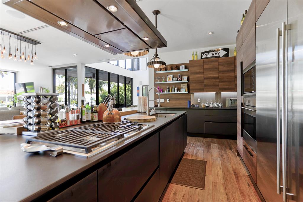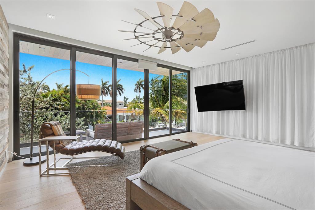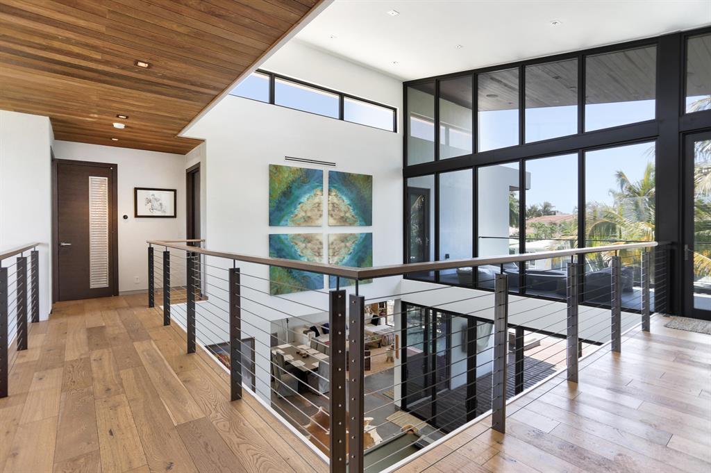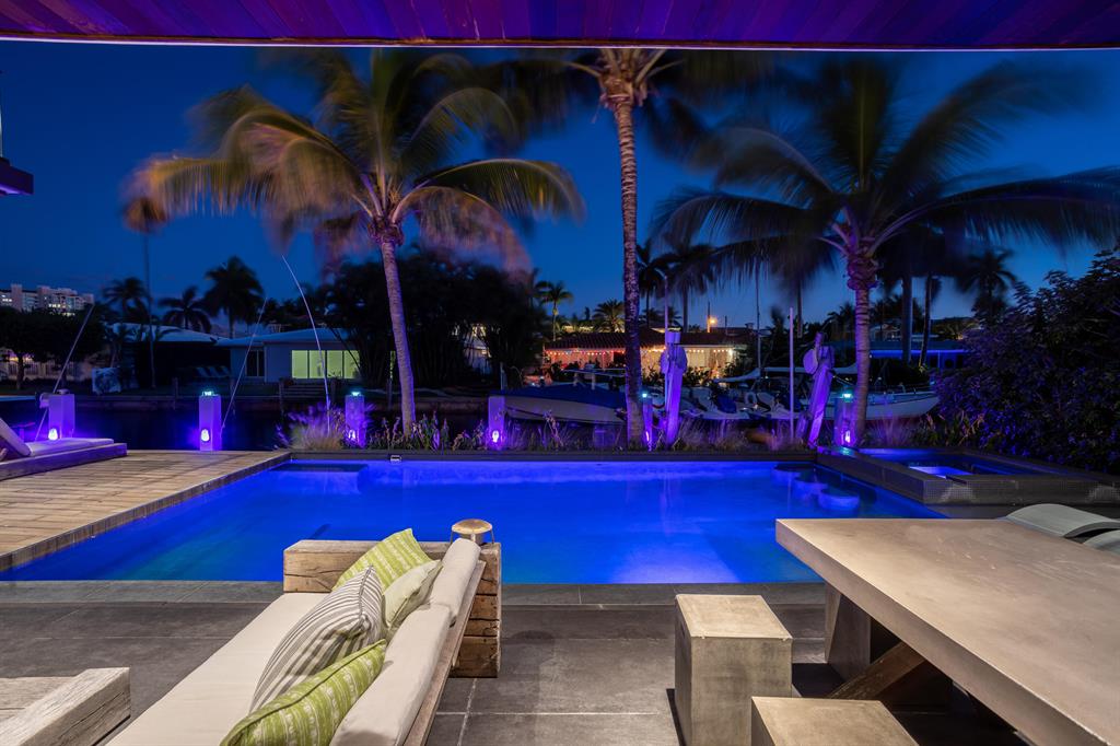 This Stunning architectural masterpiece features waterfront freedom with no bridges to Intracoastal Waterway. A soaring great room ceiling with extensive glass is the immediate impact point upon entry with views the tropically landscaped pool and patio with a dual wave runner lift and boat 40 ft mooring area. The kitchen with central island/seating services an open dining and family/media area. The first floor ensuite bedroom is currently the media room. The second story primary bedroom suite accesses two covered balconies. There are three additional second level ensuite bedrooms, two of which have balcony access; one is currently being used as an office. A spiral staircase connects the second floor covered patio with fire pit to the pool. See MORE for additional details