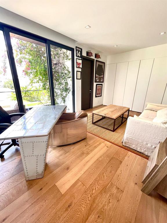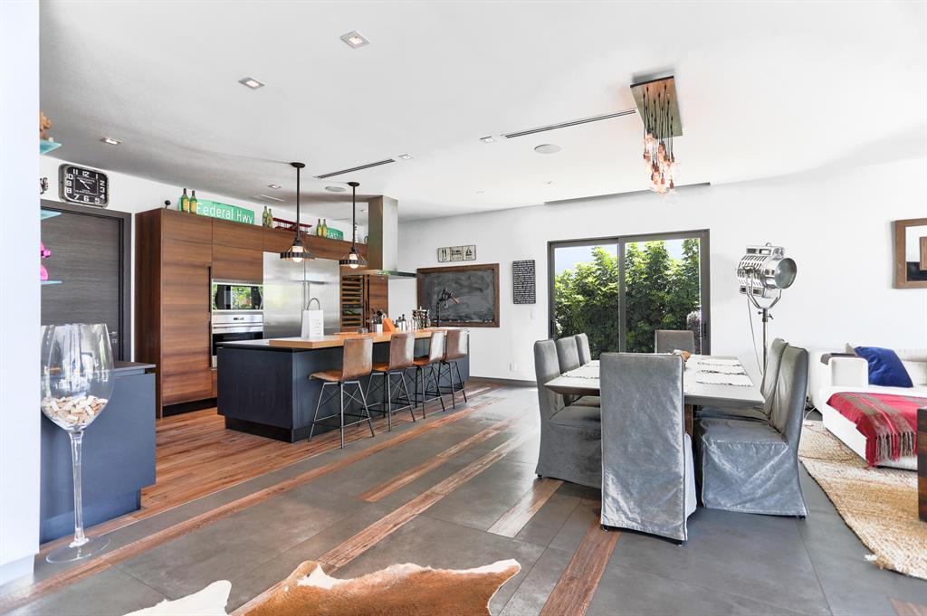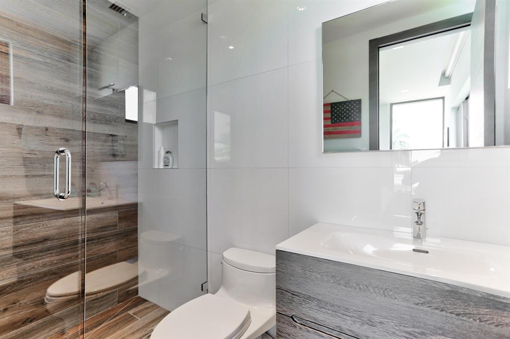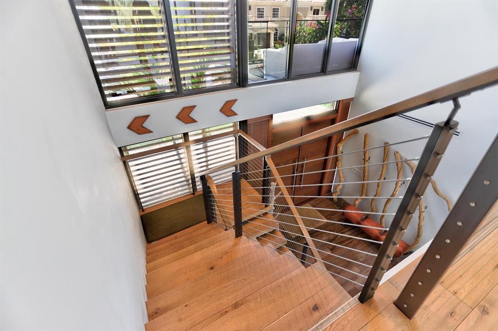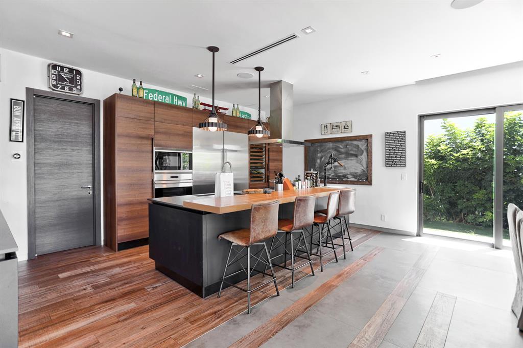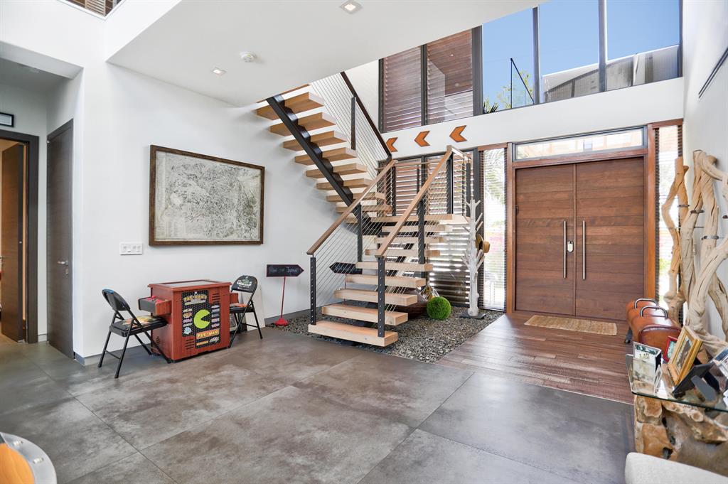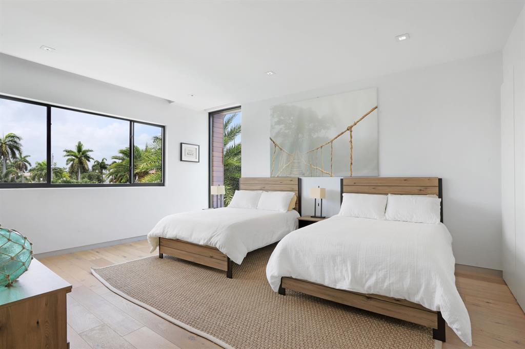 This Stunning architectural masterpiece features waterfront freedom with no bridges to Intracoastal Waterway. A soaring great room ceiling with extensive glass is the immediate impact point upon entry with views the tropically landscaped pool and patio with a dual wave runner lift and boat 40 ft mooring area. The kitchen with central island/seating services an open dining and family/media area. The first floor ensuite bedroom is currently the media room. The second story primary bedroom suite accesses two covered balconies. There are three additional second level ensuite bedrooms, two of which have balcony access; one is currently being used as an office. A spiral staircase connects the second floor covered patio with fire pit to the pool. See MORE for additional details