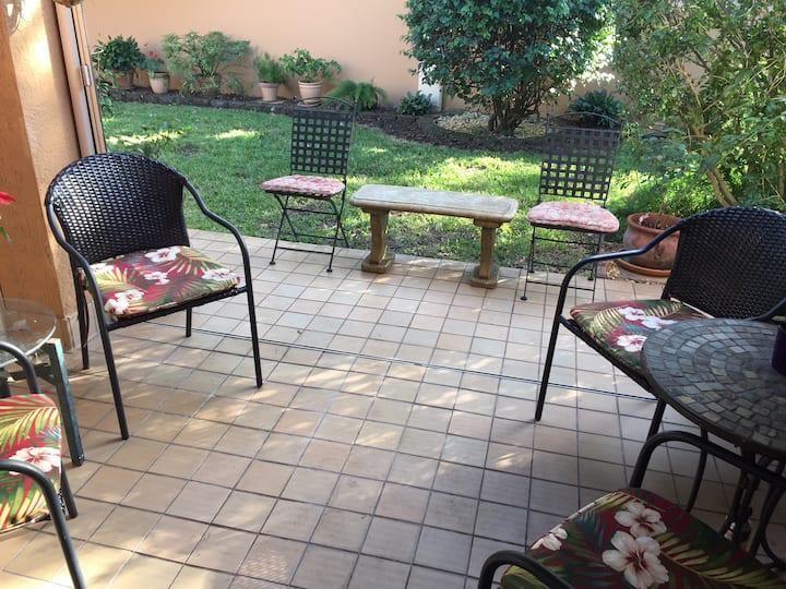 Beautifully renovated three bedroom townhouse ideally located in a cul-de-sac privately tucked away. The corner home features a new kitchen tastefully done with soft close doors and drawers, travertine tile flooring throughout the first floor and wood on the stairs and the second floor. The main bedroom and bathroom is on the first floor, while the second floor has both guest bedrooms, a large loft which could potentially be a fouth bedroom as it features a closet and a window, or it can be a den or an office. All bedroom closets are furnished with California closets, the property features lots of storage space. The patio is private and one of a kind perfectly laid out for a great family barbecue fun day or just a happy hour evening. No HOA approval required. Rentable property immediately!