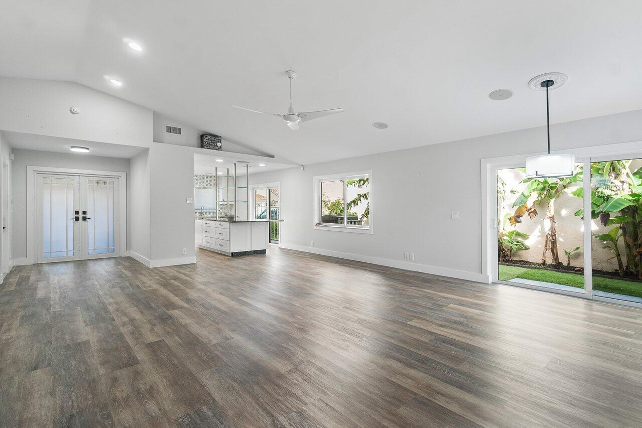 This waterfront, renovated house is spectacular. An open concept design, modern finishes, and gorgeous lake views are focal points of the home. The spacious living room has volume ceilings and flows directly into the dining space for a seamless transition. An updated kitchen offers new stainless steel appliances, an island with custom glass shelves, and plenty of storage. The oversized screened-in patio is the perfect setting to enjoy the peaceful lake views. The primary suite has a large walk-in closet and sliding glass doors to the screened-in patio. The primary bathroom features dual sinks and an eye-catching freestanding tub. Two additional bedrooms share a renovated bathroom. An additional benefit to this home is the full hurricane protection with impact glass windows and doors. The