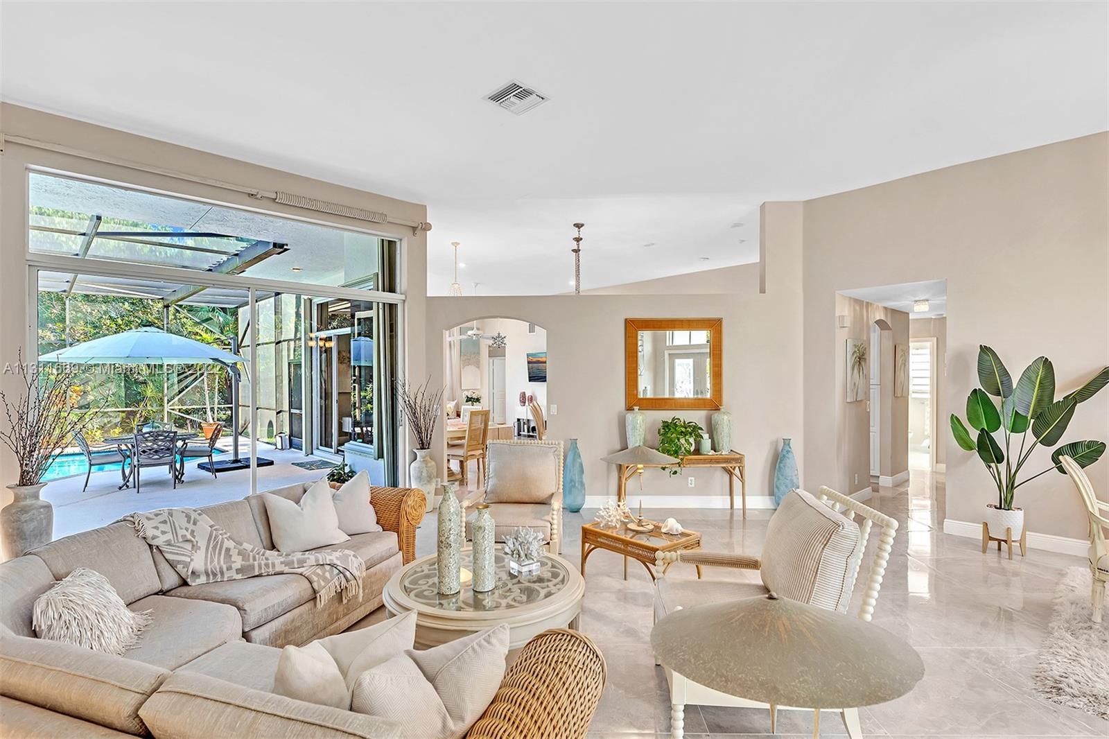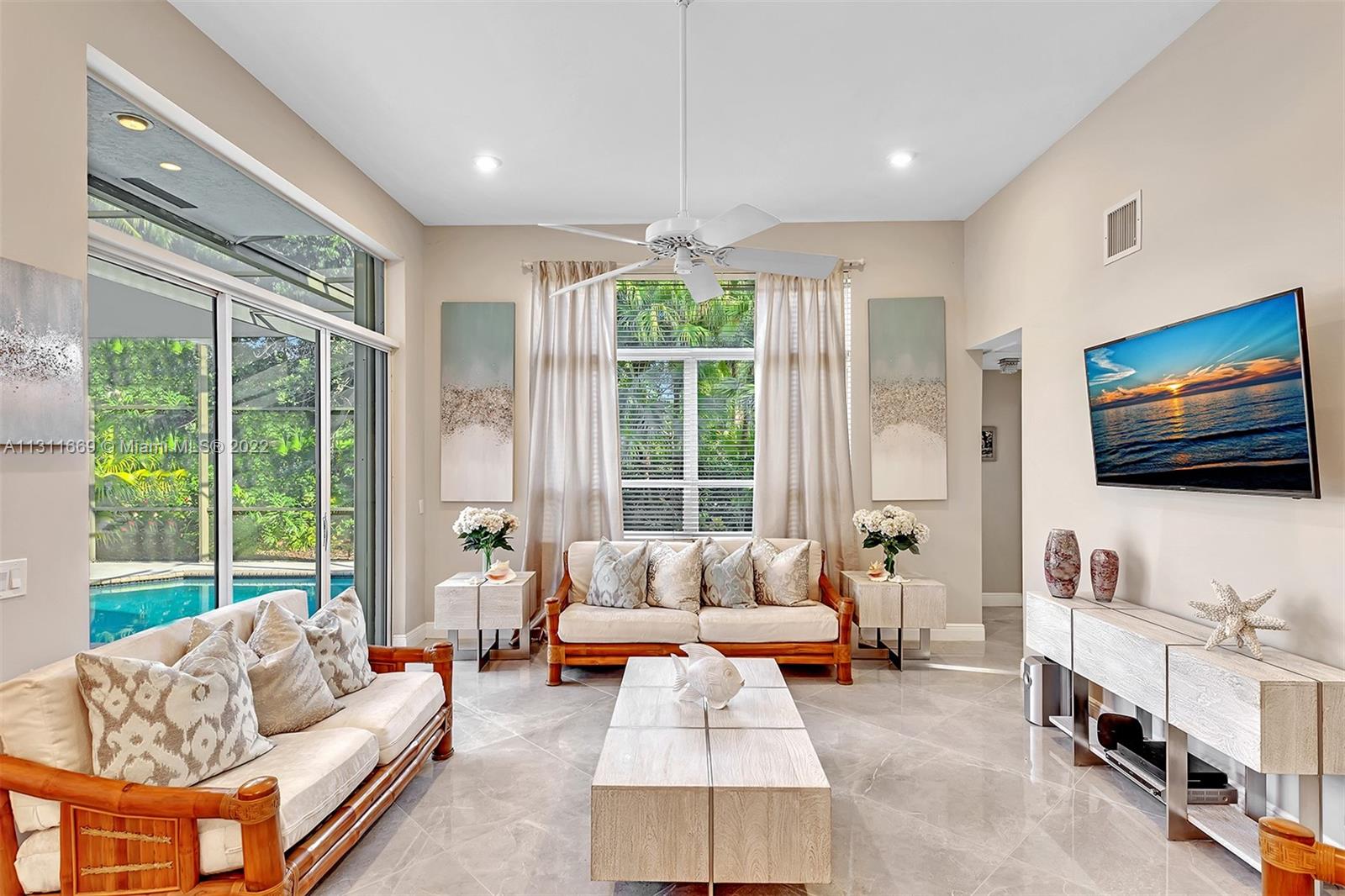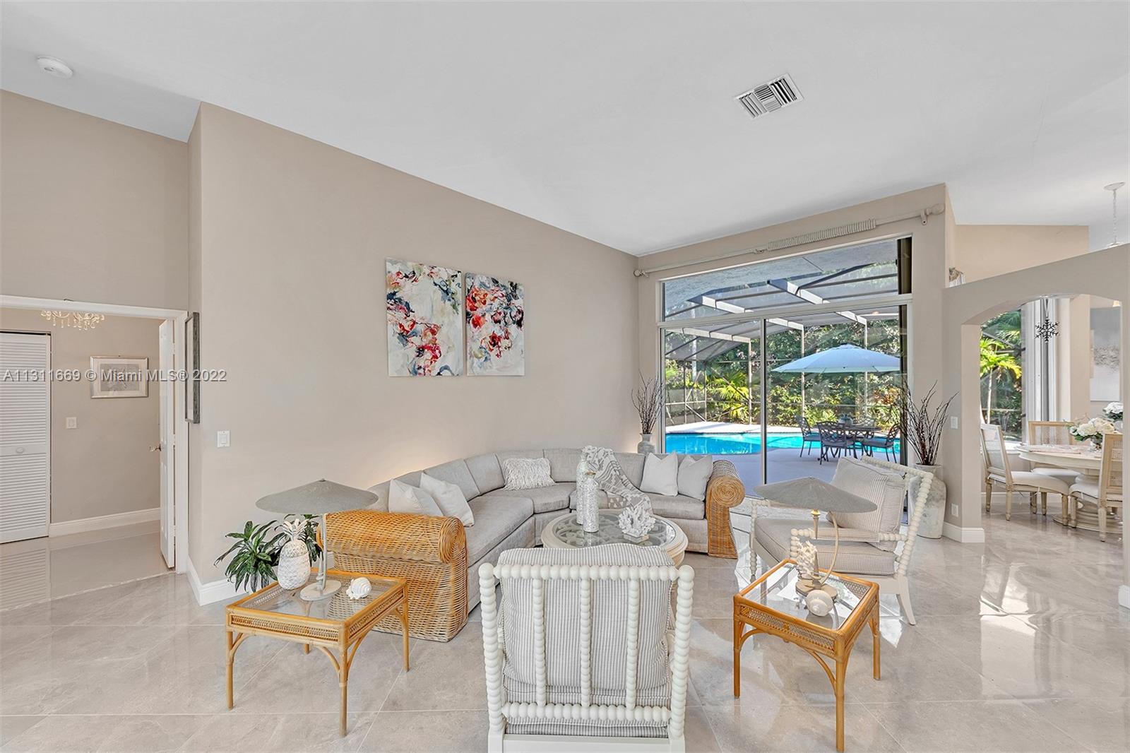 MOVE IN READY! This absolutely STUNNING 4 bed/3 bath one story home is set on perfectly manicured, lushly landscaped corner lot, COMPLETELY RENOVATED with transitional taste and a coastal flair. Enter the foyer and immediately feel the spacious living areas, volume ceilings and large sliders with transom windows. The chef's kitchen with quartzite counter tops, glass tile backsplash and wall oven/microwave overlooks the spacious family room. The master suite boasts a spa-like bathroom and 2 walk-in closets with built-ins. Other features include gorgeous 36x36 inch tile, trendy light fixtures and 3 way split bedroom plan. The screened pool with large patio is surrounded by generous yard. NEW ROOF and accordion shutters. 24 hr guard gated. Steps to community pool, playground and soccer field.