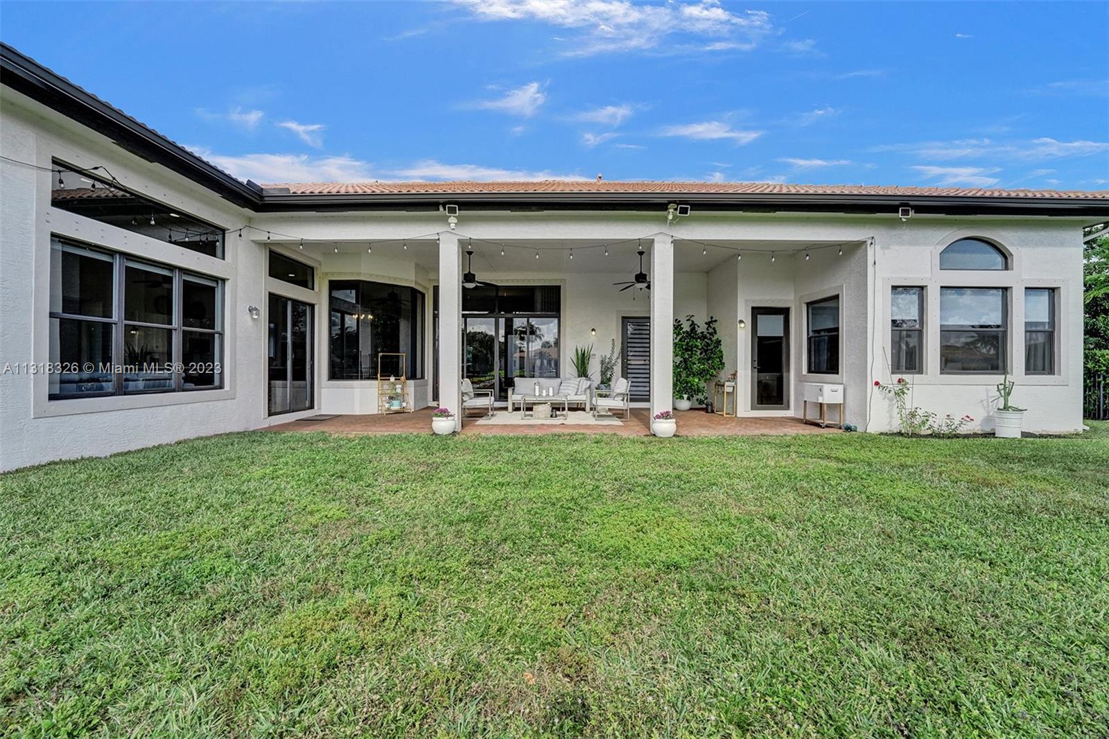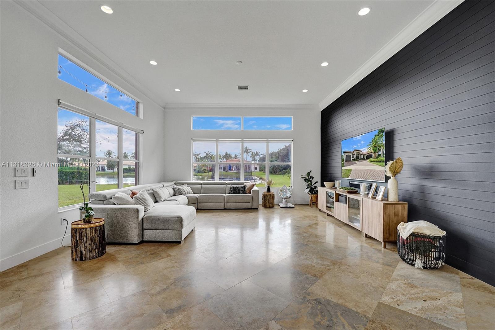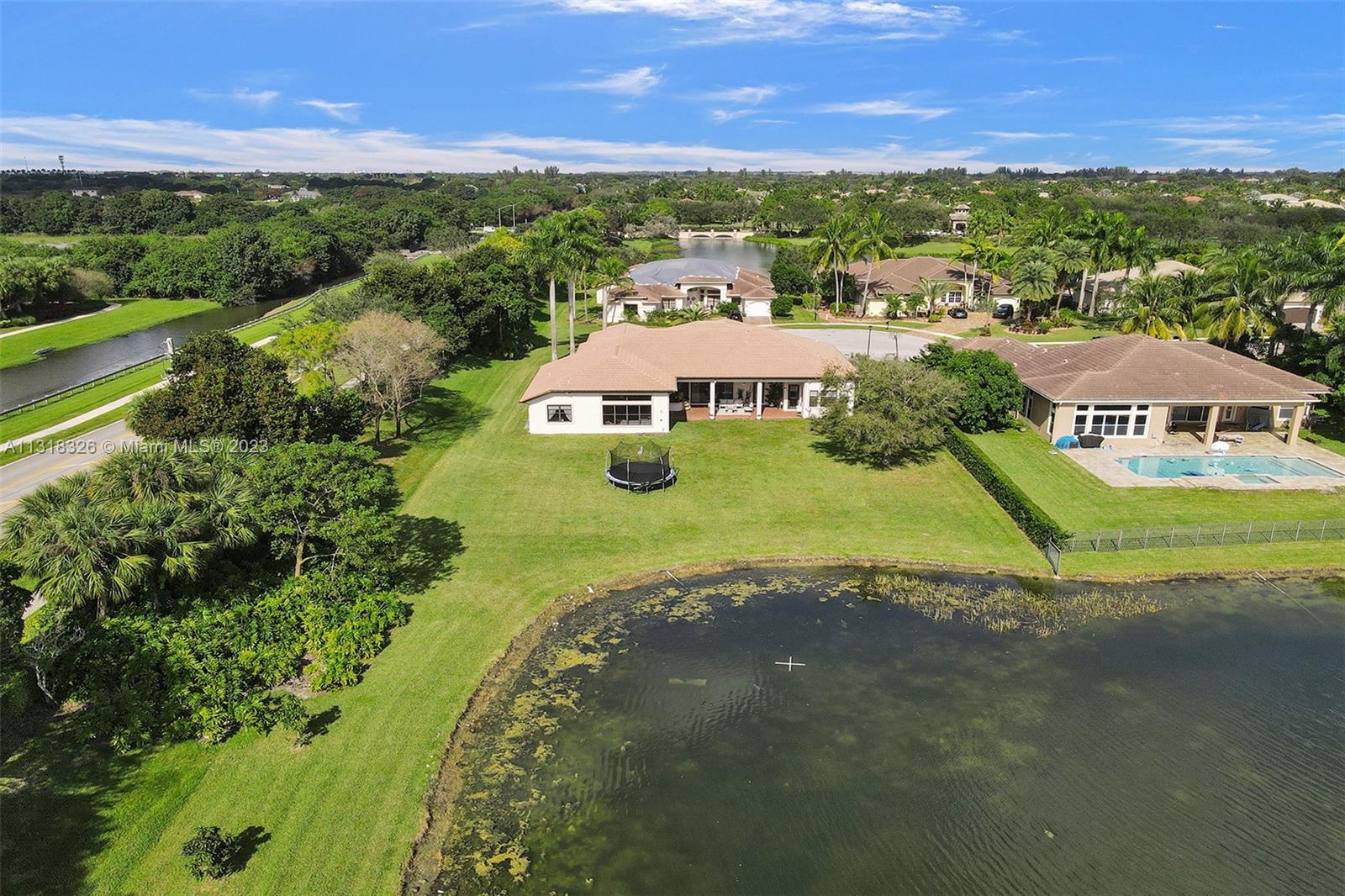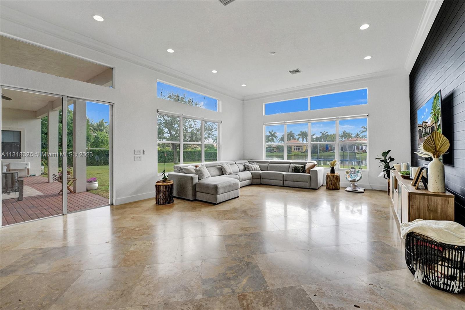Your dream home is here. The most spectacular family-friendly single family home community in South Florida, Riverstone. This spacious corner waterfront property is located in a cul d sac and features a split bedroom floor plan with 6 bedrooms, 5.5 bathrooms, plus a bonus room/office and a 2 car garage. Open living spaces and large floor plan with 12' ceilings. The gourmet kitchen with wood cabinetry, quartz countertop and stainless steel appliances. Bathrooms have been completely upgraded modern style with quatz tops. Glass sliding doors that lead out to the rear patio terrace, where you will enjoy a perfect setting for relaxing and entertaining. This home has one of the largest lot in the community. A great place to raise a family