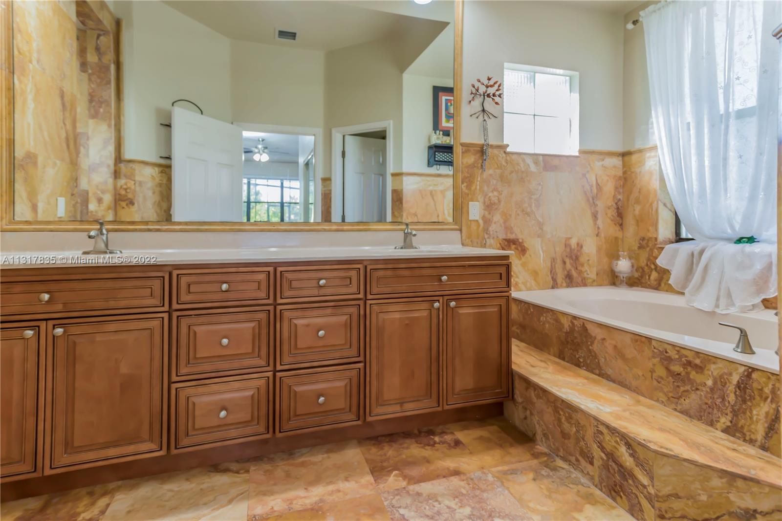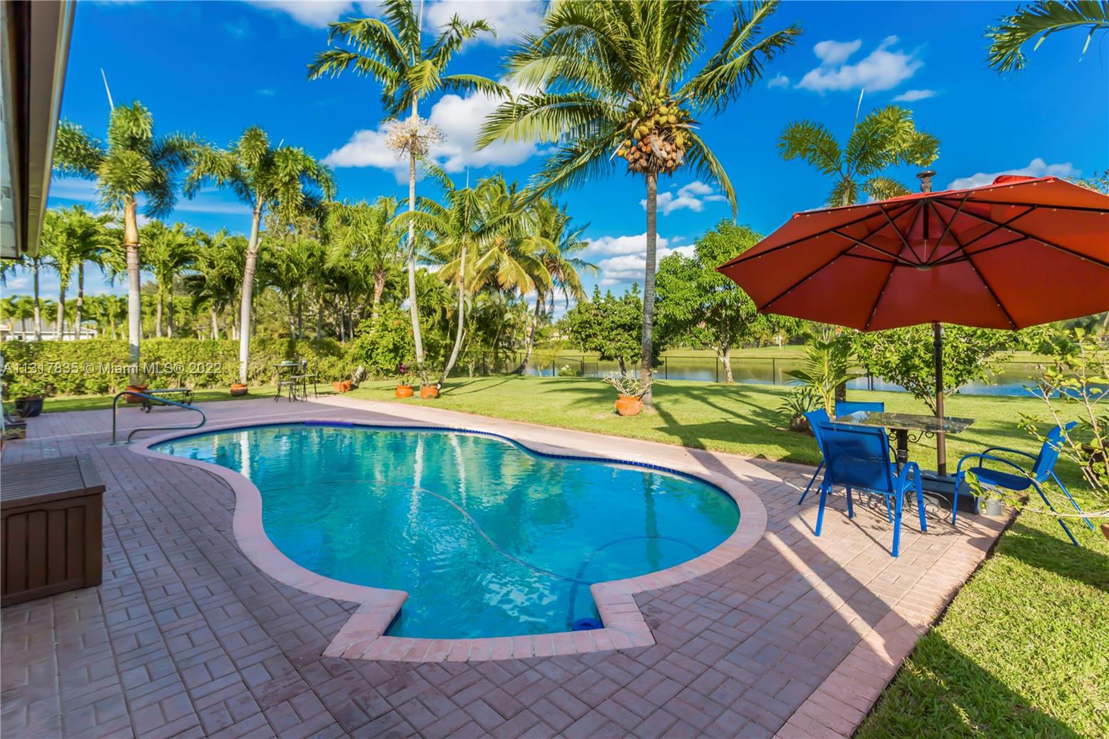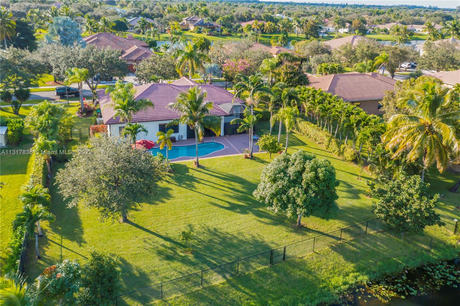 Stunning lakefront home on nearly a full acre lot in the guard gated community of Imagination Farms. This split floor plan includes volume ceilings, beautiful warm neutral colors, recessed lighting and more. Gourmet kitchen features granite counter tops, stainless steel appliances, and a large walk in pantry. Master Bedroom boast spectacular lake views, 2 walk-in closets and a large master bathroom with travertine tiles and large soaking tub. Walk out to your backyard oasis which features an extended screened in patio with beautiful ceramic tile floors, a dog run, a pool and amazing lake views. This large lot not only has lush landscaping but also fruit trees which include mango, avocado, and coconut. LG fridge does not convey.