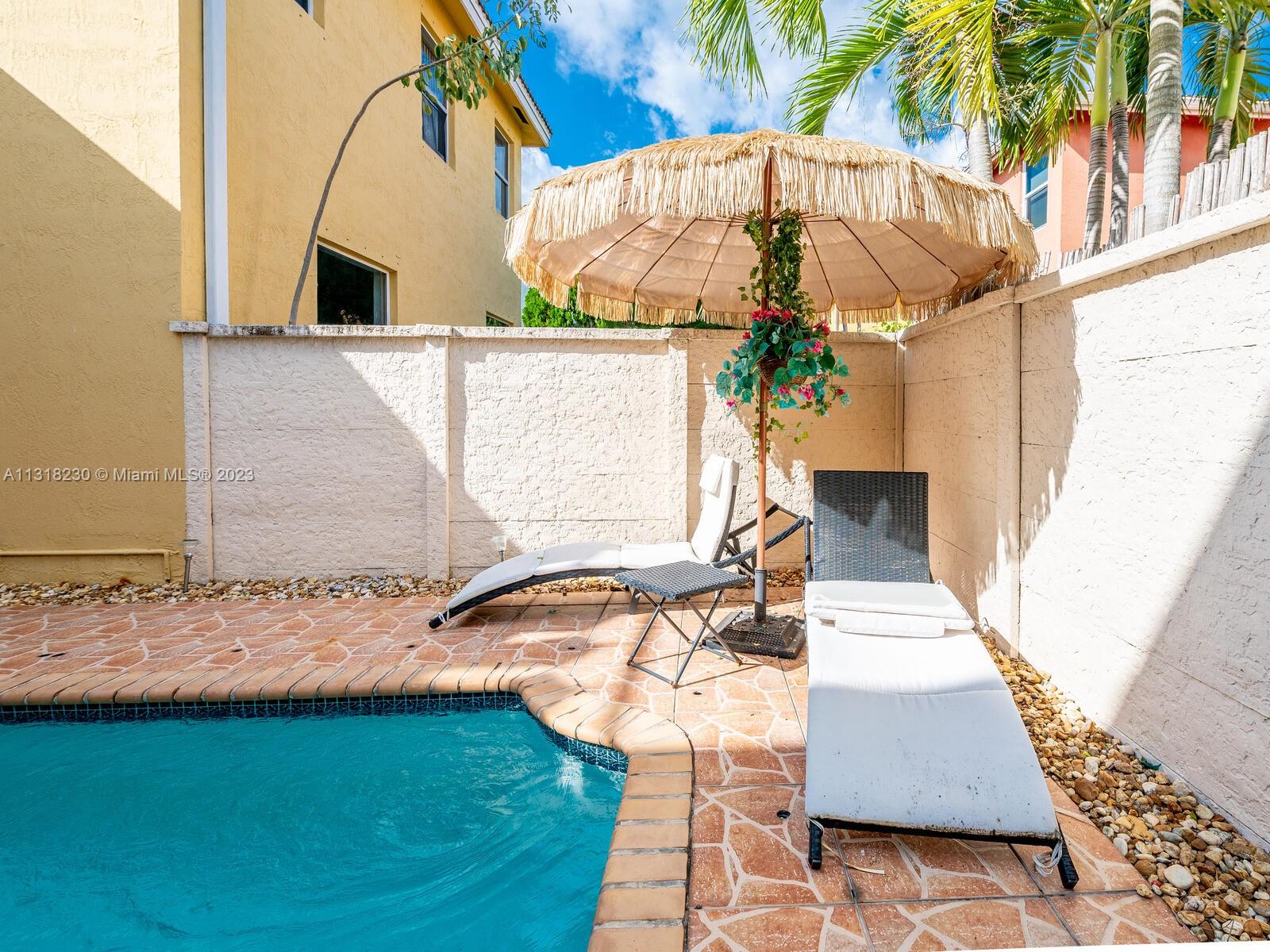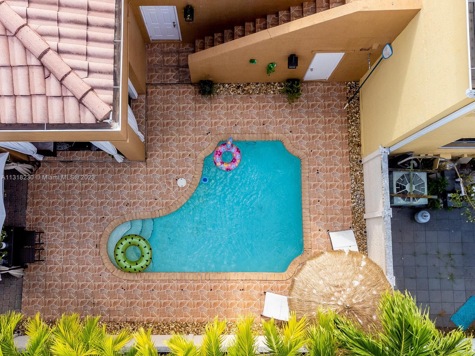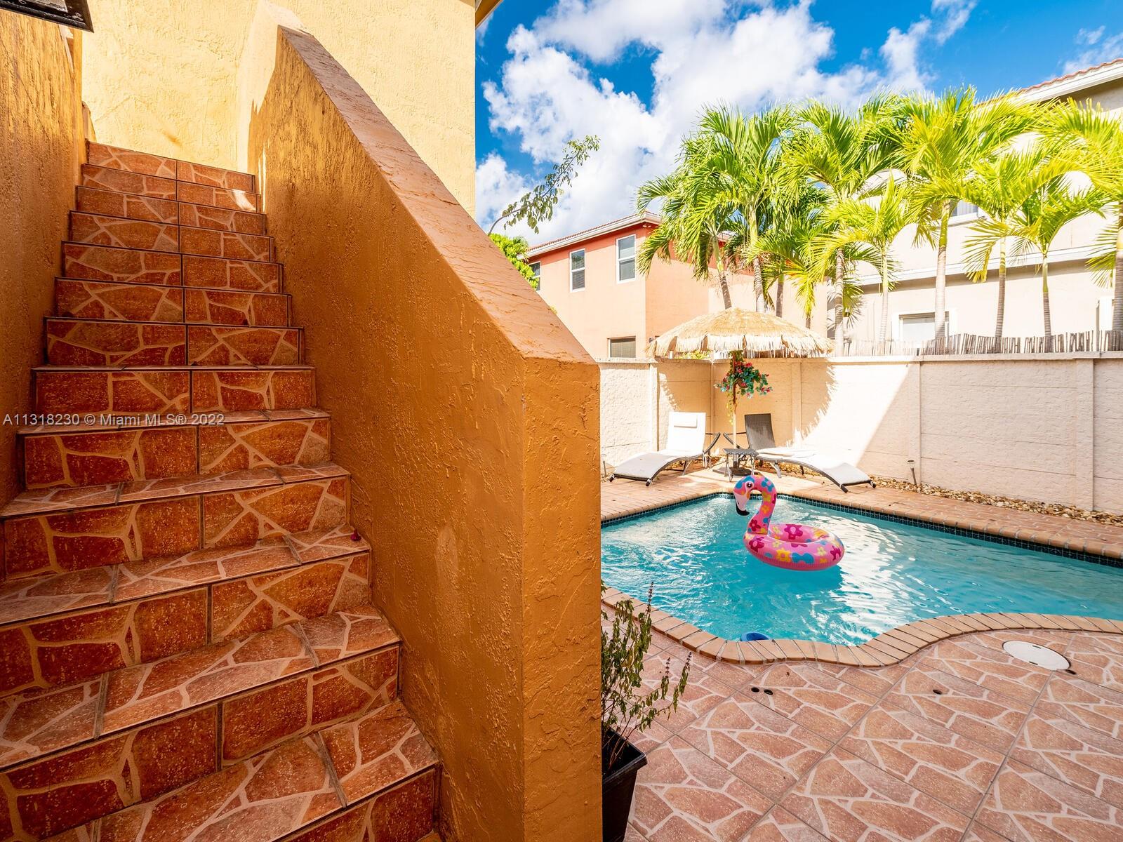 REDUCED...Great Location, Spectacular Mediterranean style. 4BR 3.5 Bath home, formal living and dining room, huge family room, LOFT, roof top terrace/sun deck overlooking the spacious patio and your own in ground POOL. Eat-in kitchen with wood cabinets, granite countertops, and SS appliances, full bedroom and bath downstairs, tile downstairs and wood laminate 2nd floor. Hurricane rated accordion shutters. Large two car garage, Outside shower/cabana bath, low HOA includes gated security, alarm, cable, walking distance to schools, shopping, entertainment, basic cable TV and ADT monitoring included. BACK ON THE MARKET. ROOF NEEDS REPAIR. CASH ONLY. Offer with proof of funds