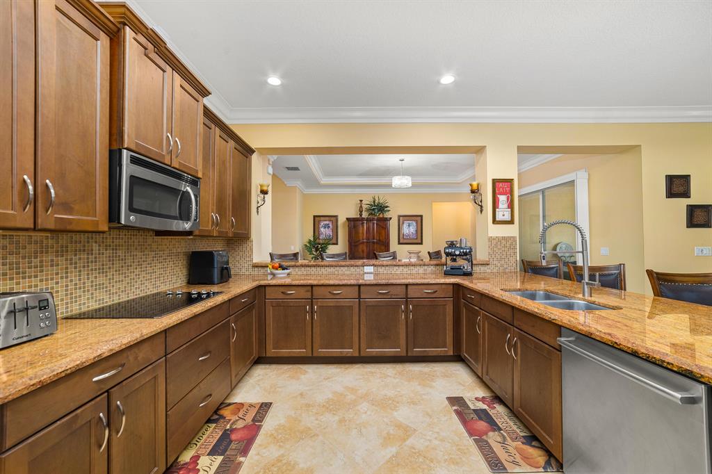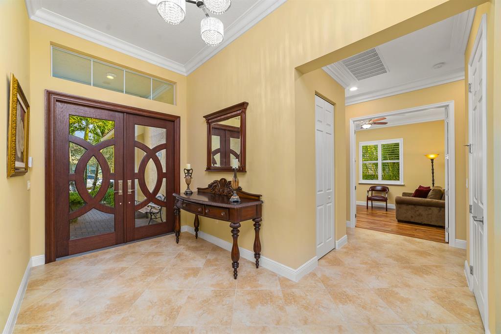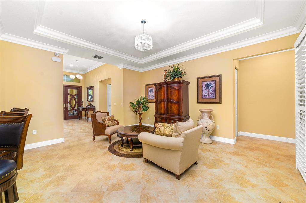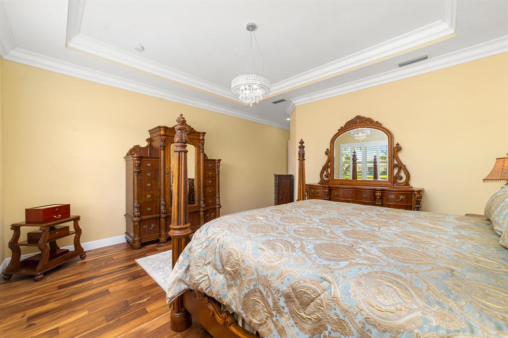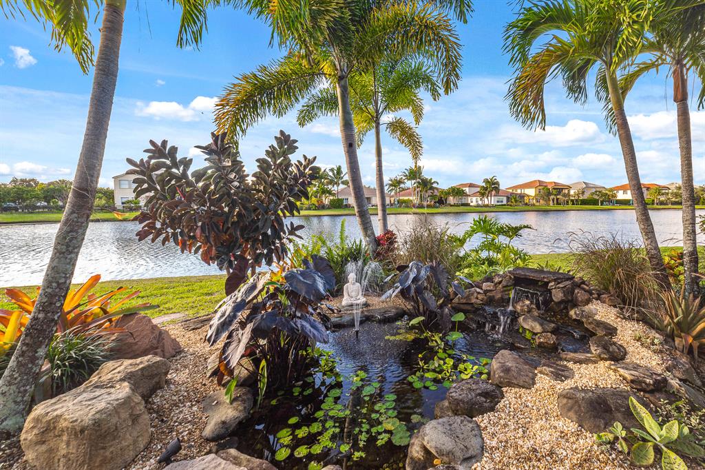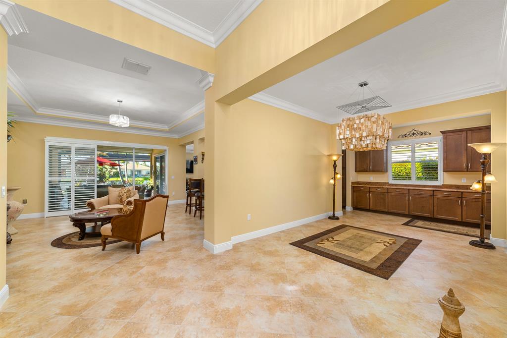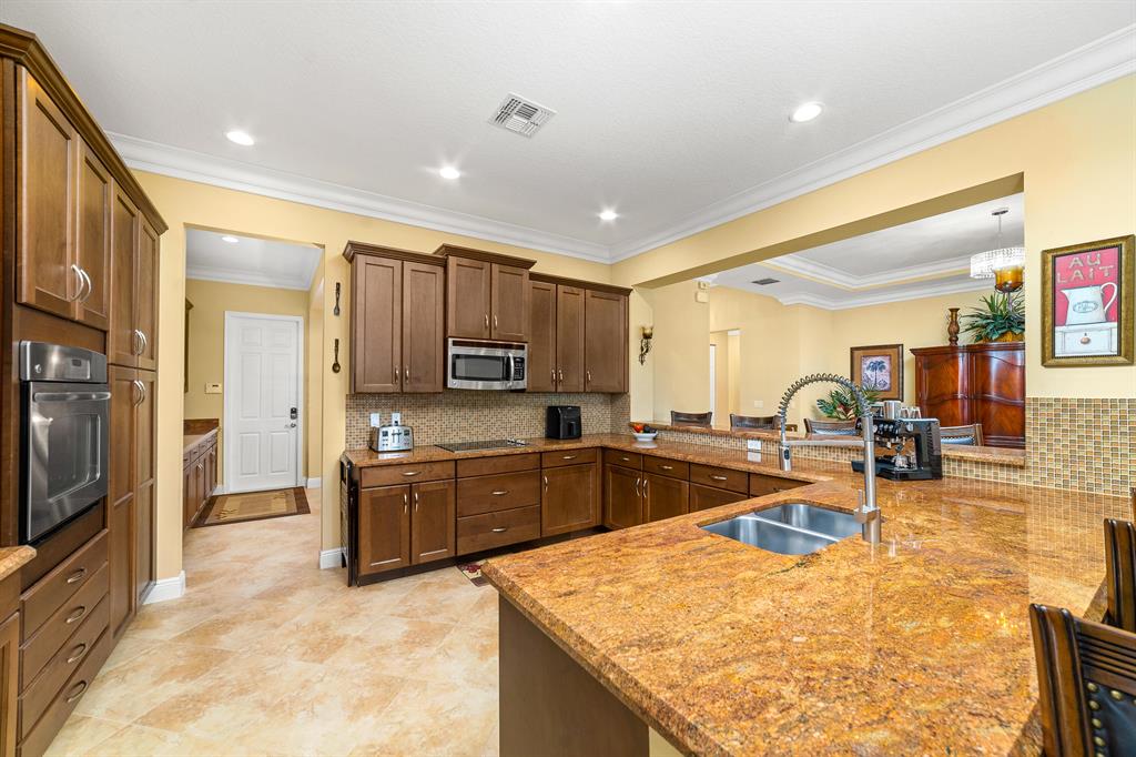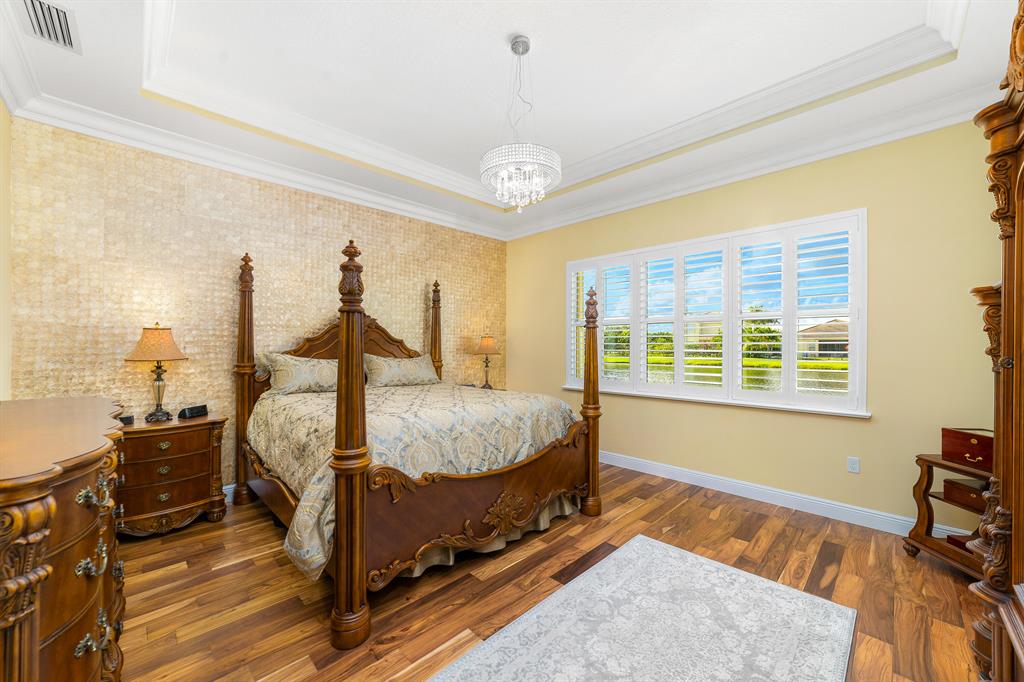 Enjoy the perfect blend of indoor and outdoor living in this phenomenal, meticulously maintained 4 bedroom plus den, 4 bathroom, 2-car garage home with breathtaking lake view! Crown moldings, recessed lights and plantation shutters throughout, tray ceilings in most rooms, and mahogany wood French front doors make the home feel elegant and open. There is neutral color tile diagonally in the living areas, engineered hardwood in the primary, one guest bedroom and den, and soft carpet in other bedrooms. The kitchen is equipped with stainless steel appliances, wall oven, glass cook top, stunning granite counter tops and backsplash, raised 42'' wood cabinets topped with moldings, stone deco wall under the bar, and a butler's pantry. The formal dining room is great for entertaining. The primary
