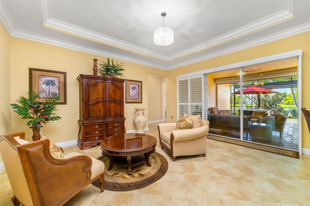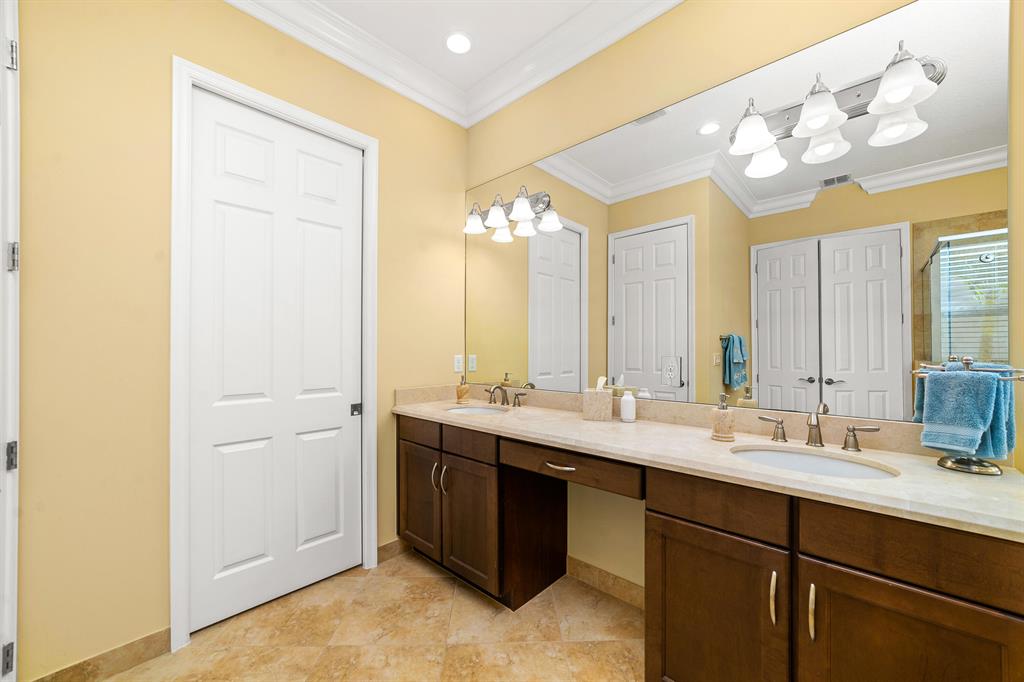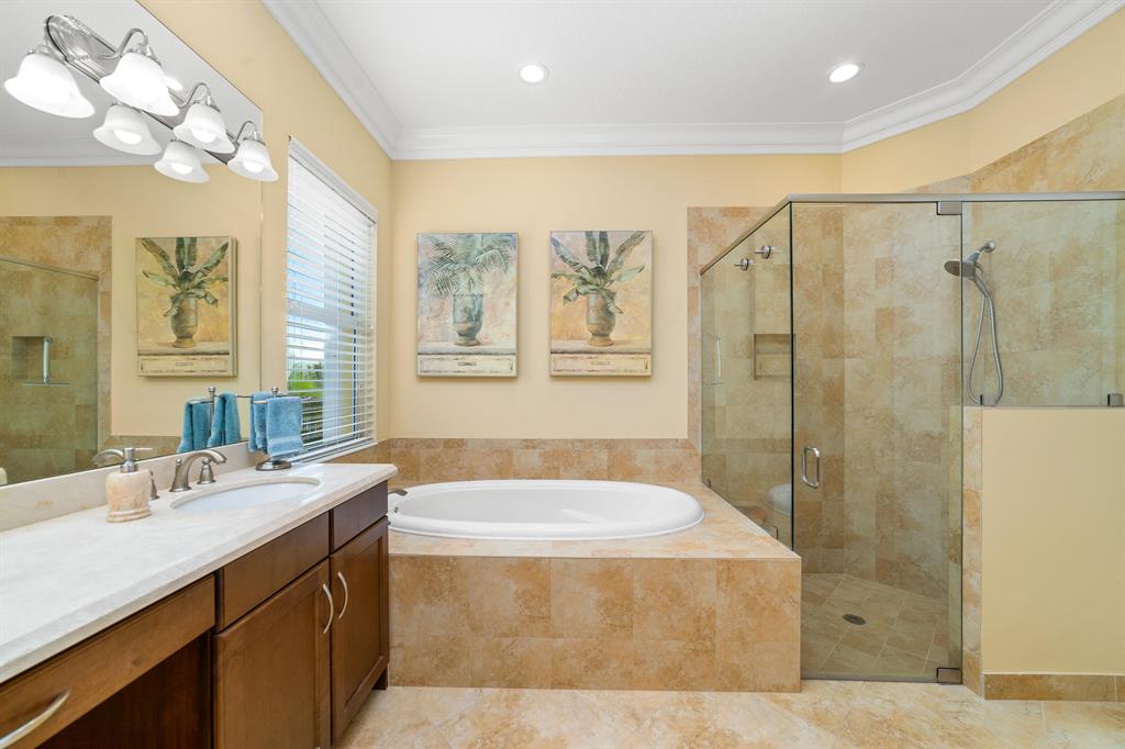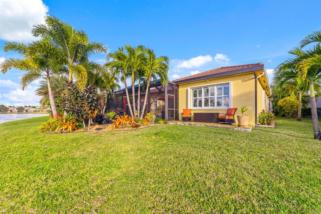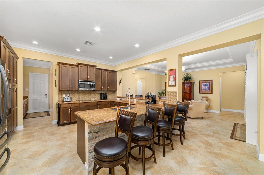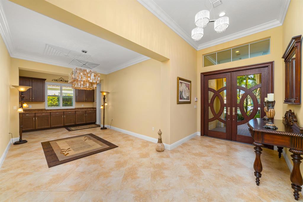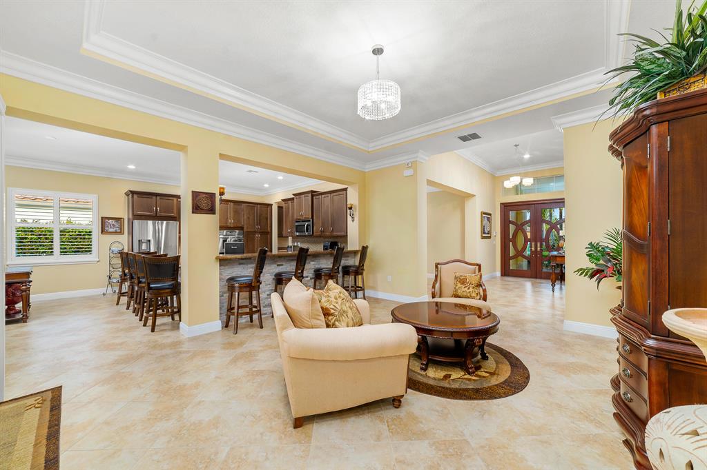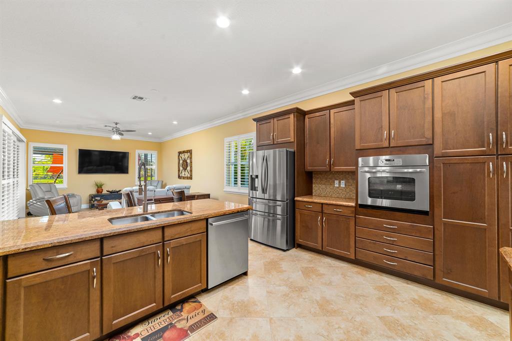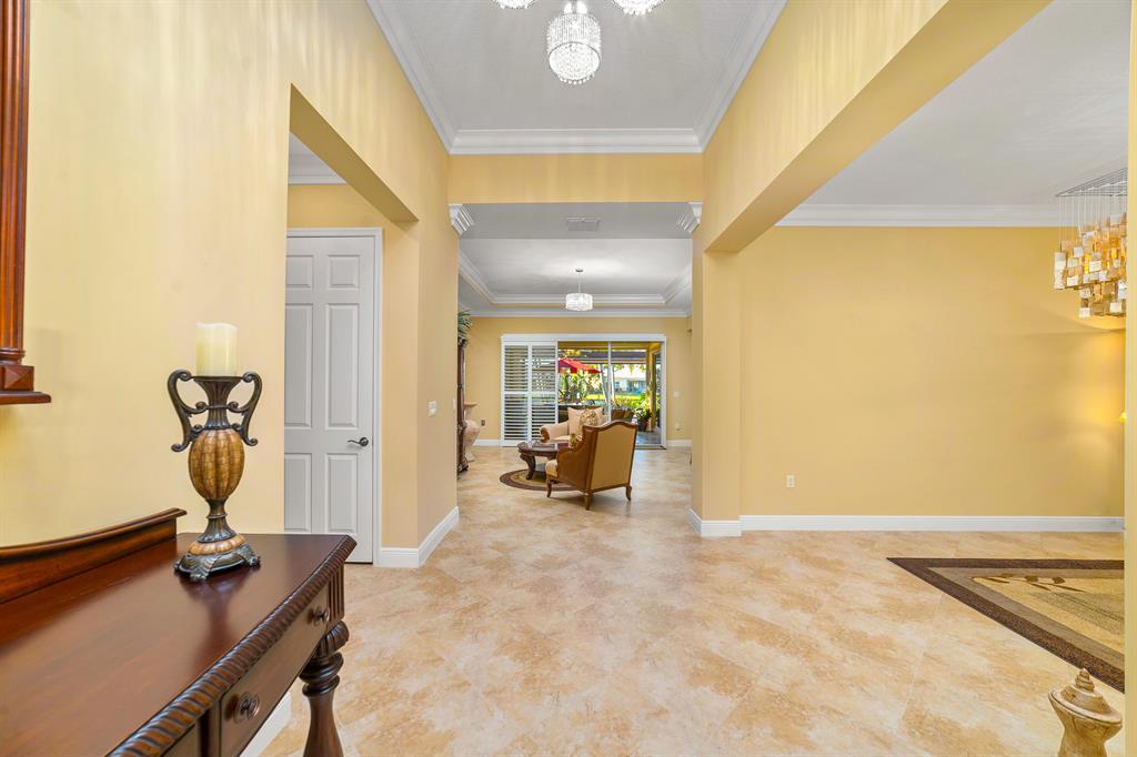 Enjoy the perfect blend of indoor and outdoor living in this phenomenal, meticulously maintained 4 bedroom plus den, 4 bathroom, 2-car garage home with breathtaking lake view! Crown moldings, recessed lights and plantation shutters throughout, tray ceilings in most rooms, and mahogany wood French front doors make the home feel elegant and open. There is neutral color tile diagonally in the living areas, engineered hardwood in the primary, one guest bedroom and den, and soft carpet in other bedrooms. The kitchen is equipped with stainless steel appliances, wall oven, glass cook top, stunning granite counter tops and backsplash, raised 42'' wood cabinets topped with moldings, stone deco wall under the bar, and a butler's pantry. The formal dining room is great for entertaining. The primary
