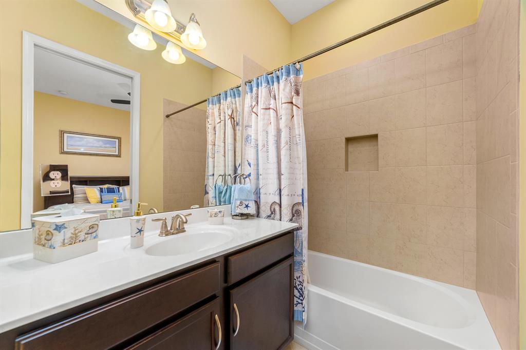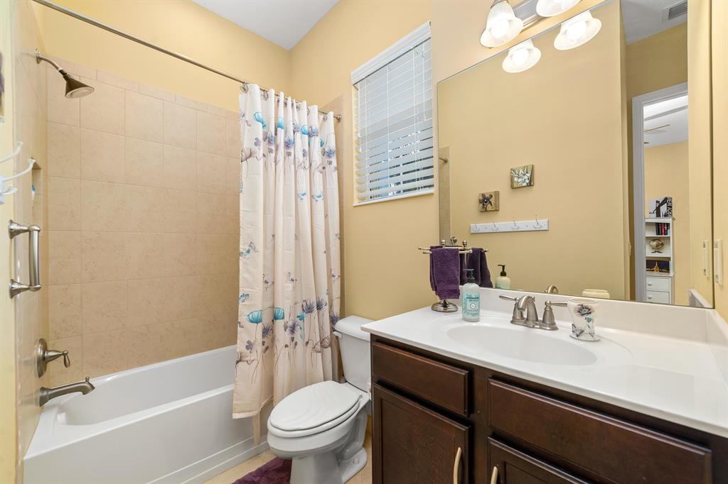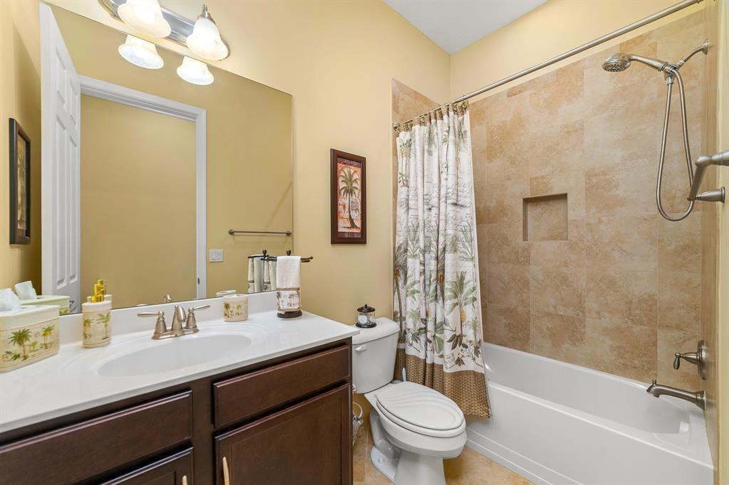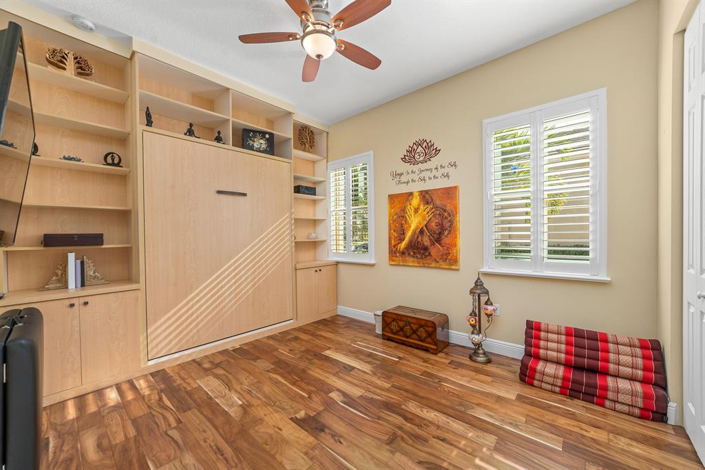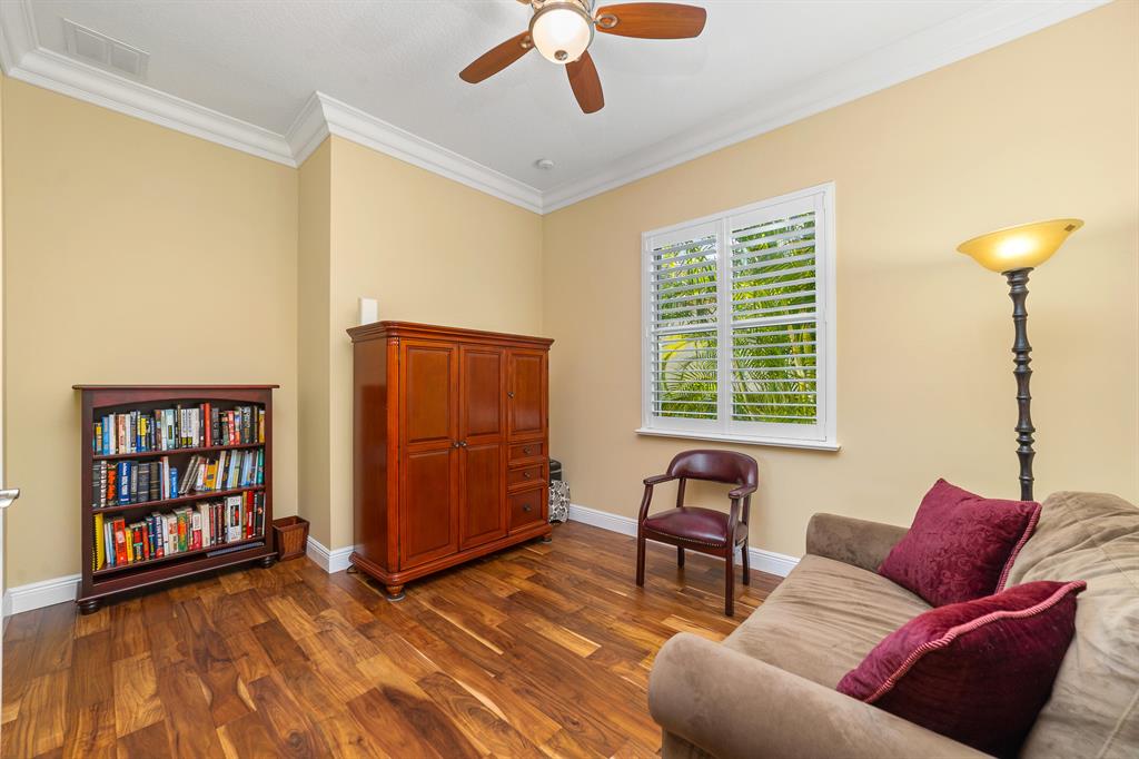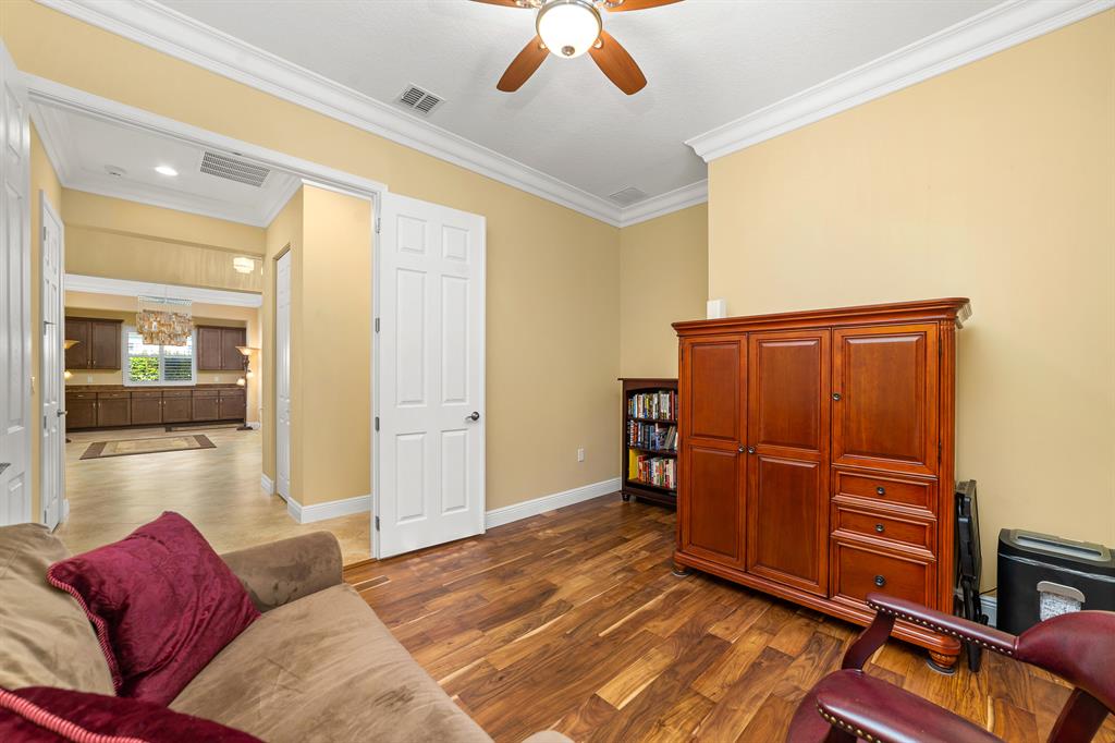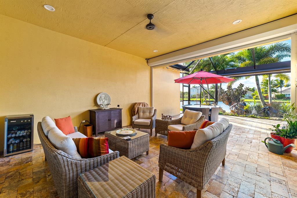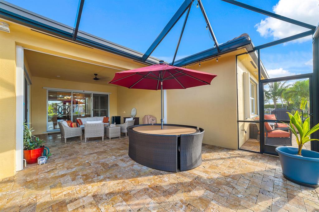 Enjoy the perfect blend of indoor and outdoor living in this phenomenal, meticulously maintained 4 bedroom plus den, 4 bathroom, 2-car garage home with breathtaking lake view! Crown moldings, recessed lights and plantation shutters throughout, tray ceilings in most rooms, and mahogany wood French front doors make the home feel elegant and open. There is neutral color tile diagonally in the living areas, engineered hardwood in the primary, one guest bedroom and den, and soft carpet in other bedrooms. The kitchen is equipped with stainless steel appliances, wall oven, glass cook top, stunning granite counter tops and backsplash, raised 42'' wood cabinets topped with moldings, stone deco wall under the bar, and a butler's pantry. The formal dining room is great for entertaining. The primary
