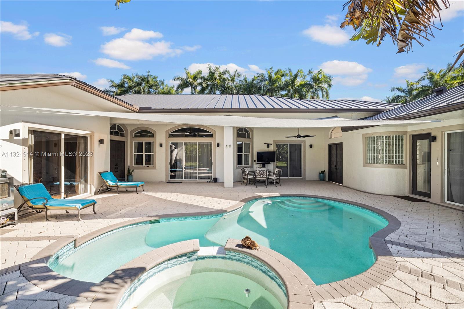 Welcome to your Weston oasis! This 4 bedroom 3 bath home is located with easy access to major roads and great schools. Enjoy the beautiful Saddle Club Estates neighborhood and low HOA fees. This courtyard style home features a large patio around the pool that is perfectly shaded by palm trees. The home features a guest suite with private entrance next to the pool. The primary bedroom across the courtyard features a sliding door to enjoy the pool views. Great schools. Enjoy 12 foot ceilings in the main house house with wonderful natural light throughout the home. A new standing seam metal roof installed in 2021. This energy efficient home features 14.5kW solar panel system, LED lights, smart controls, and a new efficient hybrid water heater.