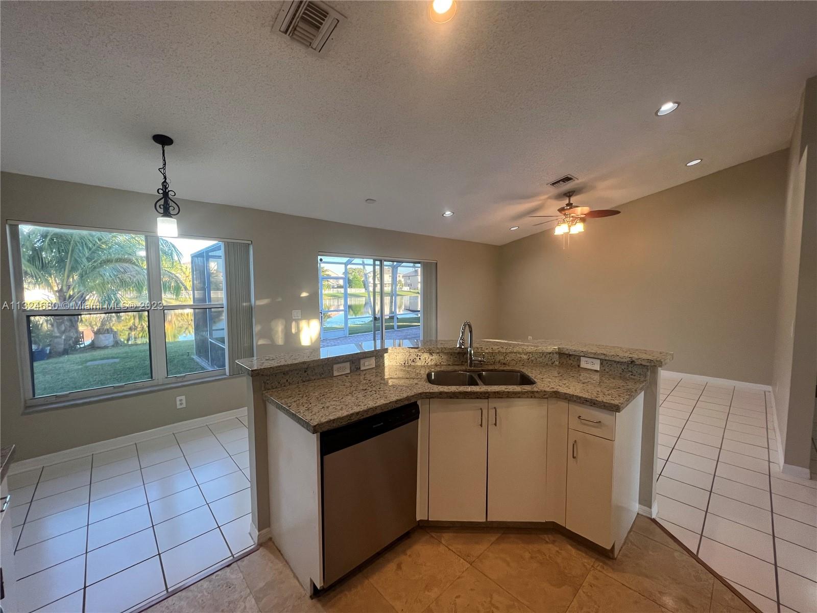 Your search is over! Offering the natural indoor-outdoor balance of a Mediterranean home, this 4-bedroom, 2.5-bathroom water front home is found in the Coconut Sound community. The surrounding area, Silver Lakes at Pembroke Pines, is prized by locals and by home buyers. The property features an open layout, neutral decor, and vaulted ceilings. Expansive kitchen brims with natural light, attractive peninsula layout, and granite counters. Beyond tranquility, the well-appointed main-floor master bedroom includes a walk-in closet, sitting space, and soaking bath with step-in shower. The other 3 bedrooms, are unique, quiet, and designed with plenty of wardrobe storage. Attached two-car garage. Enjoy entertaining in your screened in patio. You'll want your offer to be competitive and quick.