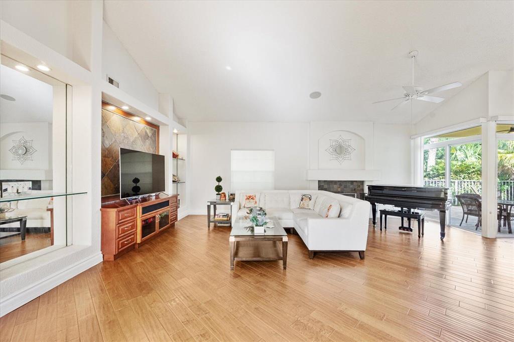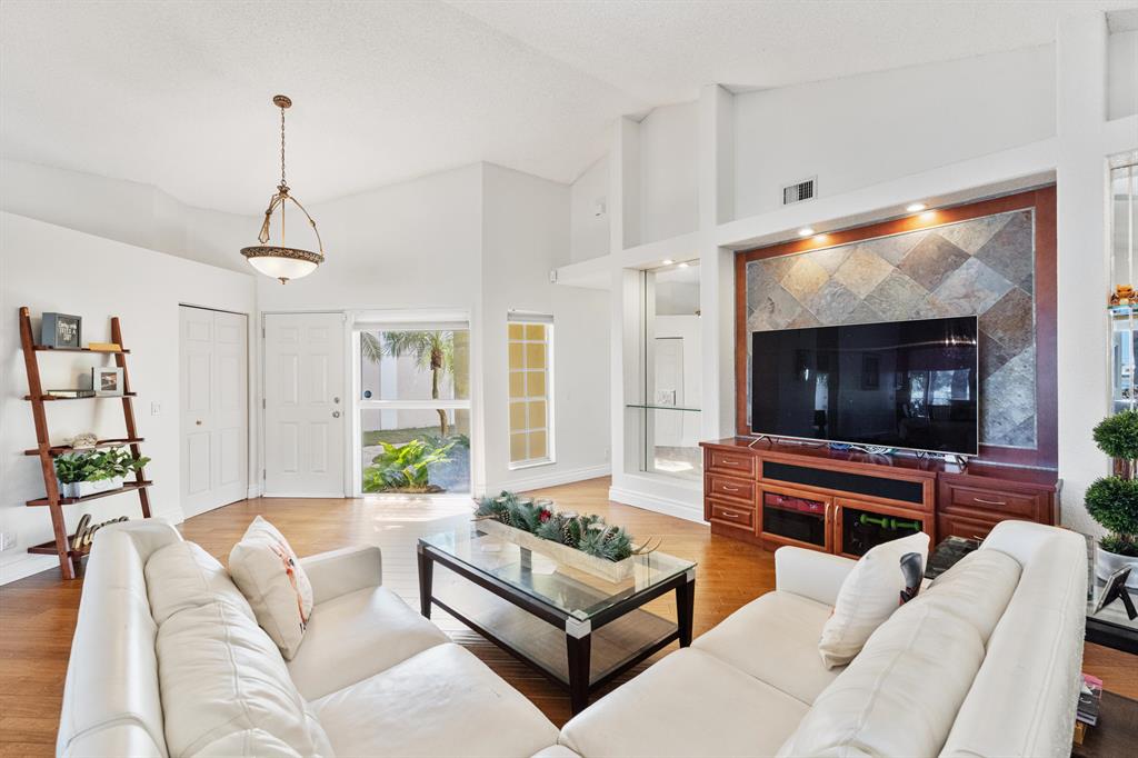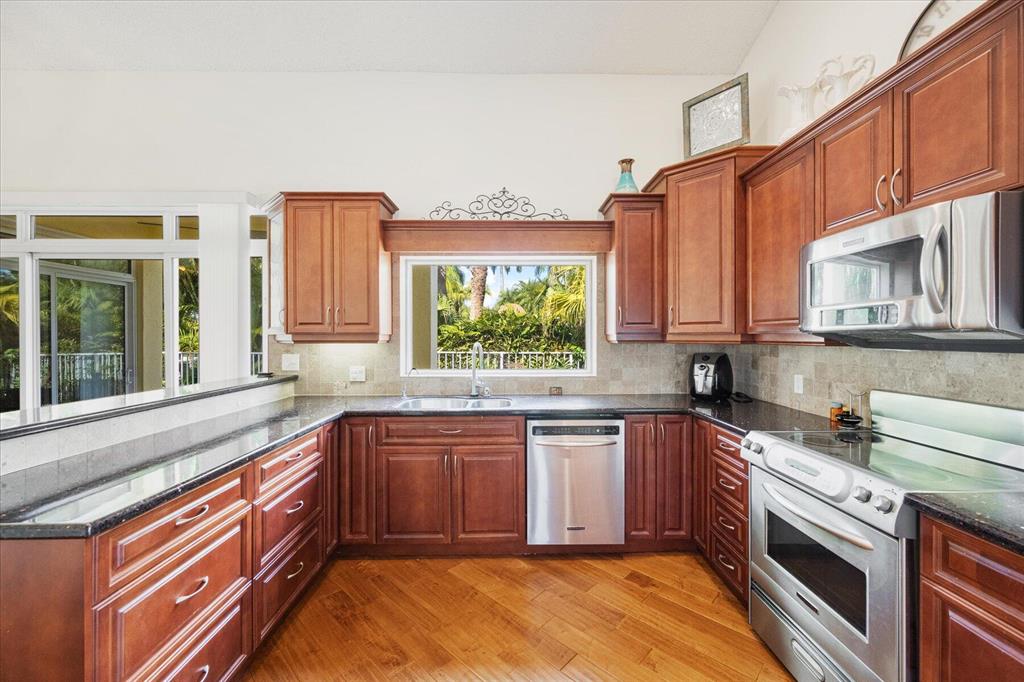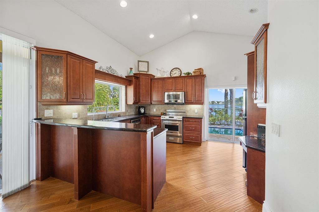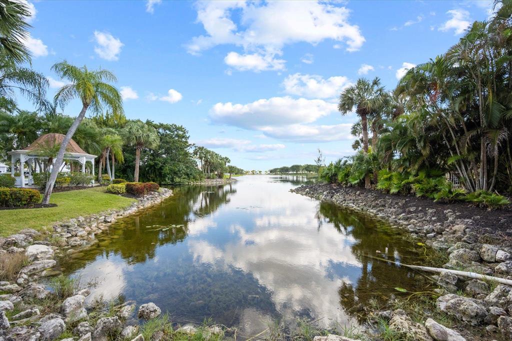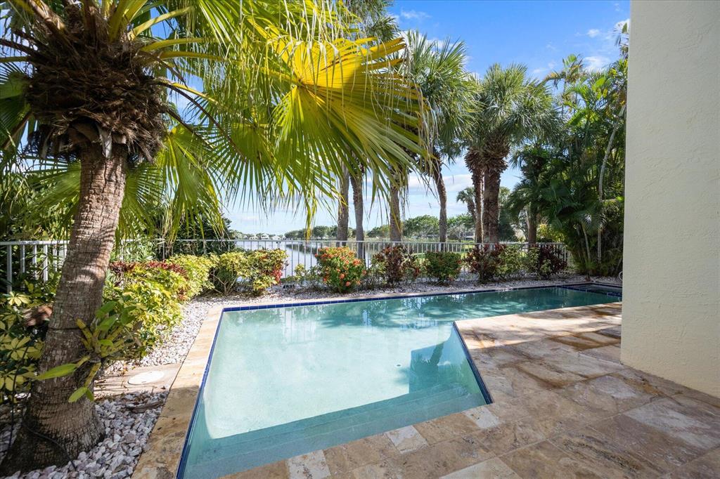 Best location with water on 2 sides in The Colony at Breakers West in West Palm Beach! Located on cul-de-sac street with just 12 houses, this lovely 2BR, 2BA home has open Great Room floor plan with vaulted ceilings and fireplace as well as warm engineered wood floors thru out. The open Kitchen has solid wood cabinetry and Kitchenaid stainless steel appl. Spacious Master Suite with vaulted ceilings overlooks with pool and boasts a marble Master bath with 2 sinks, huge walk-in marble shower w/frameless enclosure & custom fitted walk-in closet. Bedroom 2 also has a marble bath and opens to private courtyard patio. Opening from Great Room, Kitchen and Master Bedroom is a beautiful marble stone patio with its own private lap pool surrounded by lush landscaping, long lake views