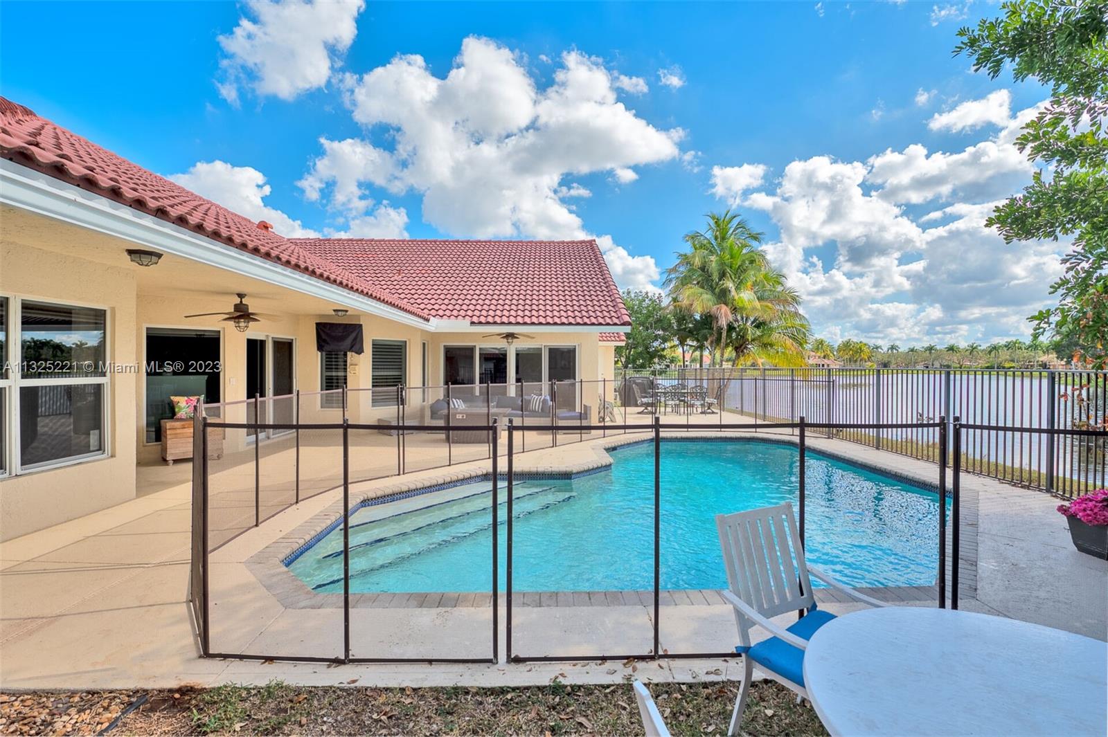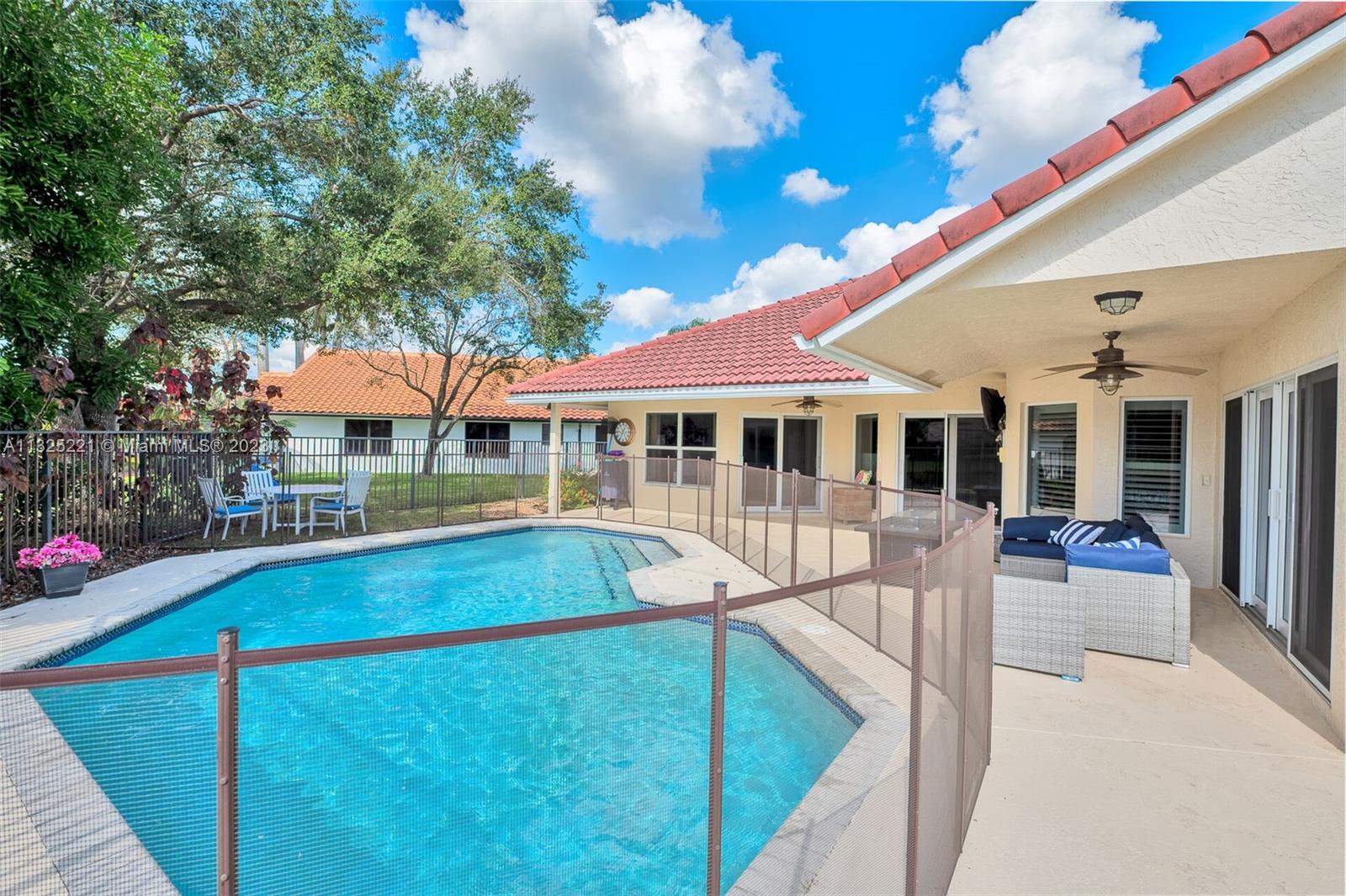 The PERFECT family home to make your own. This home boasts a 4 bedroom, triple split floor plan with 3 bathrooms, and a generous covered patio with extended lake views. Gorgeous sunsets over the pool. Newer roof, freshly painted walls inside/out and impact windows throughout. Located within the neighborhood of Tequesta, within walking distance to the park and 24hr manned gate. Perfect for todays buyers who are craving a perfect outdoor area for entertaining.
