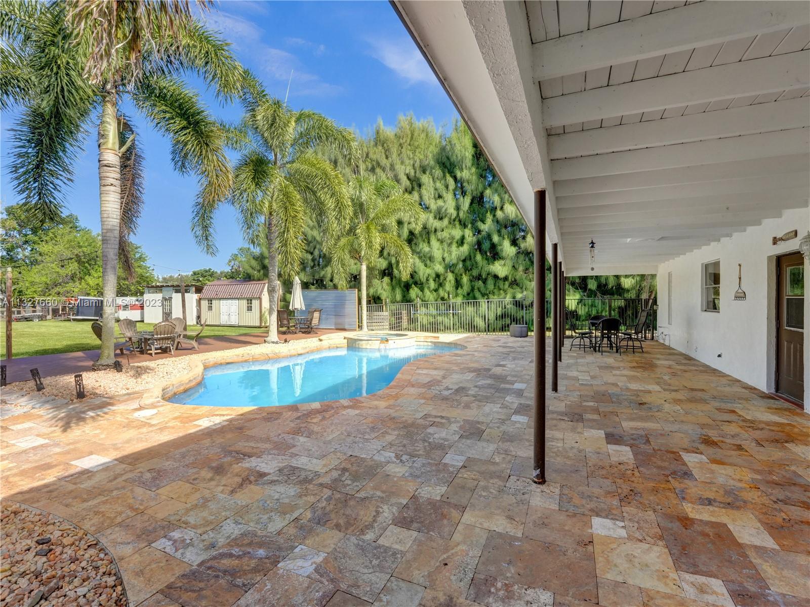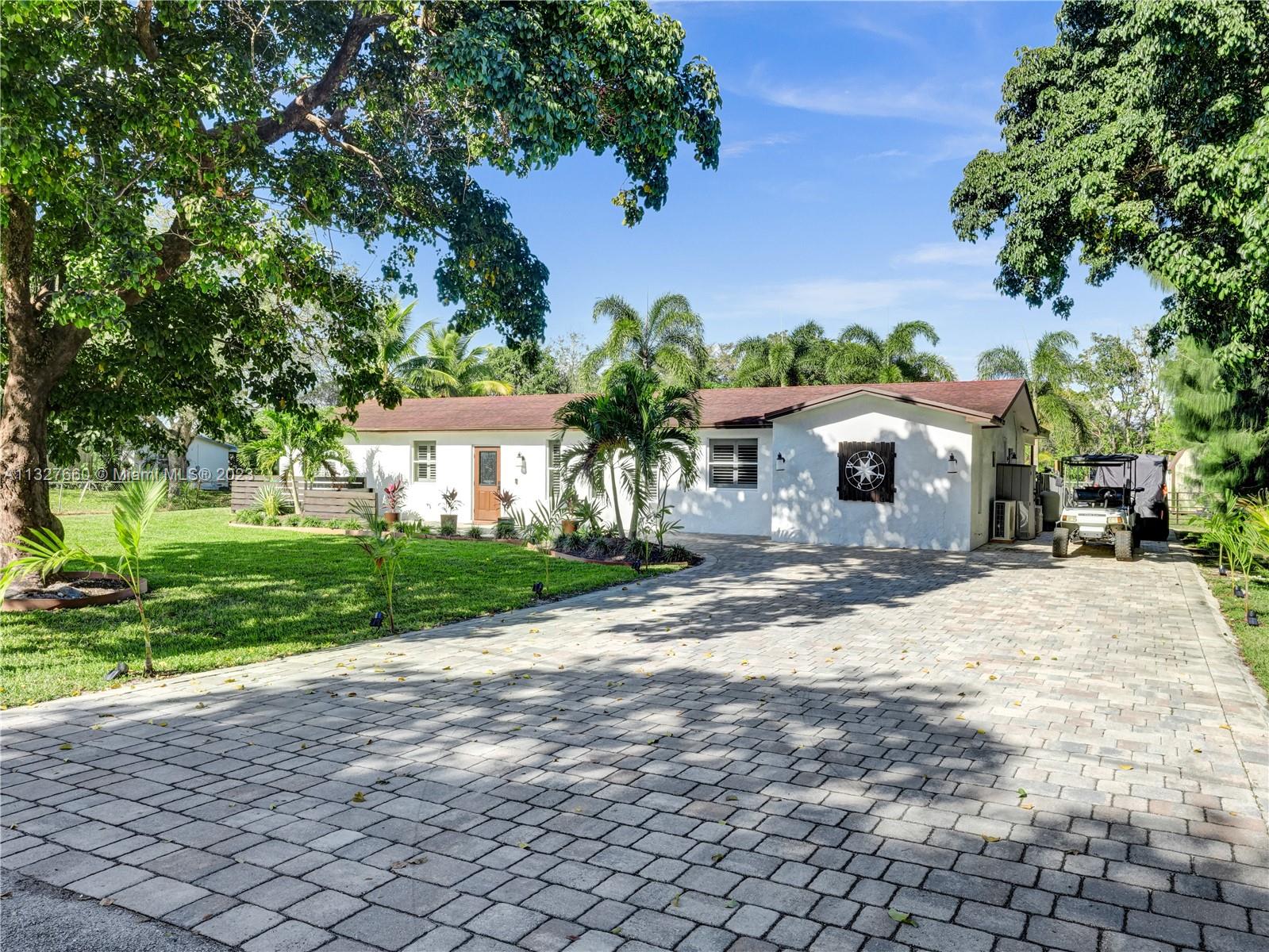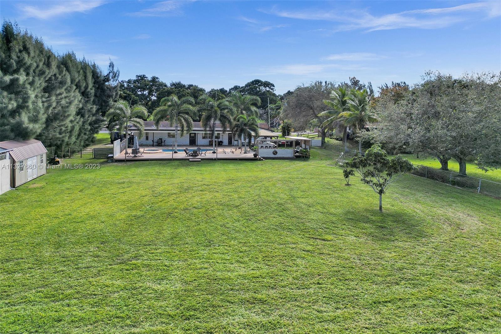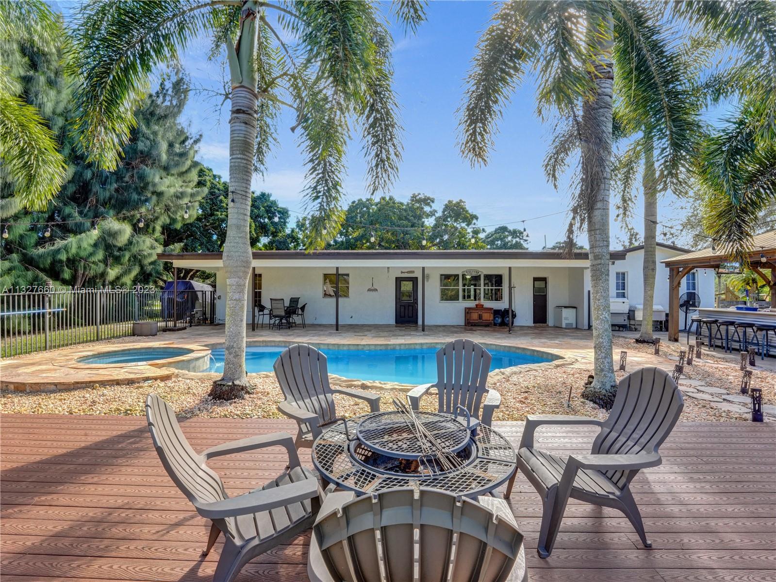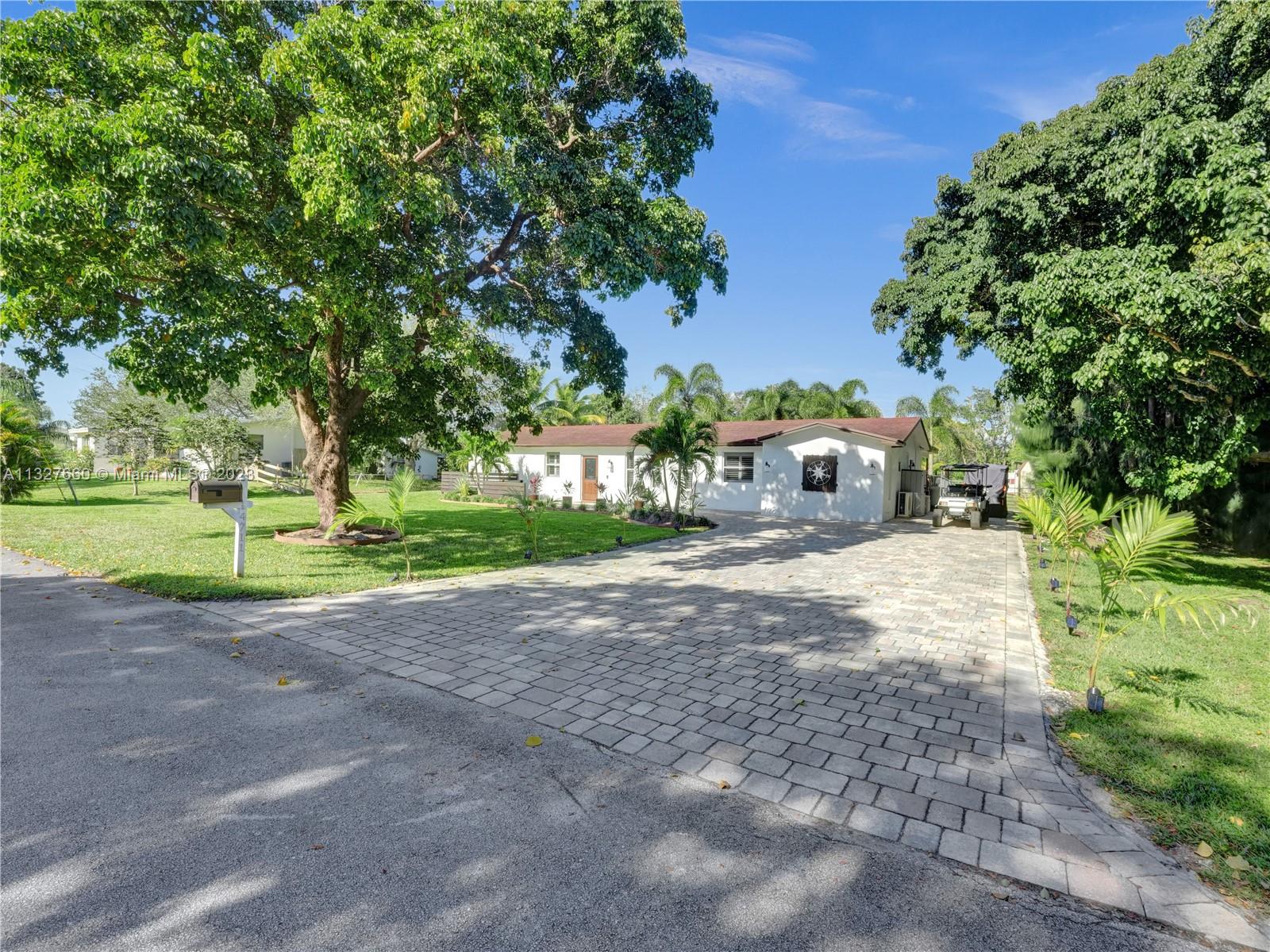 This Tastefully upgraded open floor plan suits most Buyers needs from inside and out. There are 2 Primary bedrooms and one is perfect as a Mother-in-Law suite that has a private side entrance. The backyard is your own serene oasis which features a free form Saltwater pool with chlorinator outlined with travertine marble pavers, a large deck leading to the Free-Standing Bar area and platform for entertainment. New flooring 2022. Situated on over 38,000sf with 2 barns in back which was previously used for Jumping goats. NO HOA & Plenty of storage area with 2 large sheds and ample room on the side to store all your toys (RV, Jet skis, Golfcart, Boat, etc). Ideal for any large gathering with open green space and covered patio. Minutes to Sawgrass Mills Outlet mall & All Major highways.