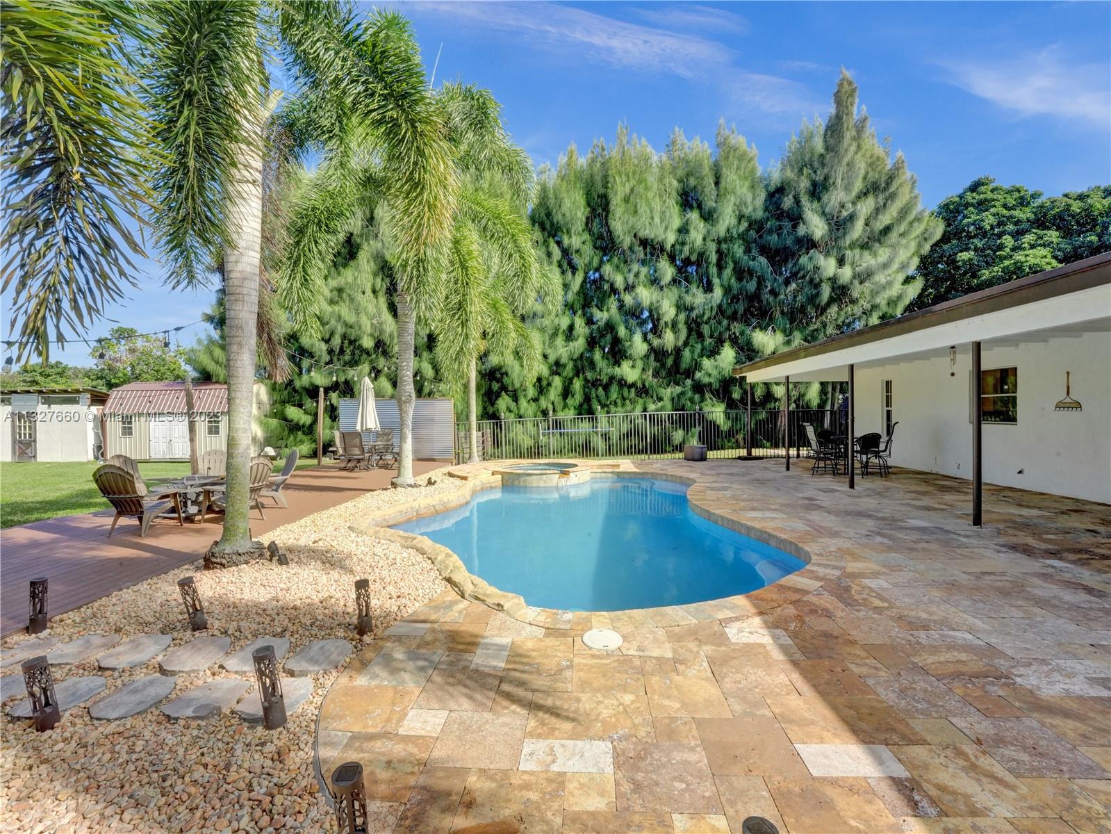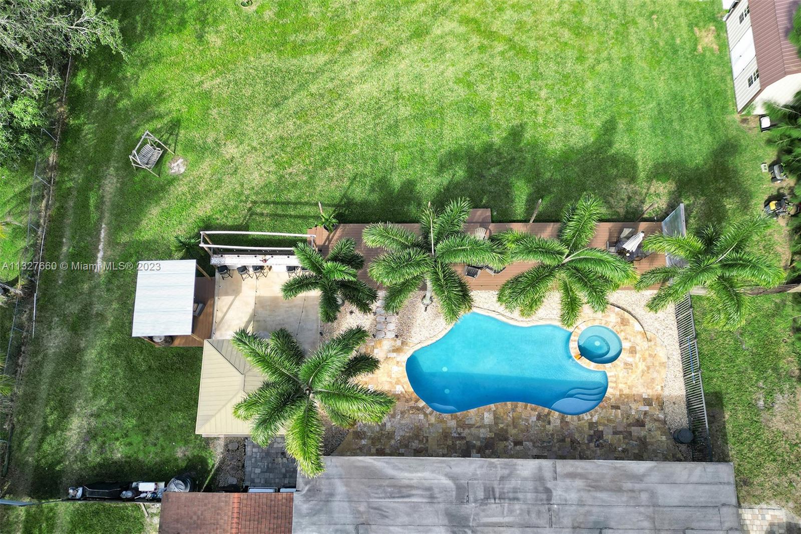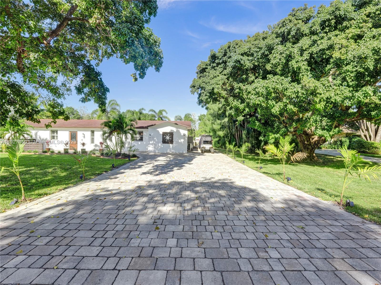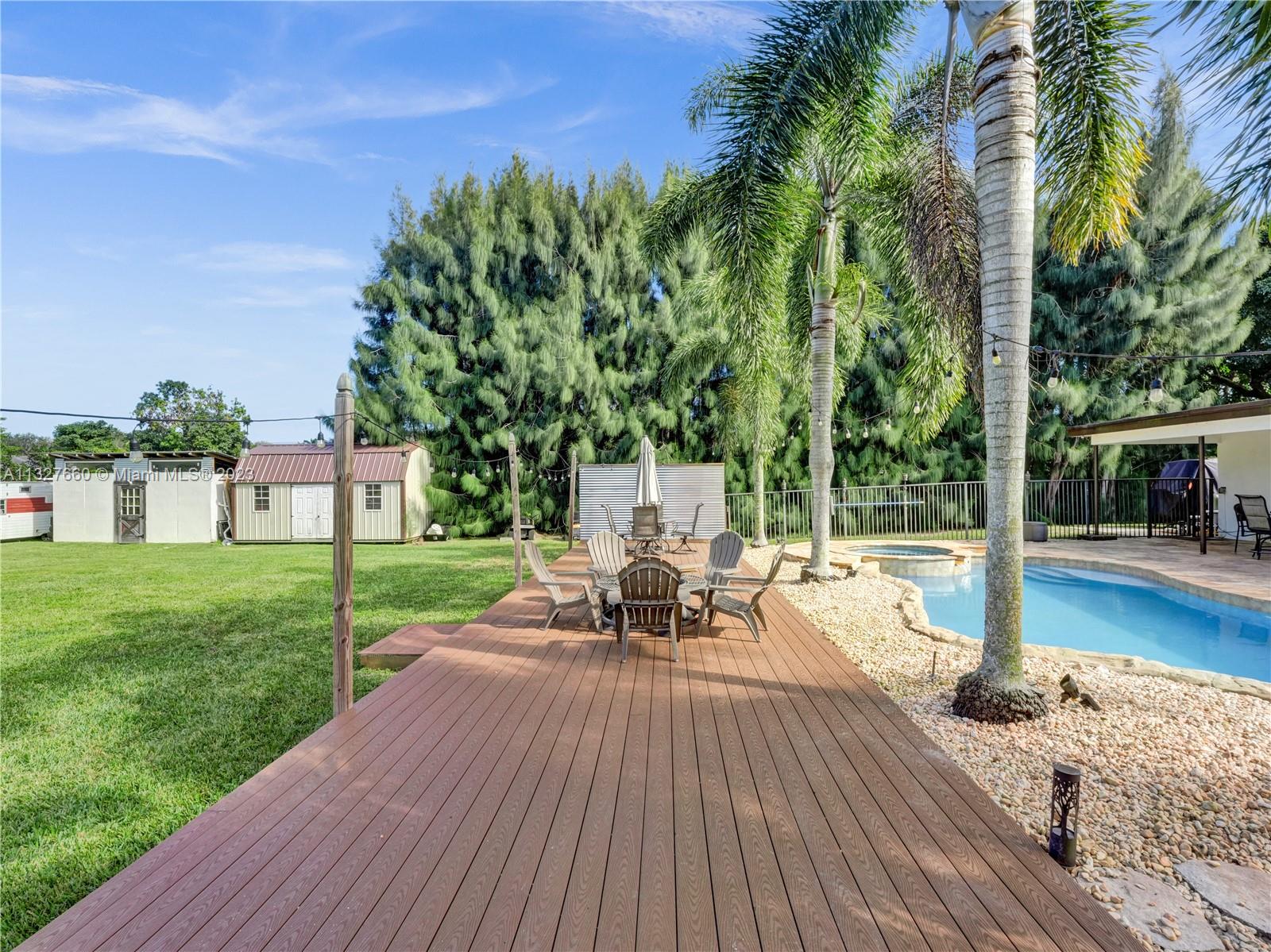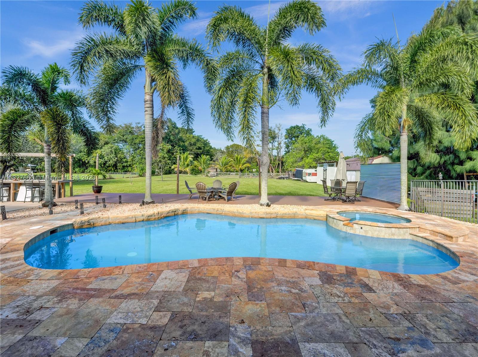 This Tastefully upgraded open floor plan suits most Buyers needs from inside and out. There are 2 Primary bedrooms and one is perfect as a Mother-in-Law suite that has a private side entrance. The backyard is your own serene oasis which features a free form Saltwater pool with chlorinator outlined with travertine marble pavers, a large deck leading to the Free-Standing Bar area and platform for entertainment. New flooring 2022. Situated on over 38,000sf with 2 barns in back which was previously used for Jumping goats. NO HOA & Plenty of storage area with 2 large sheds and ample room on the side to store all your toys (RV, Jet skis, Golfcart, Boat, etc). Ideal for any large gathering with open green space and covered patio. Minutes to Sawgrass Mills Outlet mall & All Major highways.