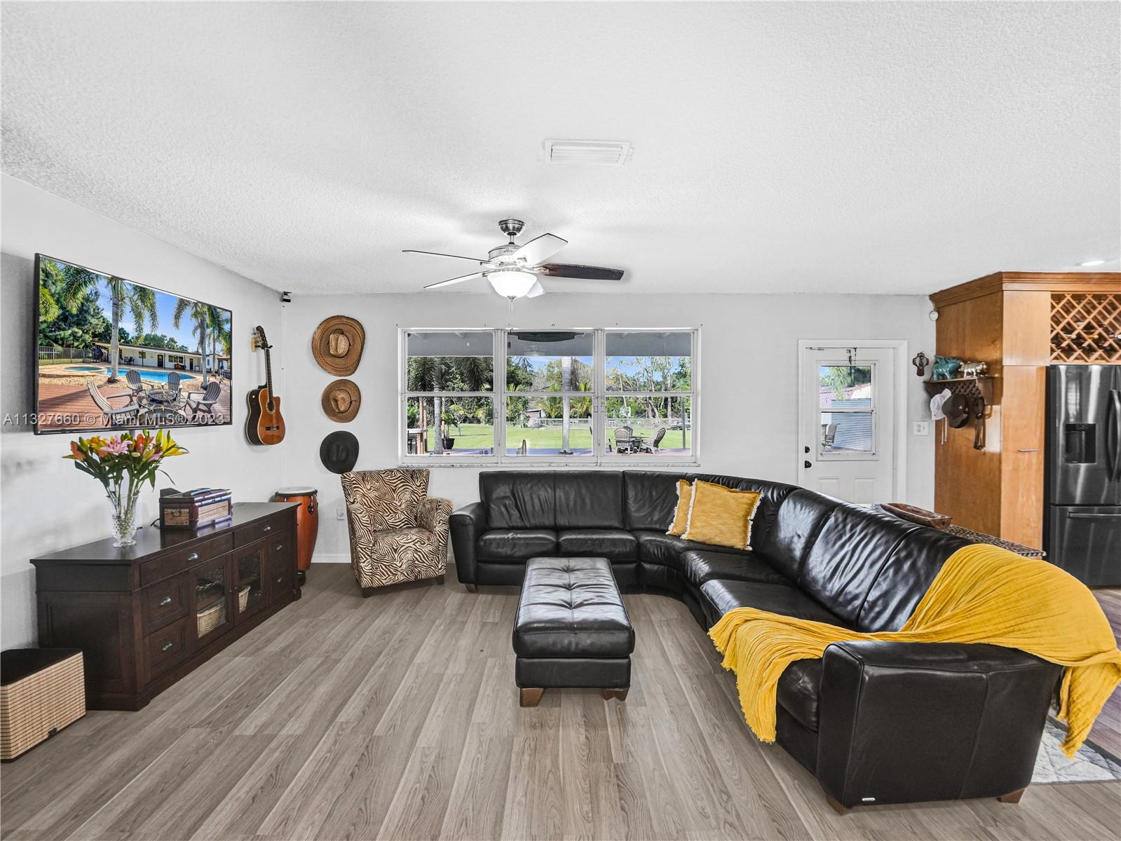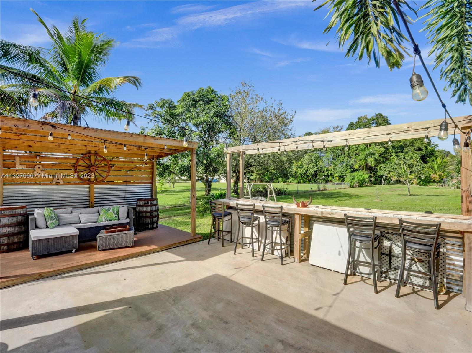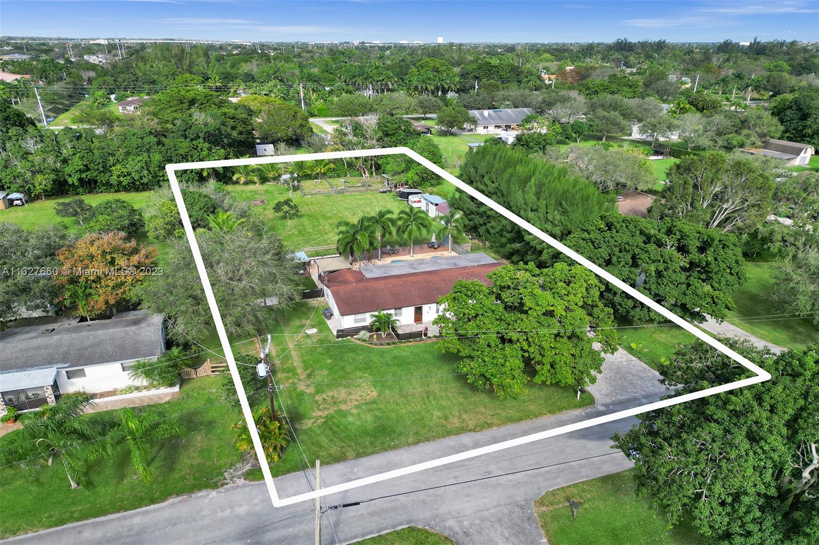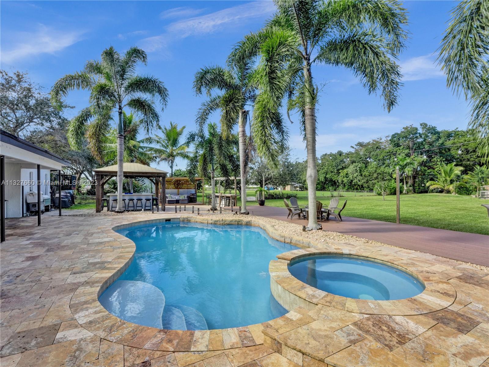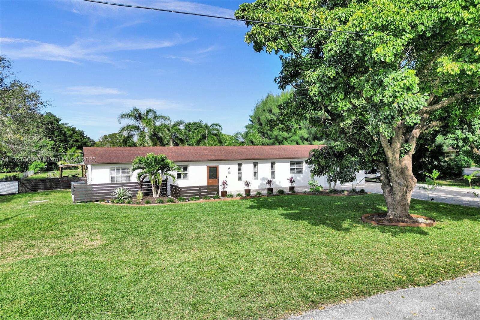 This Tastefully upgraded open floor plan suits most Buyers needs from inside and out. There are 2 Primary bedrooms and one is perfect as a Mother-in-Law suite that has a private side entrance. The backyard is your own serene oasis which features a free form Saltwater pool with chlorinator outlined with travertine marble pavers, a large deck leading to the Free-Standing Bar area and platform for entertainment. New flooring 2022. Situated on over 38,000sf with 2 barns in back which was previously used for Jumping goats. NO HOA & Plenty of storage area with 2 large sheds and ample room on the side to store all your toys (RV, Jet skis, Golfcart, Boat, etc). Ideal for any large gathering with open green space and covered patio. Minutes to Sawgrass Mills Outlet mall & All Major highways.