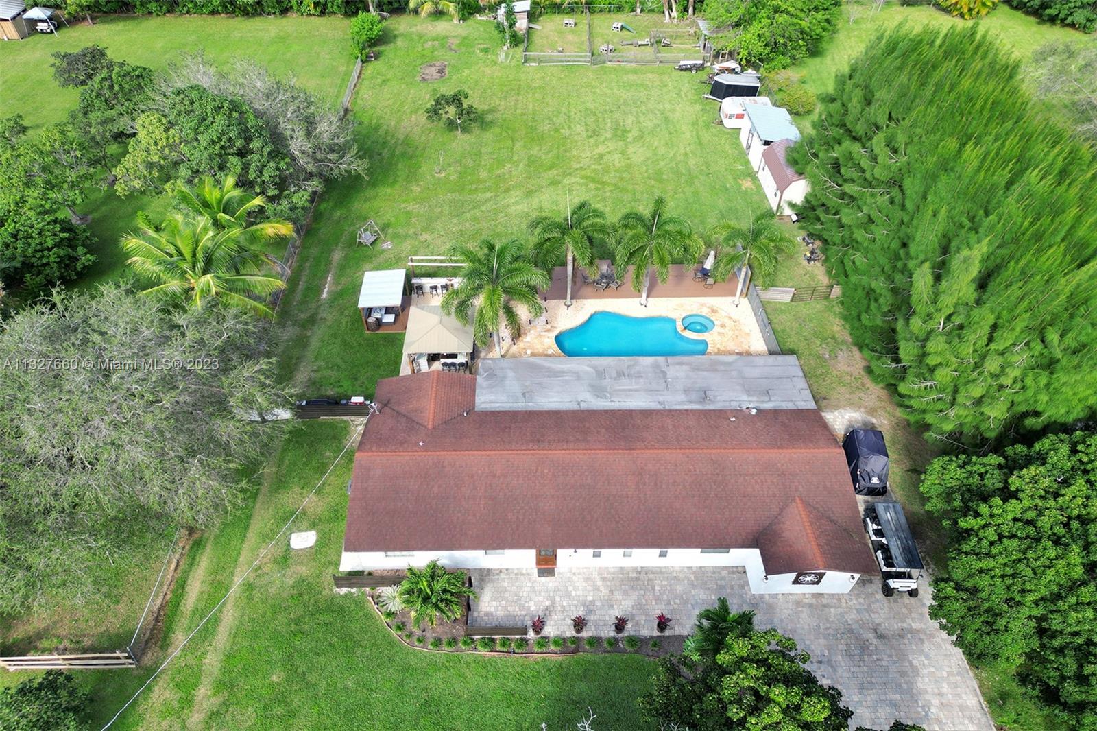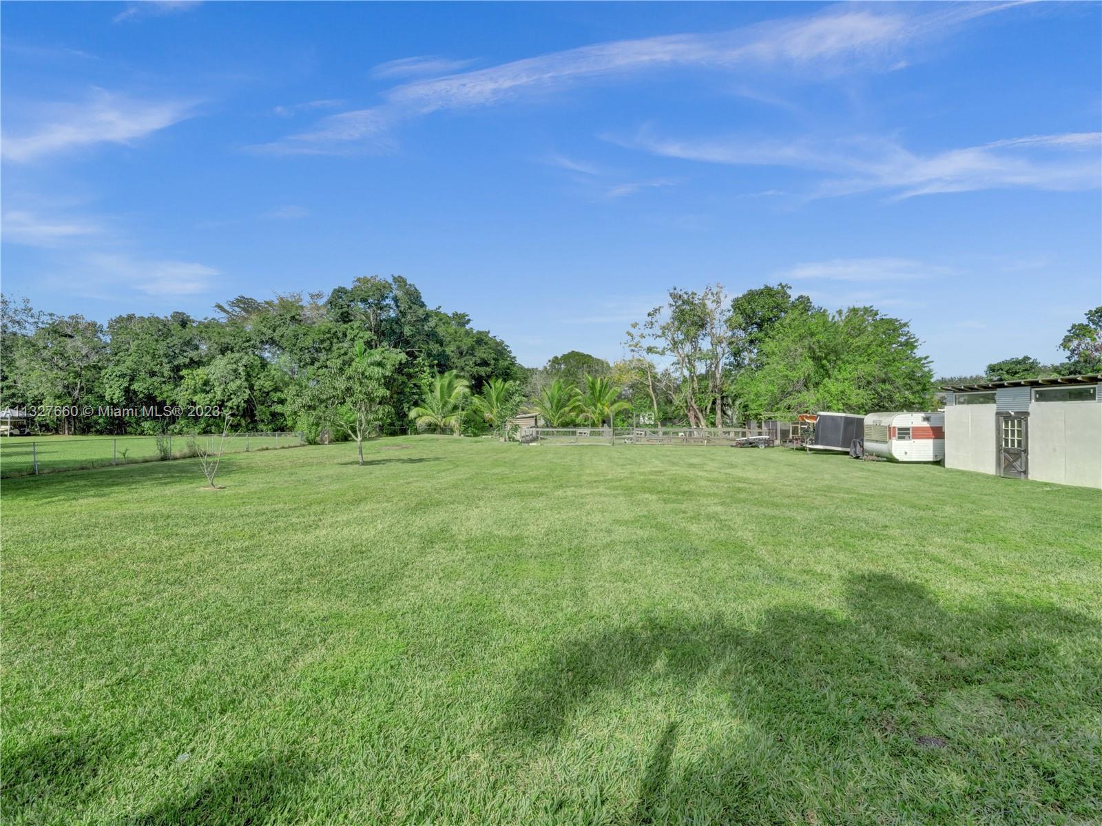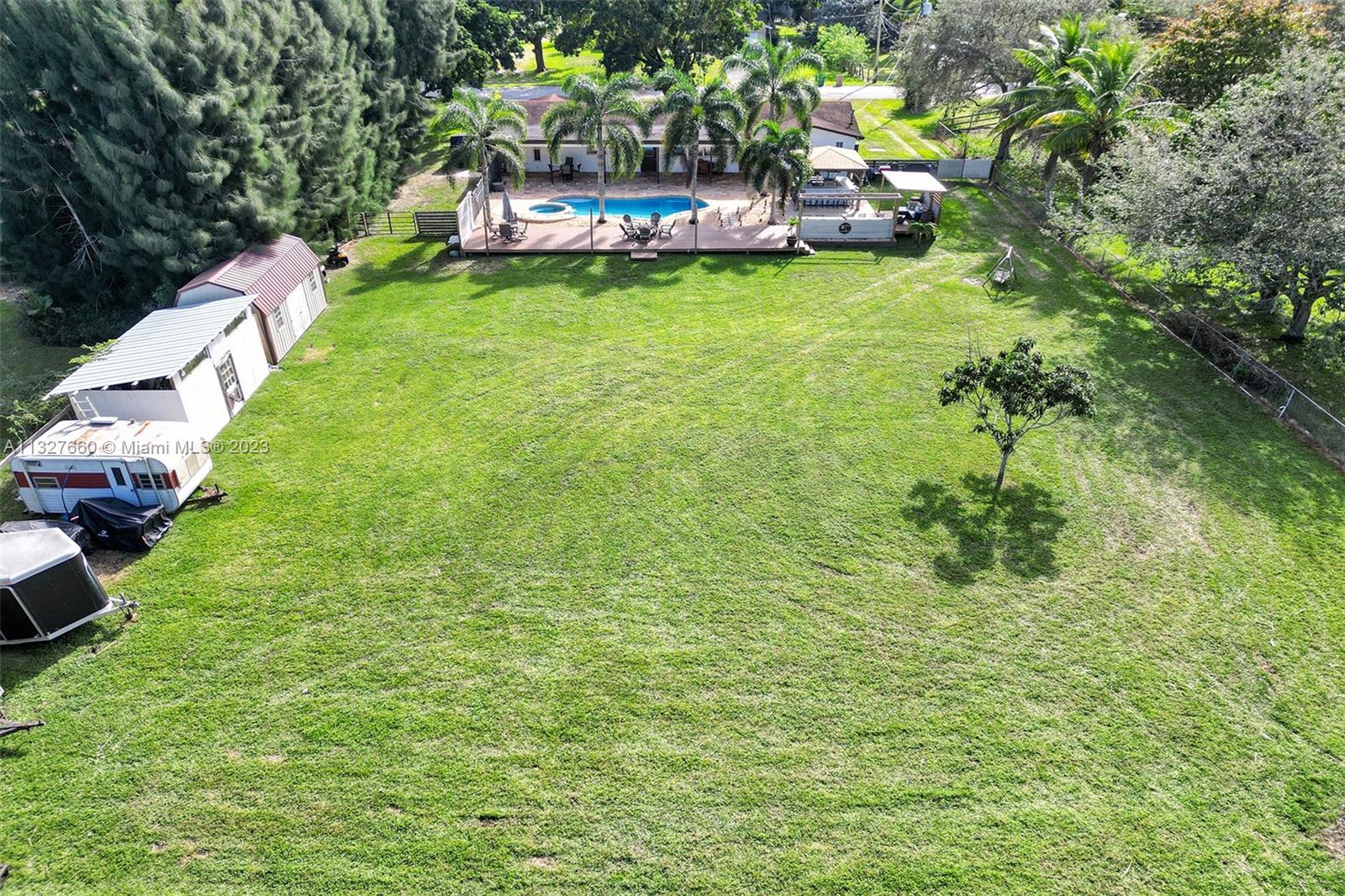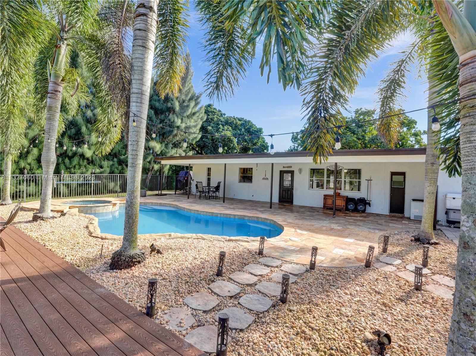 This Tastefully upgraded open floor plan suits most Buyers needs from inside and out. There are 2 Primary bedrooms and one is perfect as a Mother-in-Law suite that has a private side entrance. The backyard is your own serene oasis which features a free form Saltwater pool with chlorinator outlined with travertine marble pavers, a large deck leading to the Free-Standing Bar area and platform for entertainment. New flooring 2022. Situated on over 38,000sf with 2 barns in back which was previously used for Jumping goats. NO HOA & Plenty of storage area with 2 large sheds and ample room on the side to store all your toys (RV, Jet skis, Golfcart, Boat, etc). Ideal for any large gathering with open green space and covered patio. Minutes to Sawgrass Mills Outlet mall & All Major highways.