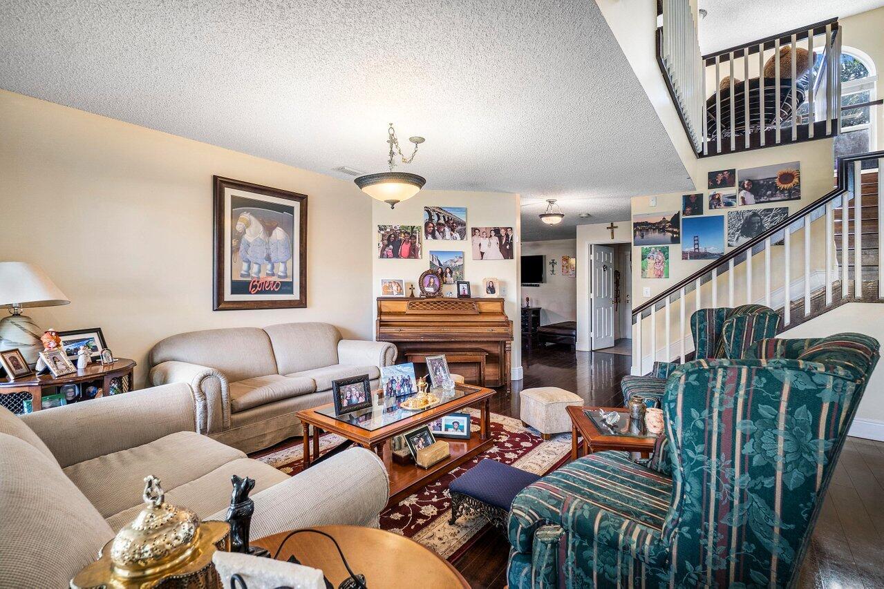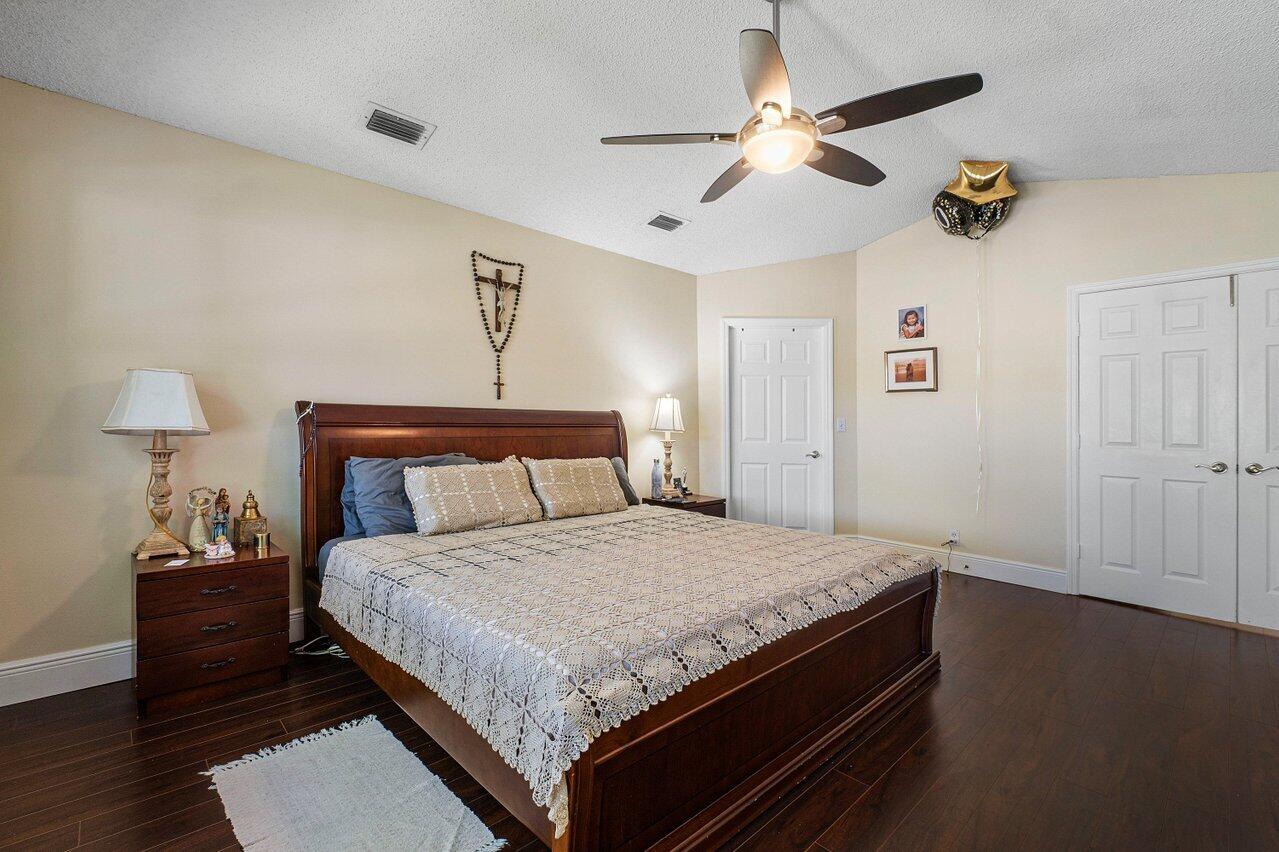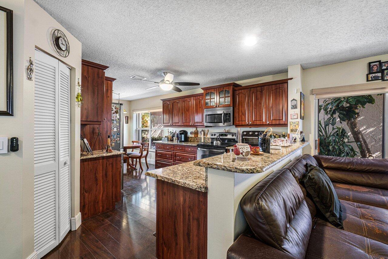 Stunning Home in La Vida Boca Raton. 4 bedrooms and 2.5 bathrooms. You cannot miss seeing this one. When you walk into you cannot help but notice the abundance of natural light, the high vaulted ceilings, and the beautiful flooring throughout (installed in 2015). Open concept living and dining room with a wall of sliding doors out to the covered patio. The kitchen has granite countertops and stainless-steel appliances with natural light coming through many windows. A lovely breakfast nook looks out on the private back yard through sliding glass doors. All of the bedrooms are upstairs and have the same flooring as the first floor. The master bedroom is spacious, and the bathroom is very thoughtfully done with dual sinks, a spa tub, and separate shower. more . . .