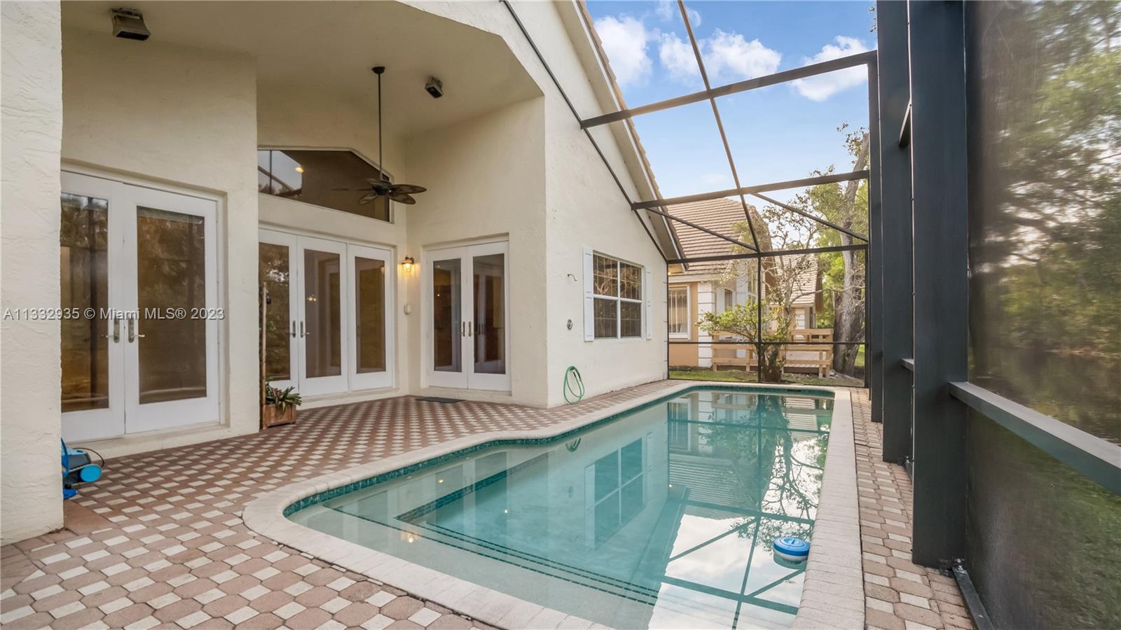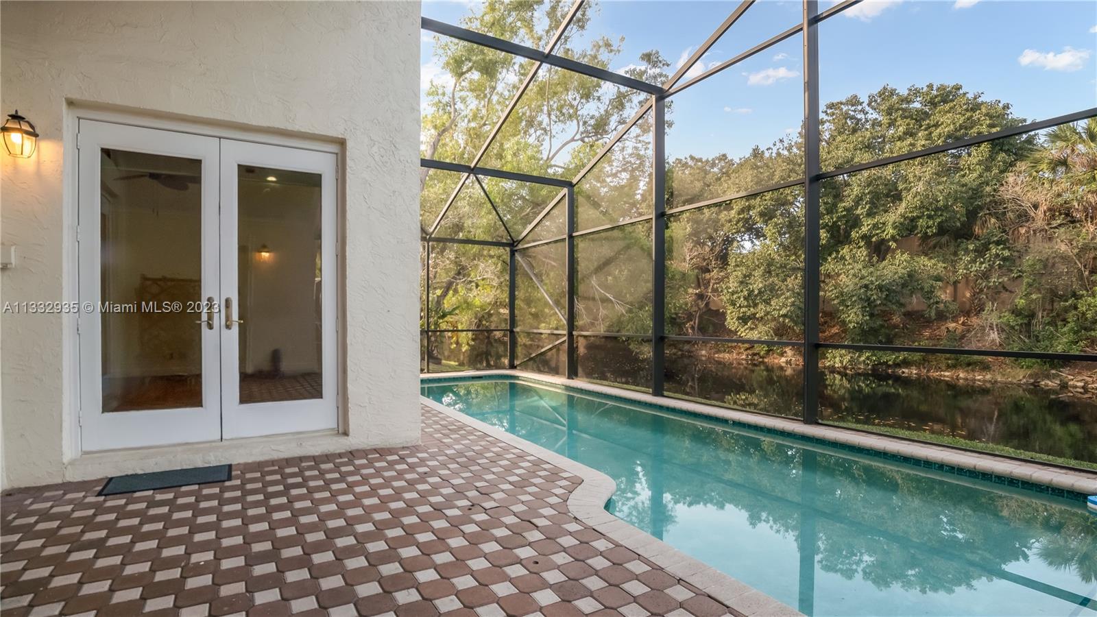 Beautifully appointed home in sought-after Eagle Trace. 3 bedrooms, 2 baths & 2 car garage, pool home on the water. Top of the line Dacor & Sub-Zero stainless steel appliances, brazilian granite countertops & decor accent lighting. This home features a new roof, spectacular volume & vaulted ceiling in the main areas. Real wood flooring in the living room, dining room, family room & master bedroom, plantations shutters, french doors, custom closet & more! Pool area w/beautifully kept pavers, screened & very private backyard - no neighbors behind! Prestigious community exquisitely manicured. Features guard gate, recreation community ctr/clubhouse, comm. pool, golf club, pickleball, basketball & tennis courts, playground, walk paths & bike racks. Listing subject to errors and omissions.