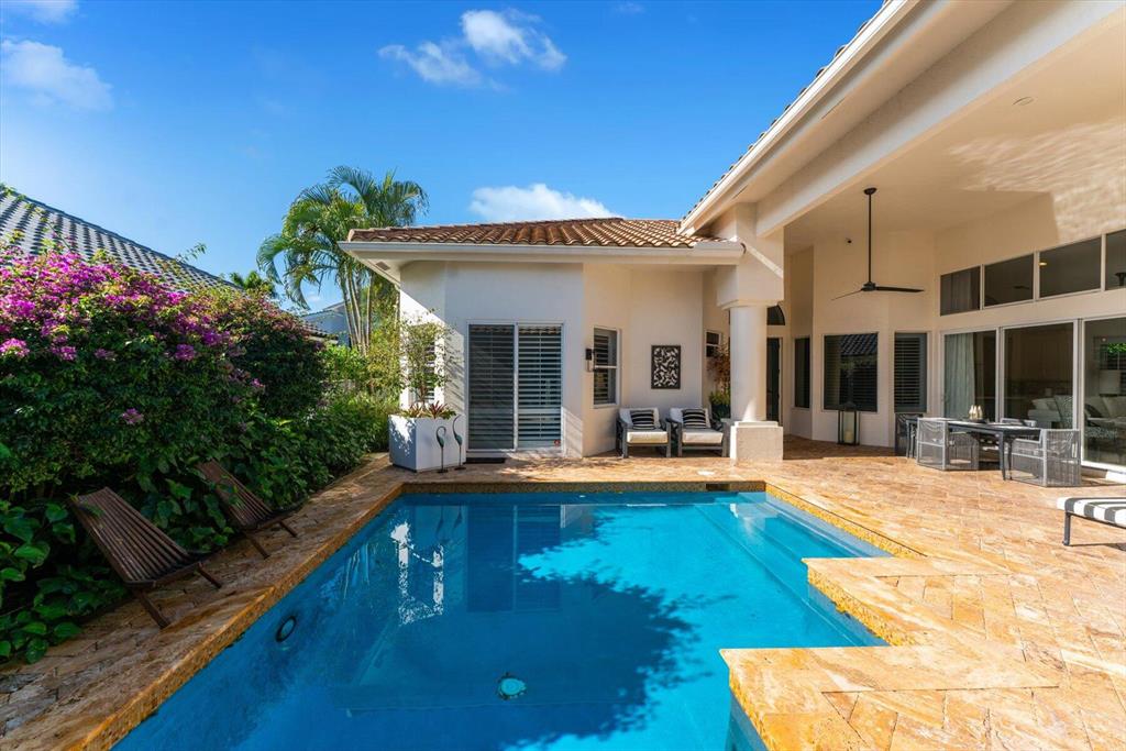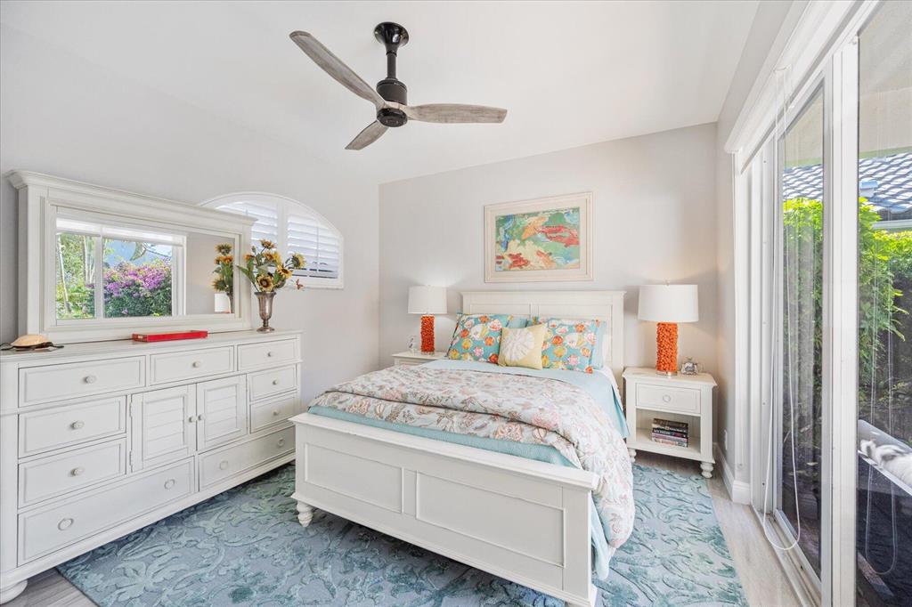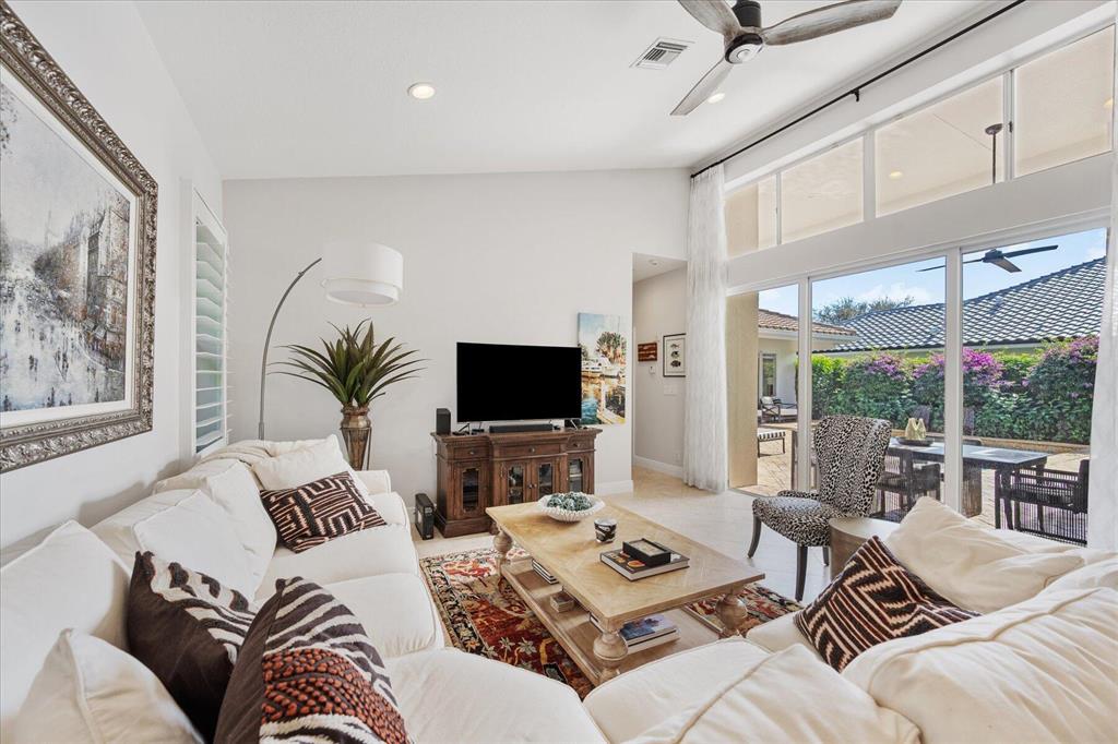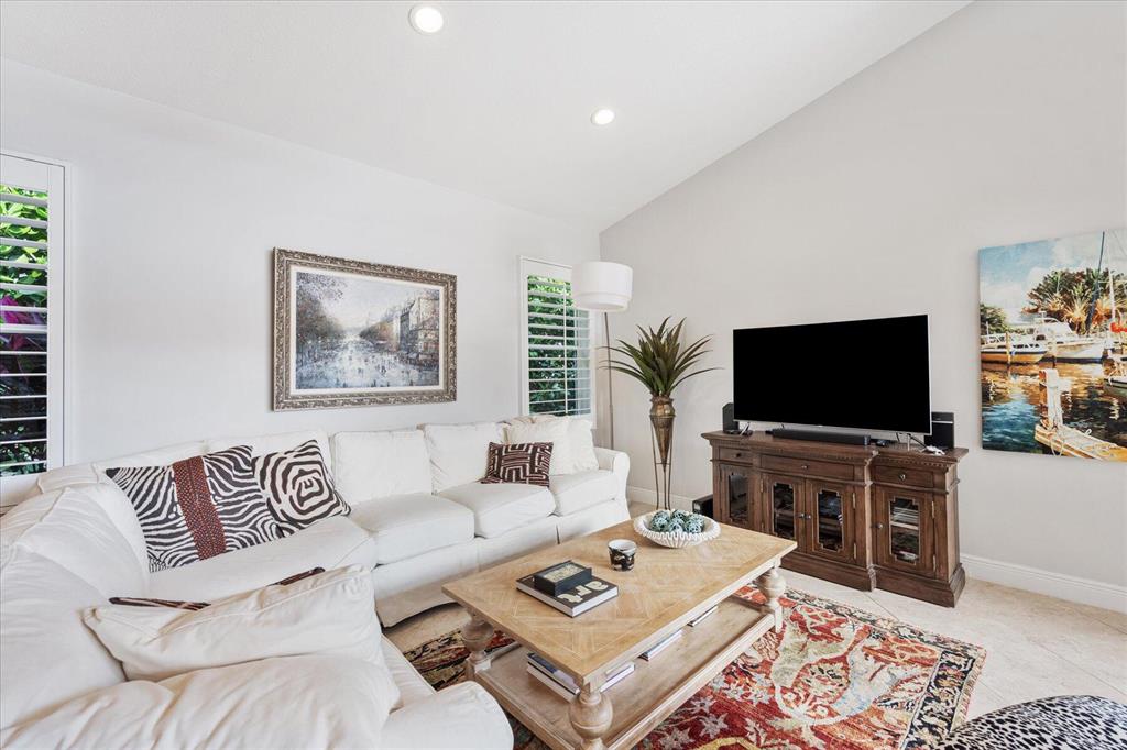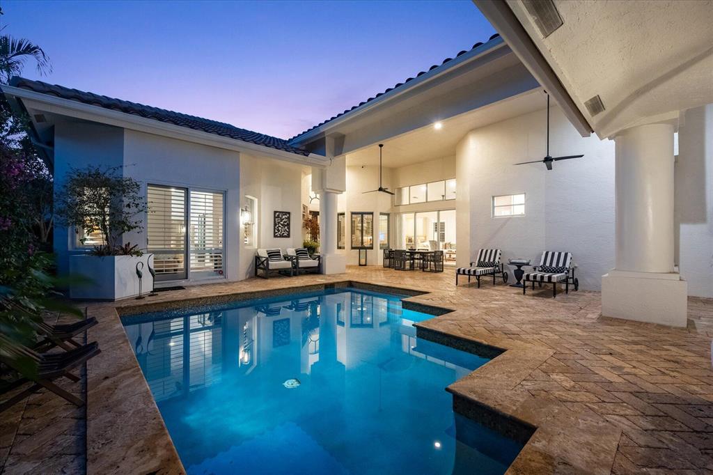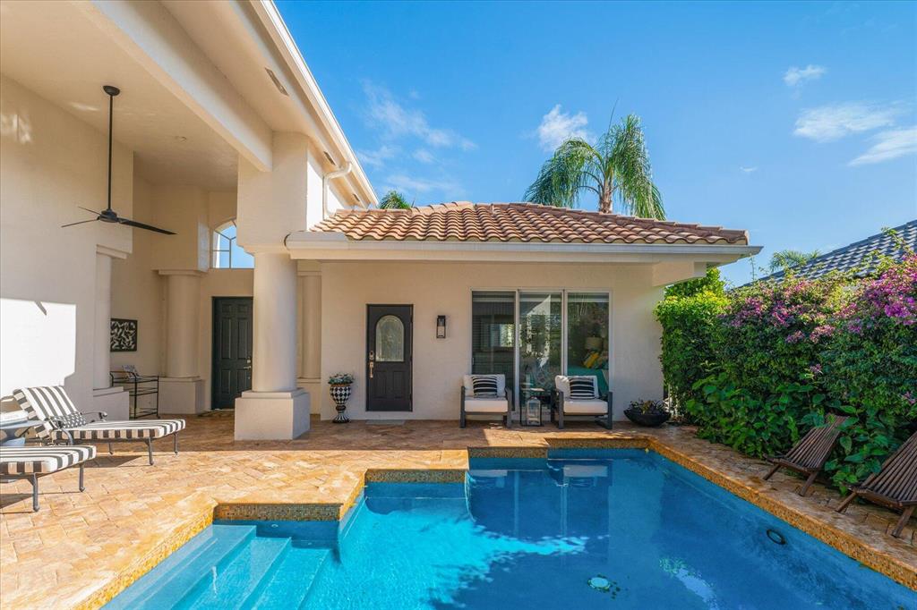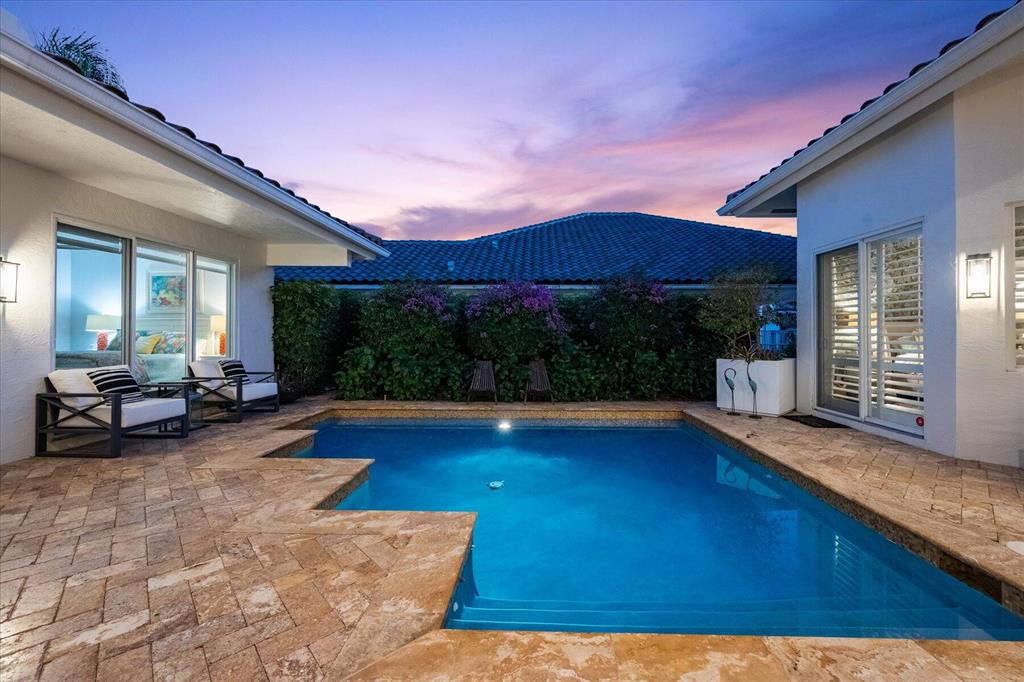 Private & beautiful one story courtyard home w/ a heated saltwater pool. Main house is 2 BR/2.5BA plus a 1 BR/1BA guest house, ideal for a student, in-law, or an office. Open floorplan with split bedrooms, high ceilings and many updates including renovated bathrooms, tile floors, open family room to the kitchen with a breakfast area, Newer appliances; a Viking refrigerator, Samsung range and a Maytag dishwasher, Hurricane sliders, Travertine marble pavered courtyard and driveway. Roof is only 7 years old. Spacious master bedroom suite w/ two Large walk in closets and a grand bathroom with a free standing tub, walk in shower and separate vanities. Nice laundry room w/ Samsung front loader washer & dryer and sink. Security System and Yale locks. Club membership is optional!!