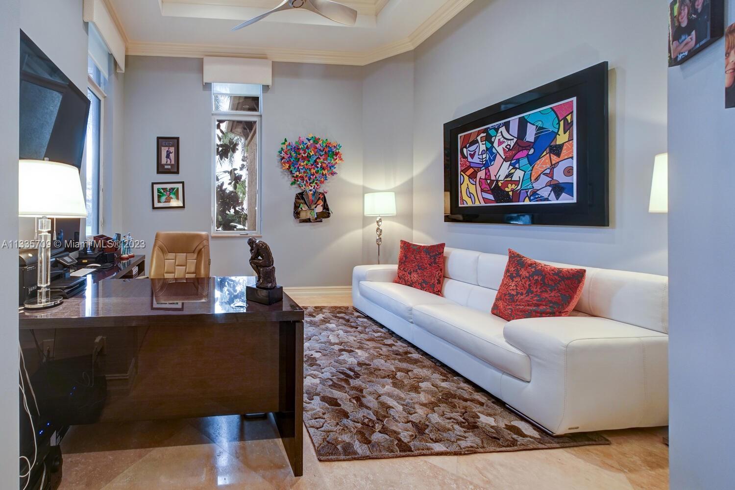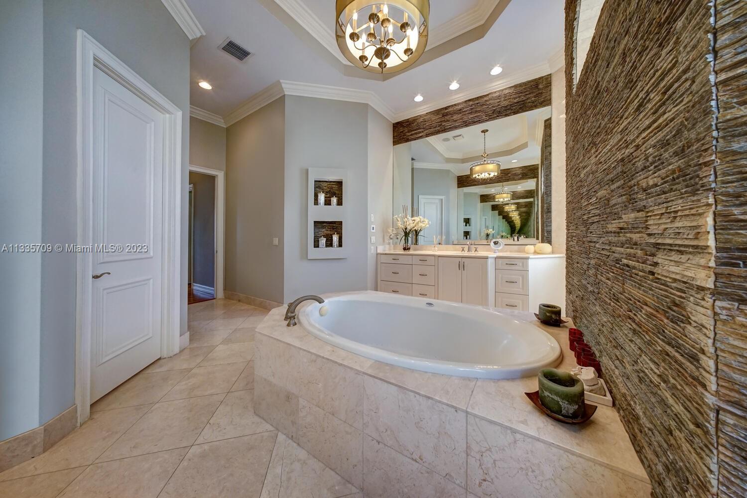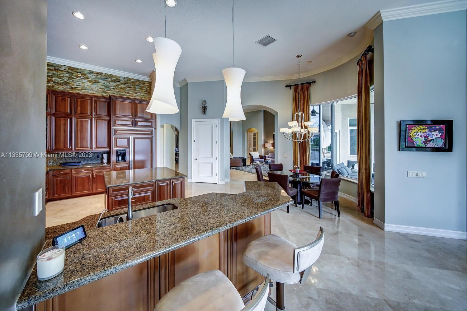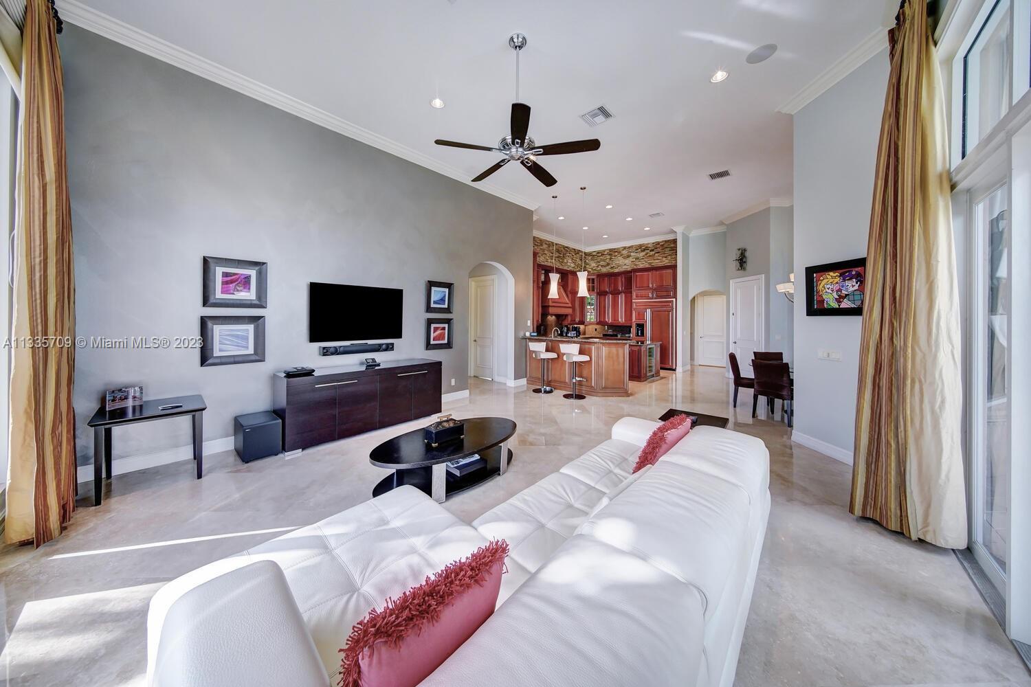 This exquisite 5 bedroom 5 baths waterfront home located in the prestigious guard gated community of Hawks Landing should be your first and ultimately last stop in your home search. This stunning one story sprawling ranch is enhanced by 16' high volume ceilings and gleaming marble floors throughout the main areas and is completed with hardwood floors in the bedrooms. Safety and comfort are number one with IMPACT windows and doors plus a full house GENERATOR.The expansive chef's kitchen is equipped with a Thermador gas cooktop and double ovens, large island with wine cooler, microwave, double stacked custom wood cabinets, a walk-in pantry and 48" built-in refrigerator. The outdoor space is enhanced w/ an infinity pool/spa plus an oversized covered lanai, w/ spectacular water views.