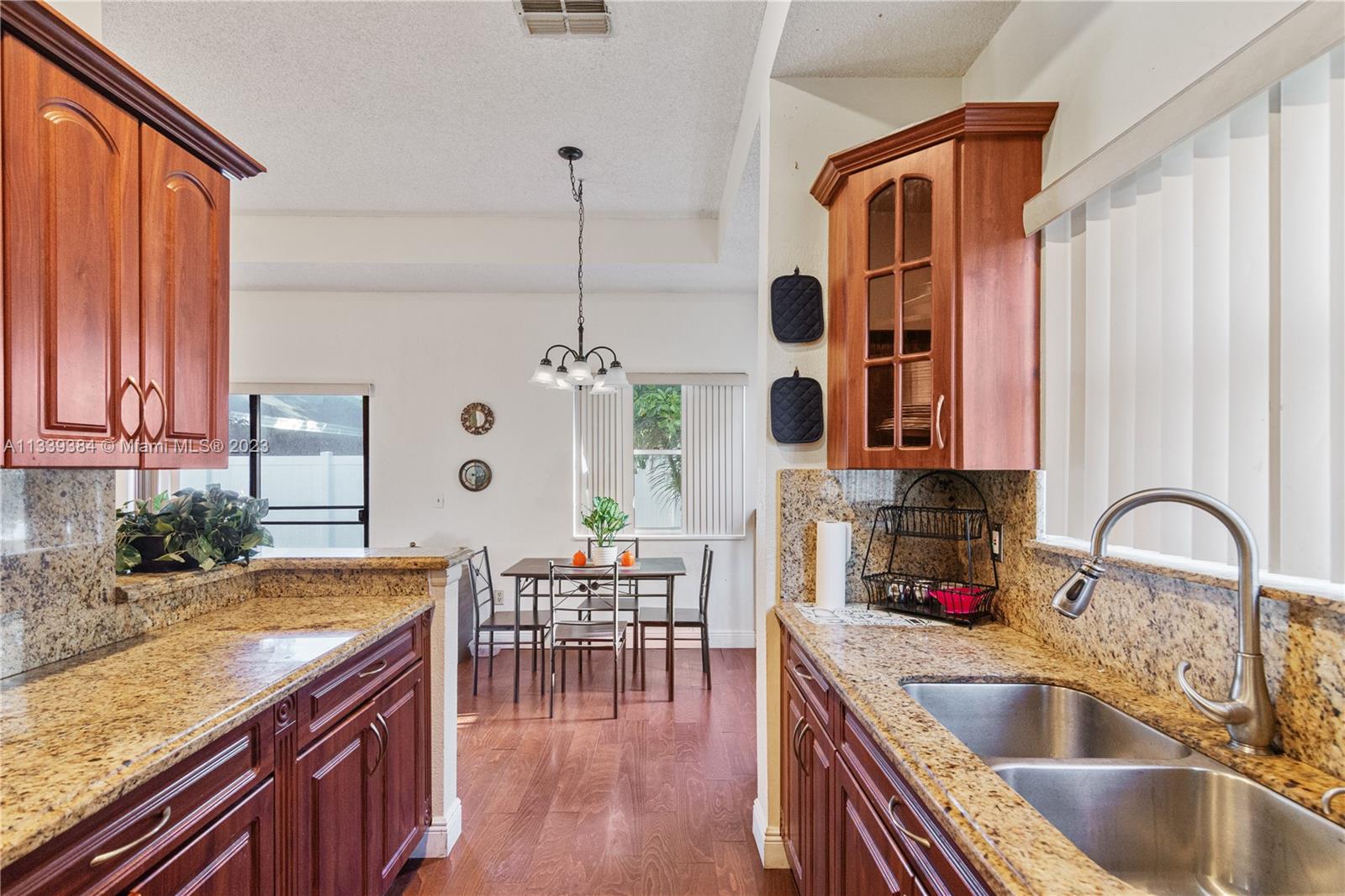 Very spacious 3/2 home nestled in a peaceful and very sought after neighborhood of Pembroke Pines. Very low HOA fee ($100/month) and excellent schools, this move in-ready gem won't last long. Wood floors throughout. The galley kitchen with granite countertops is waiting for you to start cooking up the next meal while you enjoy views of the water from your dining room table. The split layout has the first two bedrooms and full bath to your left and the Master bedroom + bath on the far side that makes for more privacy and peace. The yard is the perfect size to enjoy without having to stress about maintaining such a large space. The community offers amenities such the pool, tennis courts, exclusive park, playground and more. Enjoy a community pool, tennis court and more. OH 02/26 3 PM TO 5 PM