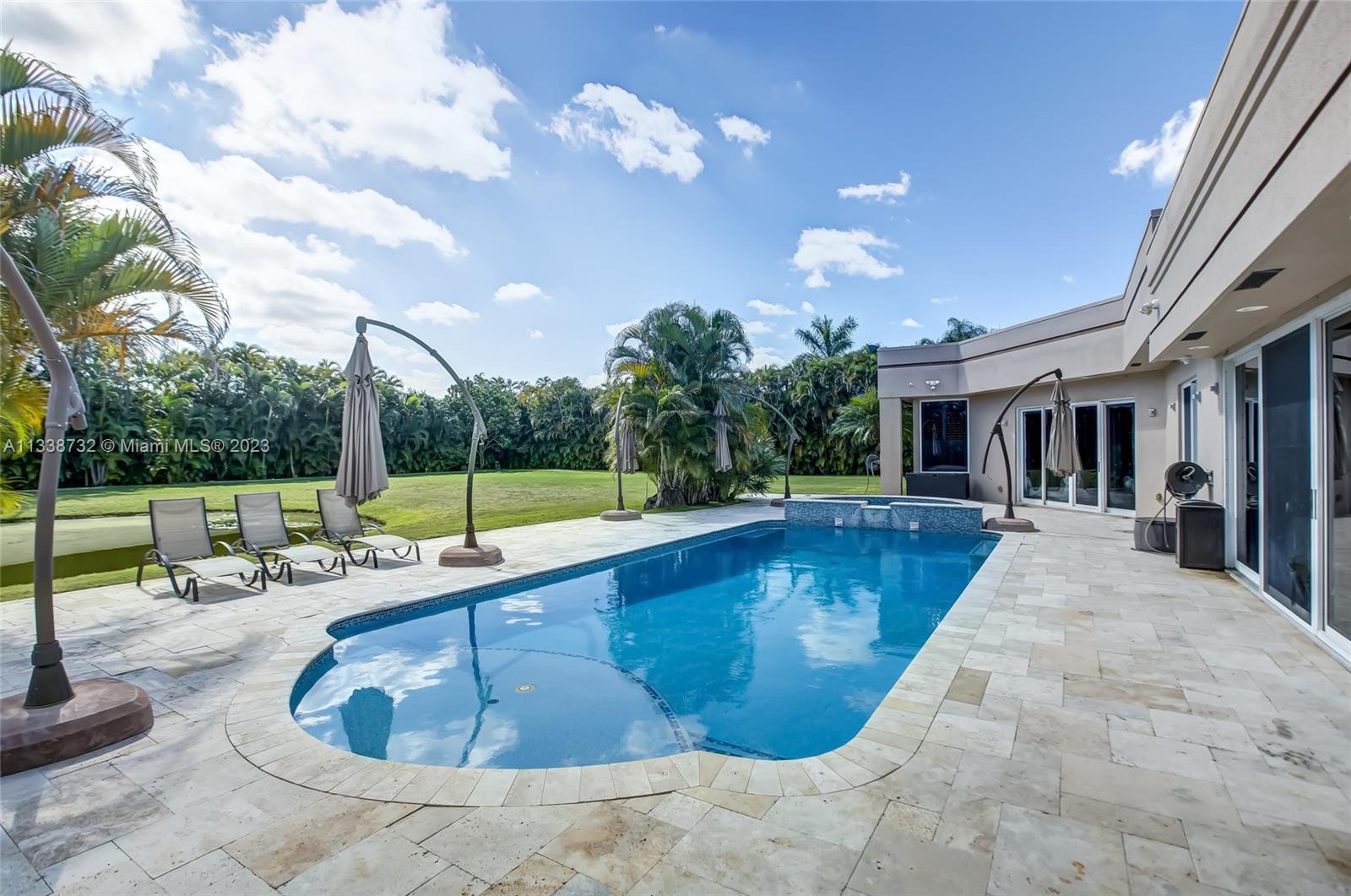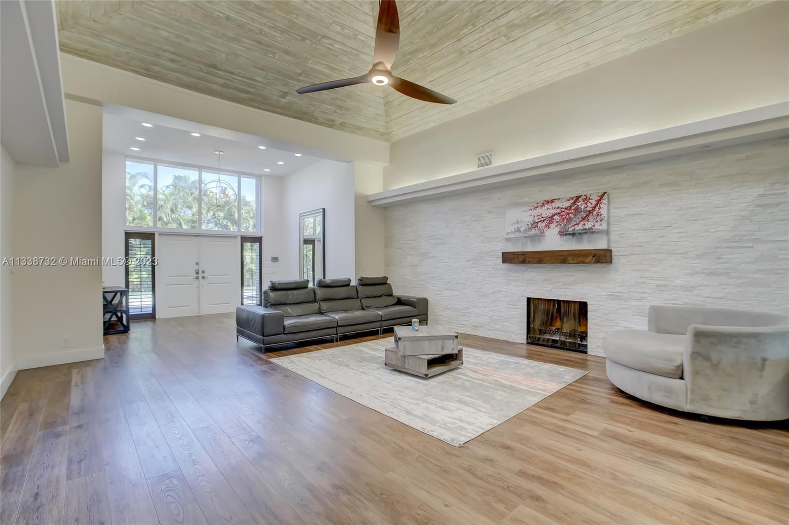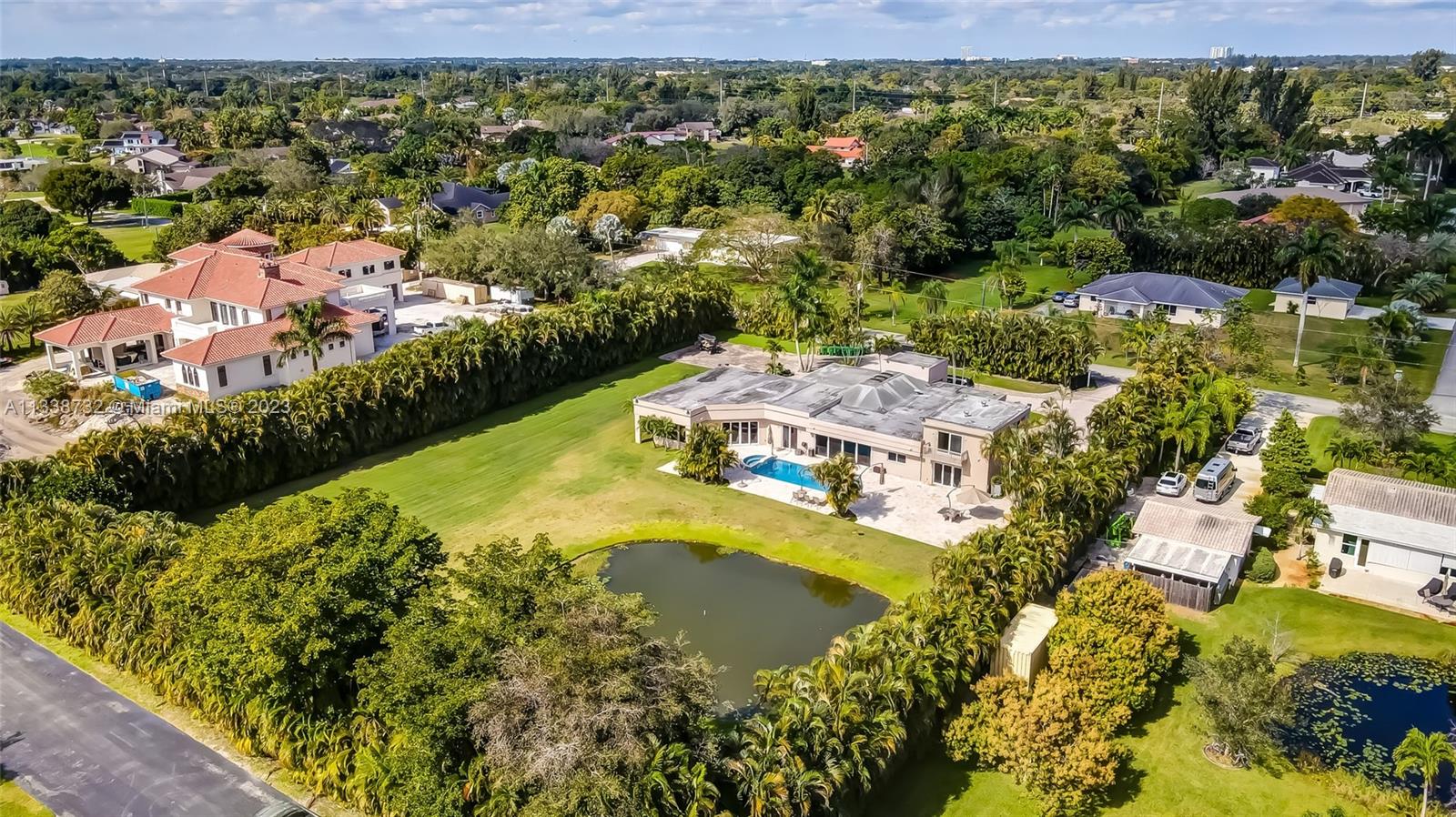 Private gated estate is an entertainers dream home on 1.5 acres of land in the heart of Davie. 5/3.5 baths + a bonus room that can be an office or gym featuring neutral laminate flooring in all main living areas and bedrooms. Huge open spaces including oversized great room with stone wall, and fireplace. Eat in kitchen with extended snack bar, granite counters, and wood cabinets. Expansive first floor master suite with 2 big walk-in closets, and master bath that features dual sinks, soaking tub, and step-in shower. Big secondary bedrooms with redone bathrooms. Amazing salt water pool and spa surrounded by endless travertine pavers. Impact windows except for the glass block. Expansive driveway for all of your cars, toys, boats, or RV. No HOA, minutes from 595 and 75.