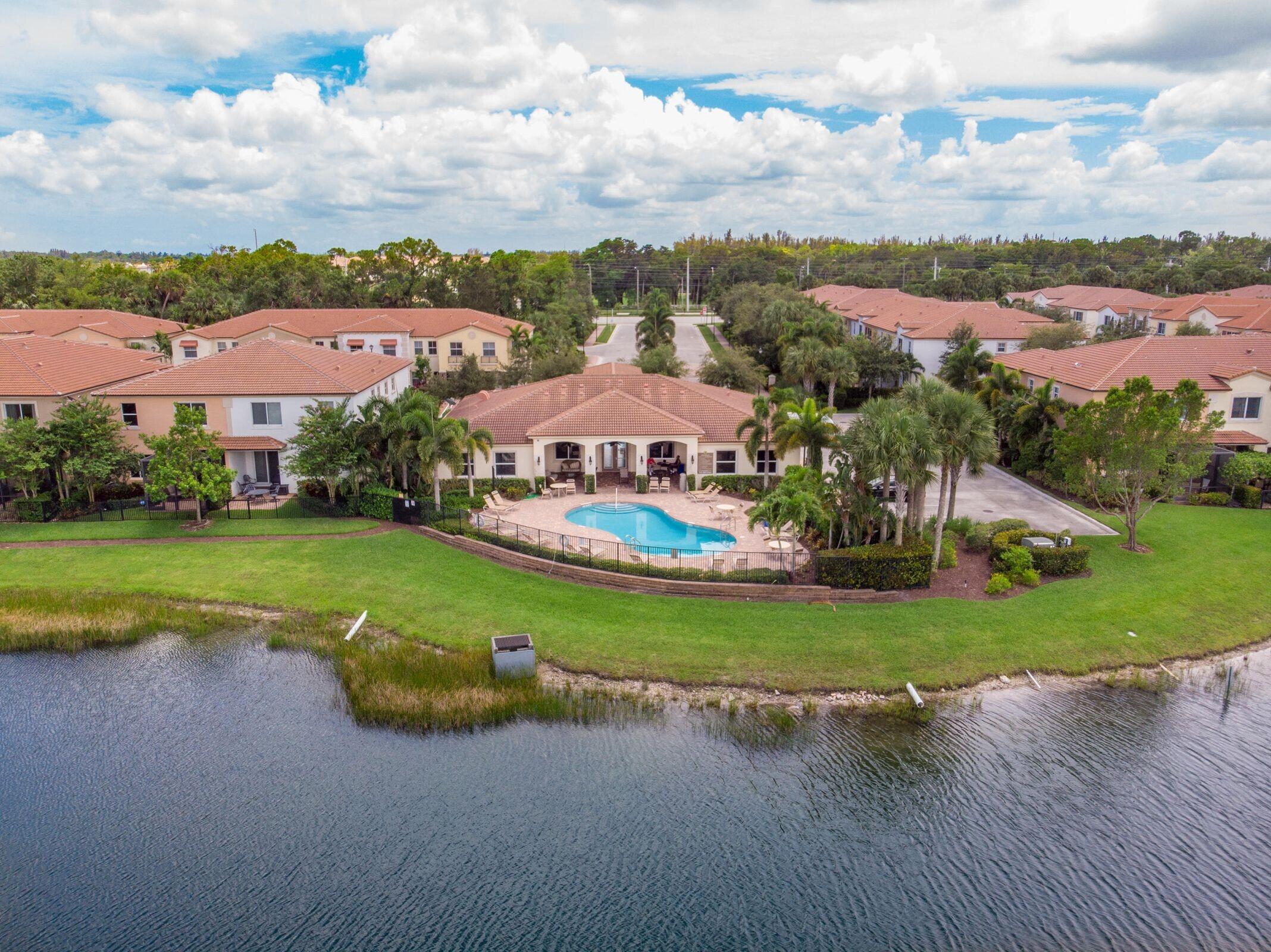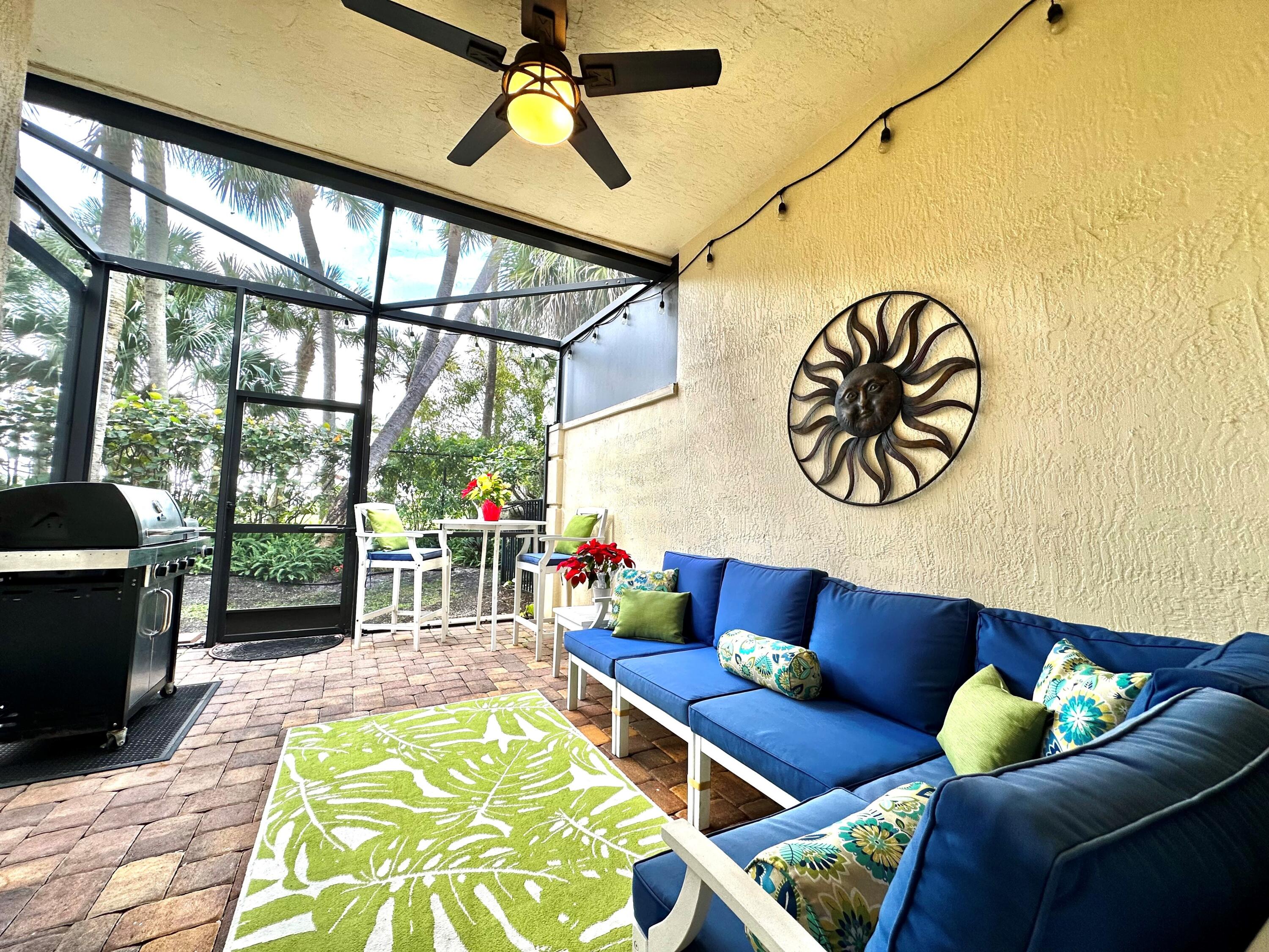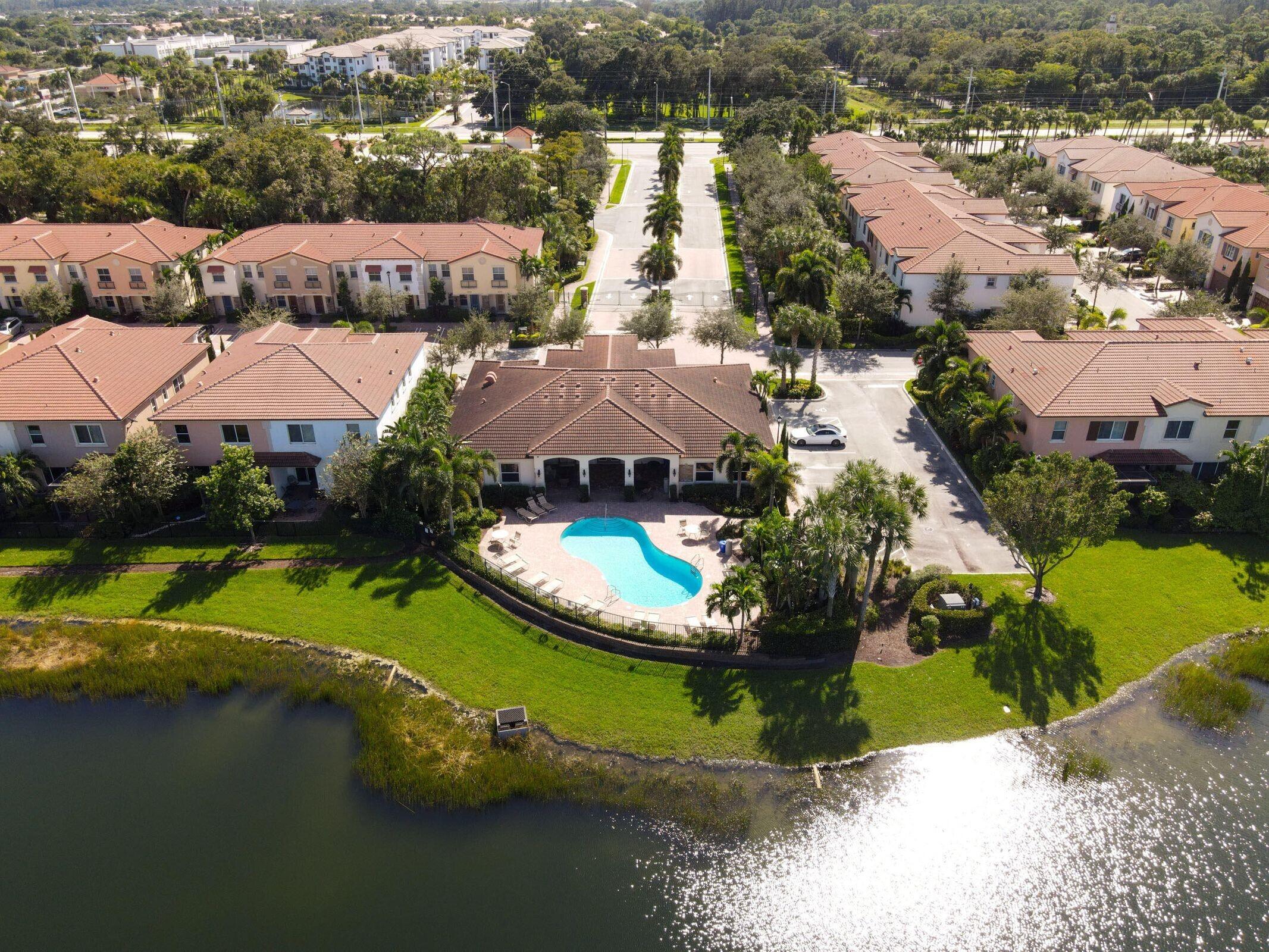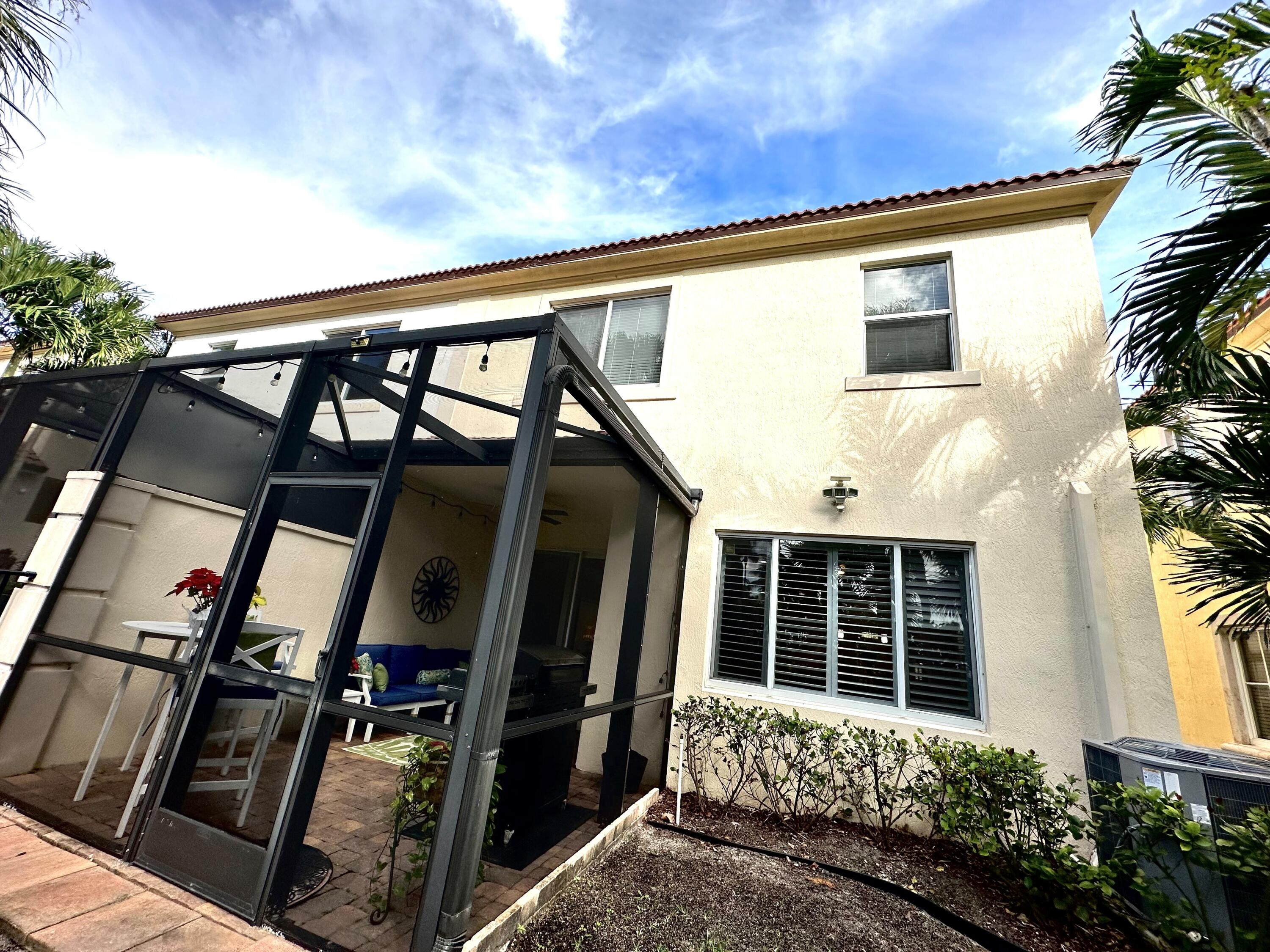 Spacious semi-detached townhouse that feels more like a house. Ceiling fans in all 3 BRs, great room and outdoor patio. Great natural light, high ceilings and luxurious finishes. White kitchen with SS appliances and granite CT. Huge MBR w/ his and hers WIC. Stairs and entire 2nd floor boast authentic gleaming hard wood floors. First floor has ceramic tile on the diagonal and stylish plantation shutters. All window treatments stay. Hurricane doors and windows. Newer A/C unit (2019). Large screened patio (furnished). Heated community pool, clubhouse, gym, billiard, ping pong, tot lot are just some of the amenities. Only 2.5 miles from Turnpike, 15 minutes to airport, downtown and beaches. Top rated private schools in close proximity as well as shopping and restaurants.