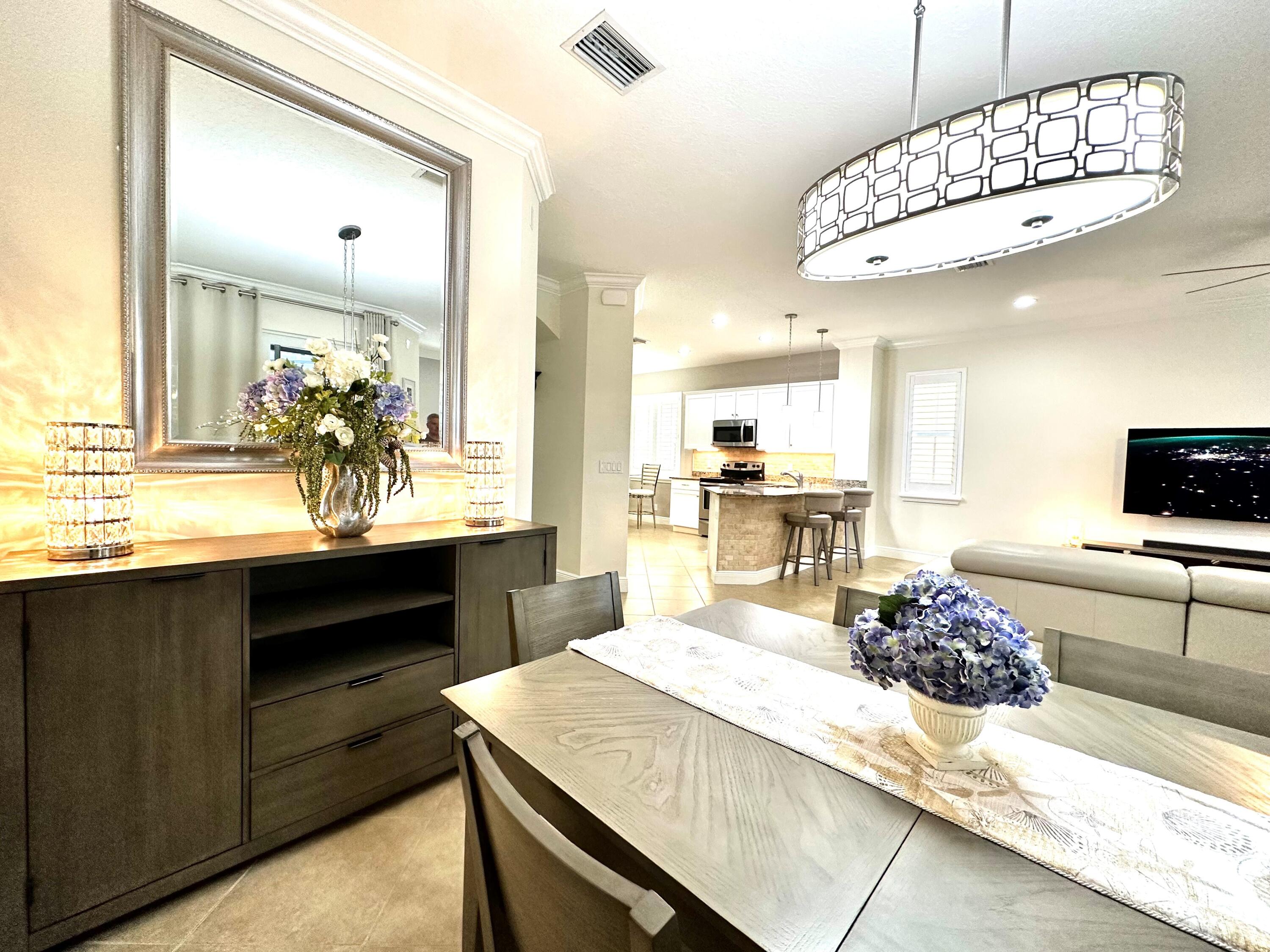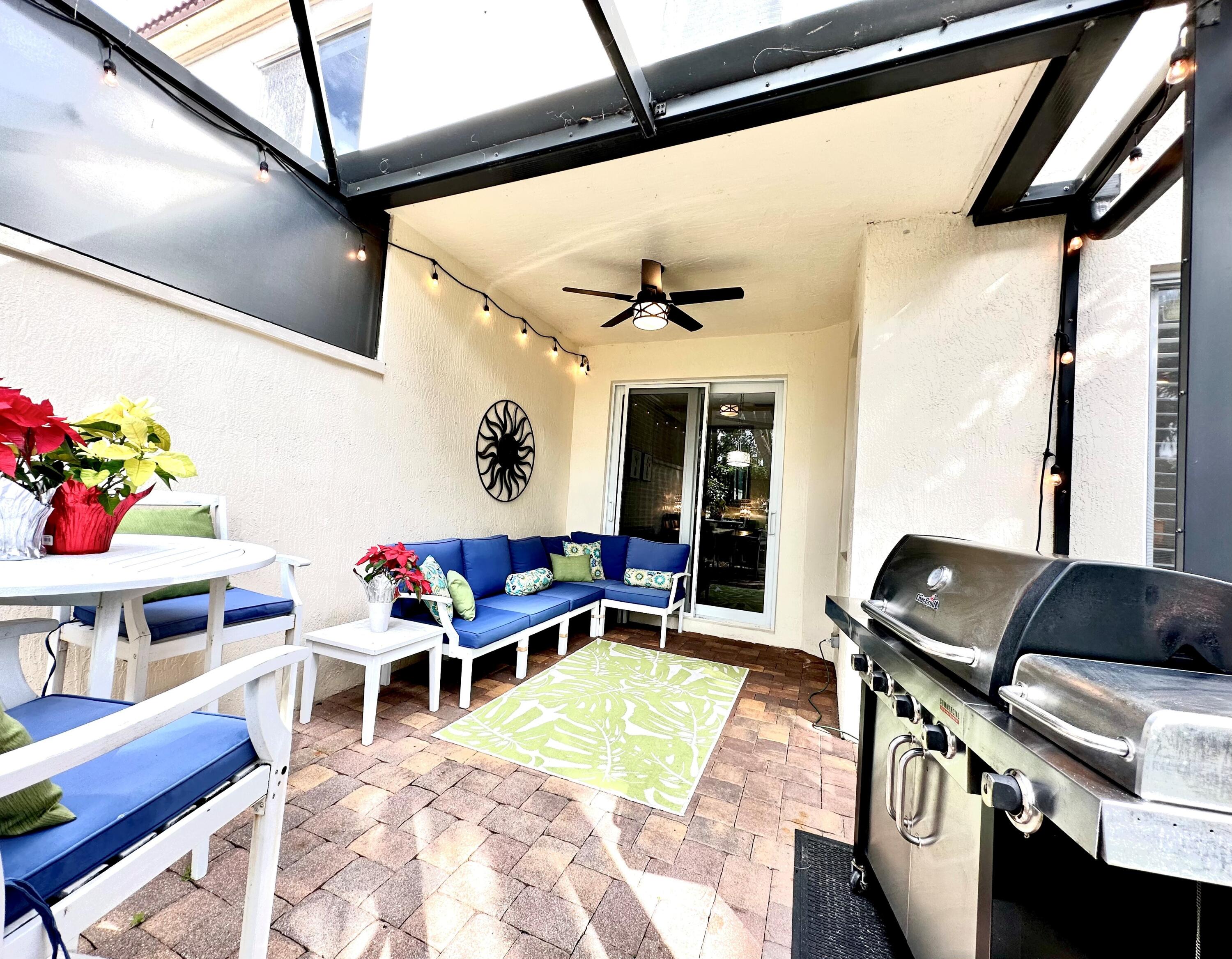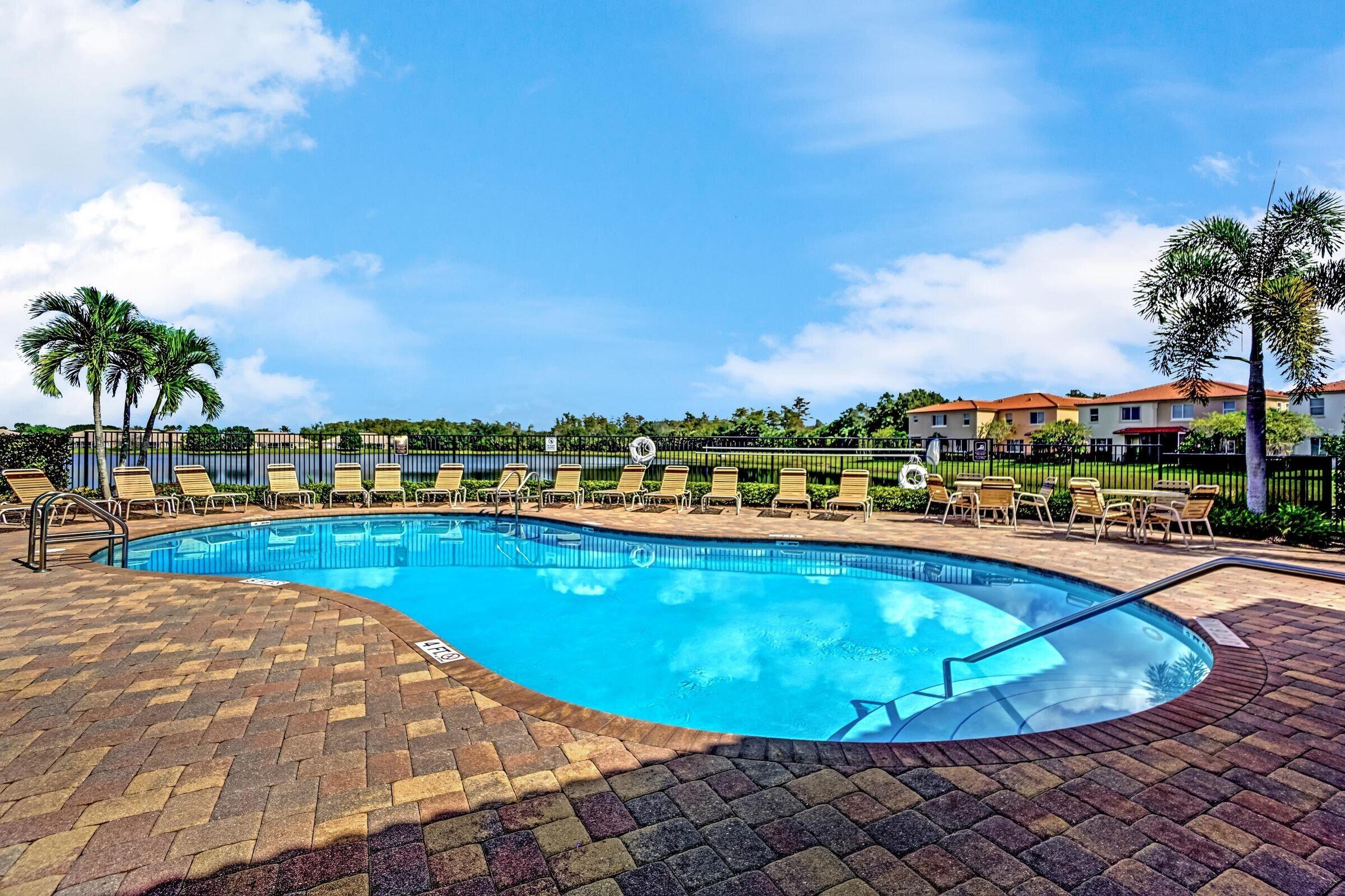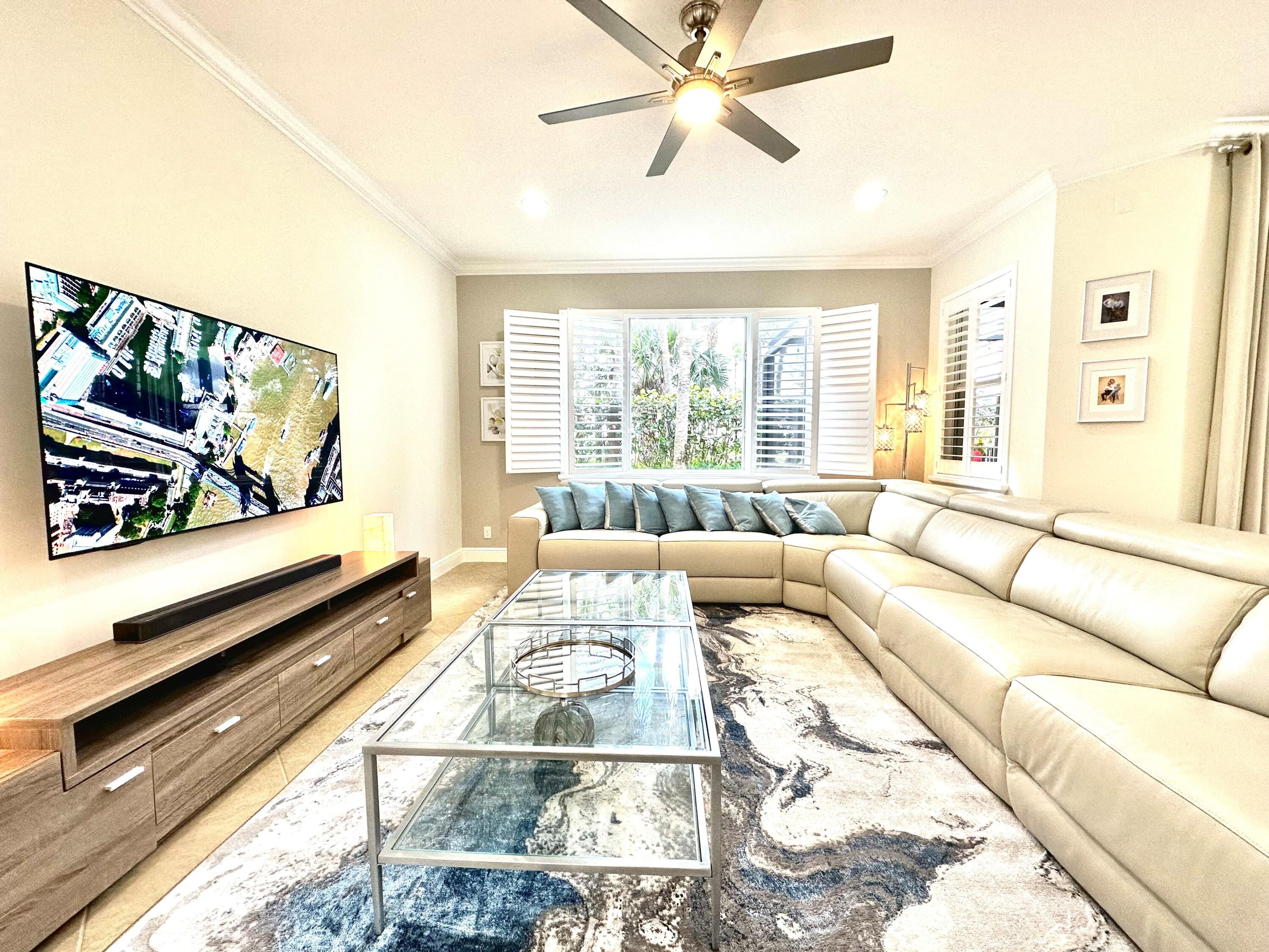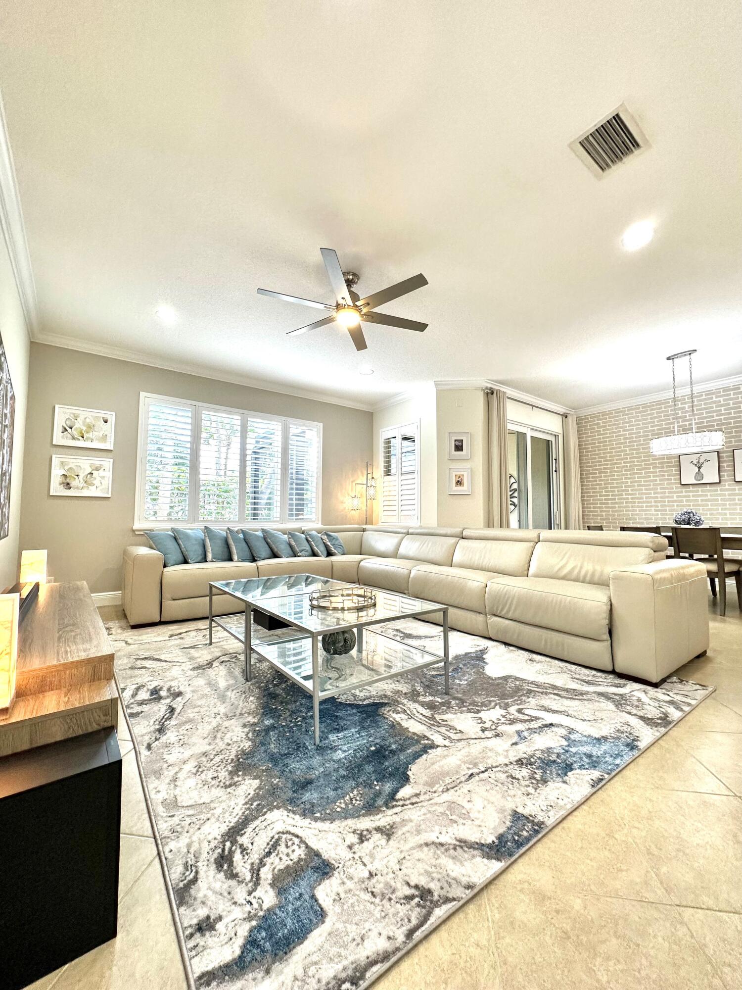 Spacious semi-detached townhouse that feels more like a house. Ceiling fans in all 3 BRs, great room and outdoor patio. Great natural light, high ceilings and luxurious finishes. White kitchen with SS appliances and granite CT. Huge MBR w/ his and hers WIC. Stairs and entire 2nd floor boast authentic gleaming hard wood floors. First floor has ceramic tile on the diagonal and stylish plantation shutters. All window treatments stay. Hurricane doors and windows. Newer A/C unit (2019). Large screened patio (furnished). Heated community pool, clubhouse, gym, billiard, ping pong, tot lot are just some of the amenities. Only 2.5 miles from Turnpike, 15 minutes to airport, downtown and beaches. Top rated private schools in close proximity as well as shopping and restaurants.