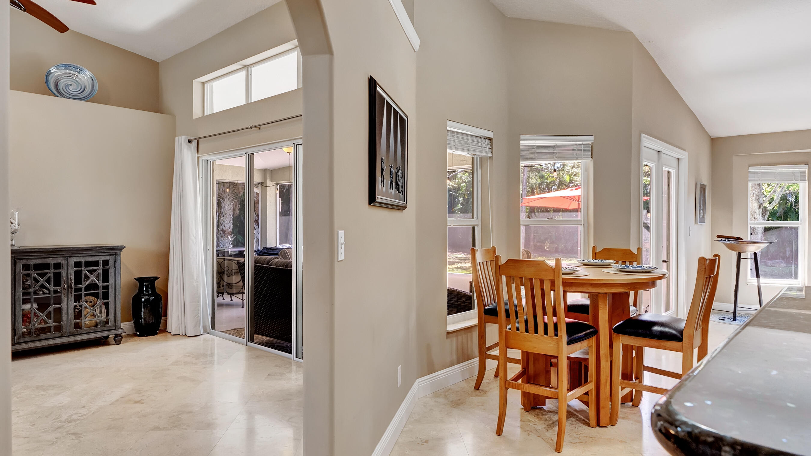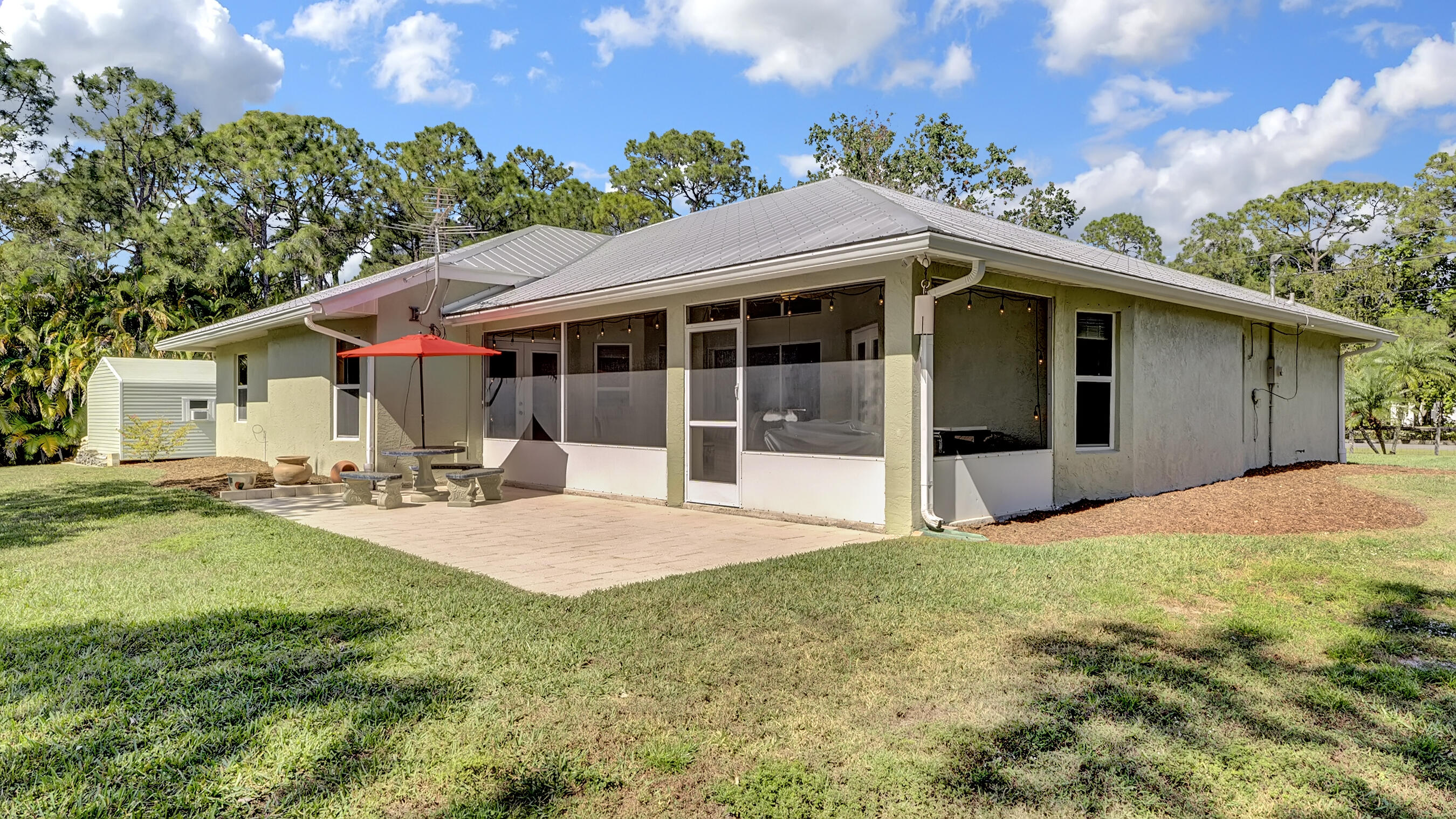 Open, bright and spacious 3 bedroom, 2 bath home on 1.2 acres. Volume ceilings in main living space. Tile throughout main living space; laminate wood look flooring in master bedroom. Eat-in kitchen open to large family room and access to large covered, screened porch. Marble countertops, stainless appliances, tall cabinets. Dining room functions well for office space. Large master bedroom with recessed ceiling. Spacious master bath. His and hers walk-in closets. French door walk-out to covered porch. Large paver patio. Fenced yard with foliage providing incredible privacy. A/C storage shed big enough to use as a work shed. Gated driveway. Lots of parking space and room for RV, boat etc. 5 year old metal roof. On paved road. Easy access to schools, shopping, highways, airports and beach