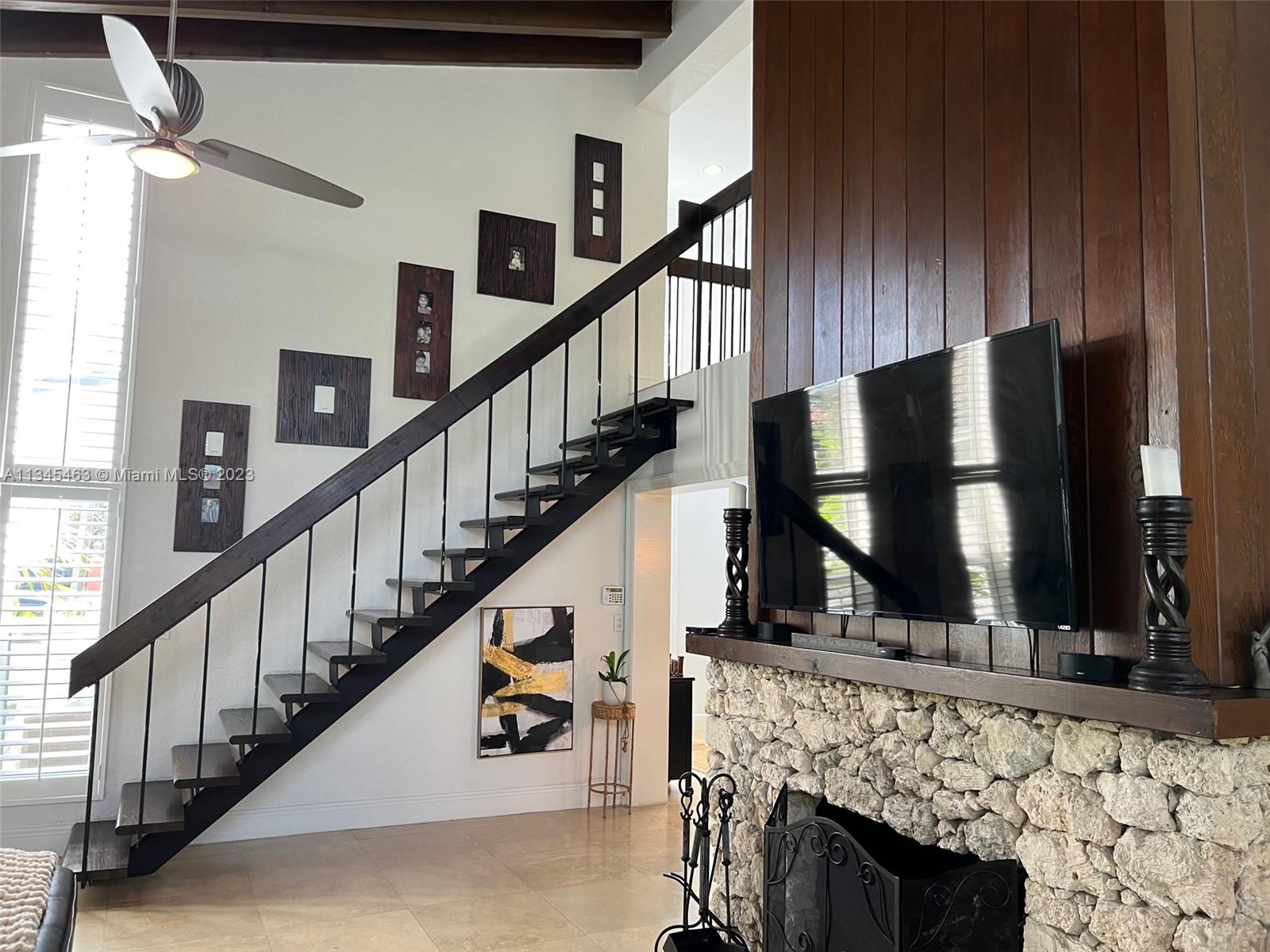 Enjoy the Miami Lifestyle all year round in this rare pool home in the Coral Gables Gated community of Kings Bay Estates. This large (3625 sq ft) renovated 5/3.5 bedroom/bath PLUS den gives you a smart floor plan that works for any family. Spectacular Vaulted Wood Beam ceilings in the family room are framed by impact windows and doors. The coral rock stone fireplace is striking. Master Bedroom is downstairs and includes a sitting area/walk-in closet/beautiful bathroom. Deeded community boat ramp access with 8 slips for only owners. Please review the website for all the impressive attributes of what you will want to call home! There is not anything else like this opportunity in Miami Dade-do not let it pass you by!
