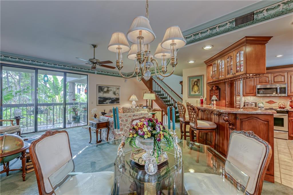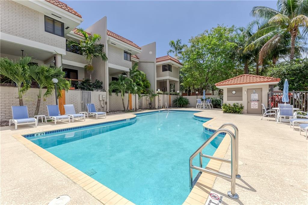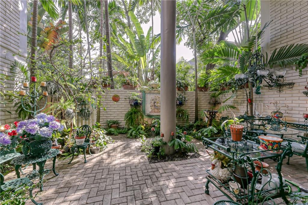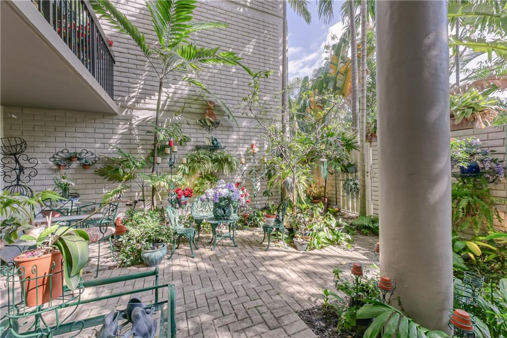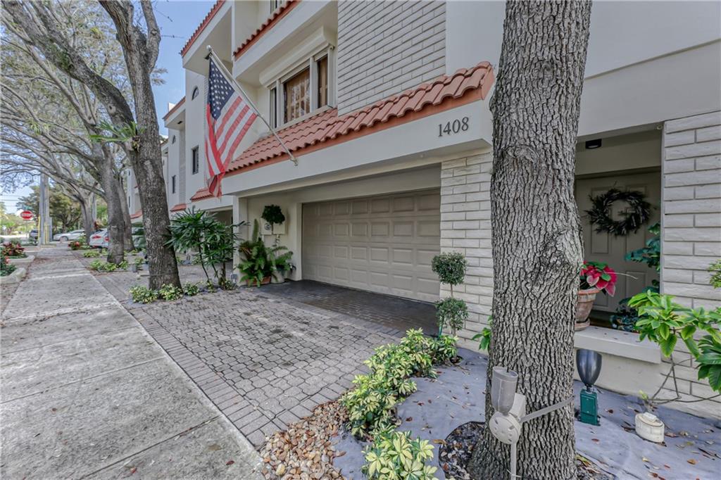 This Victoria Park Place townhouse has privacy in the back patio, with no other townhomes obstructing the breeze. This model has 2 bedrooms with an open den/office. Some owners have easily enclosed this area for a third bedroom. Large primary bedroom suite with dual sinks and two walk in closet. Main living area has a nice balcony overlooking the lovely garden patio. This unit has the A/C condenser located outside the back fence, so you do not hear that motor sound. Home has wooden Plantation shutters, protected by hurricane Roladen shutter system, metal front door, and impact garage door. #1408 is located "outside the gate", which means you have 2 parking spaces in front of your 2 car garage. Association coated roofs on in 2016. 2 pets OK. (Dining room chandelier NOT included).