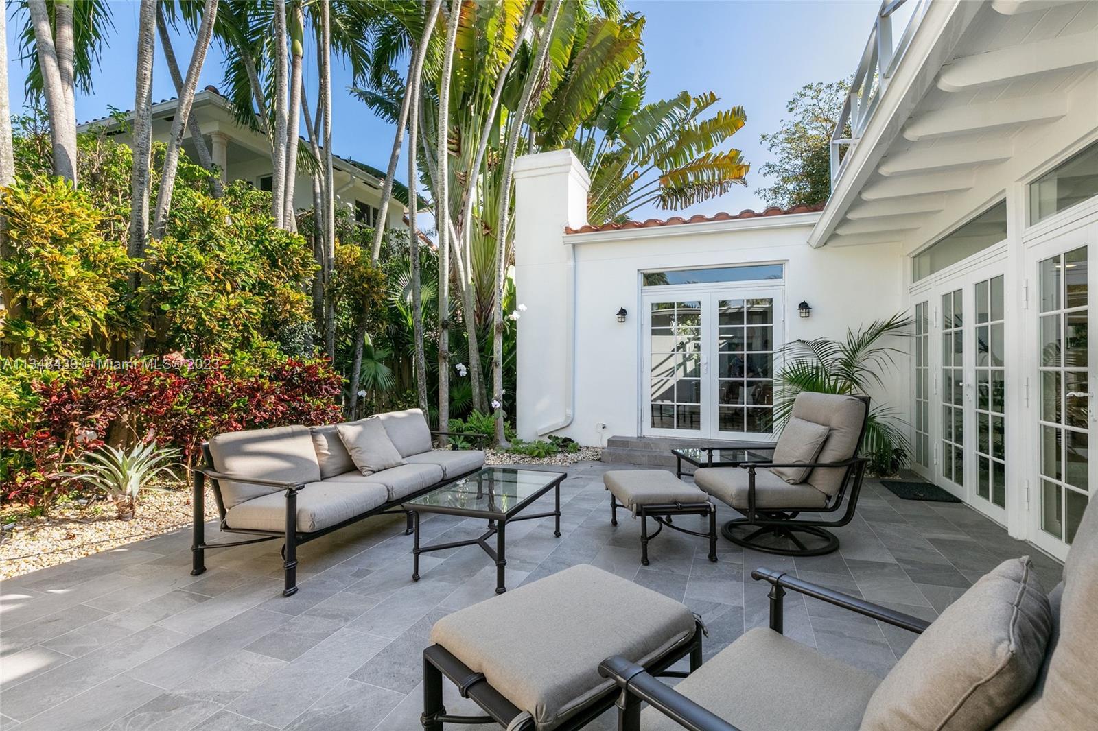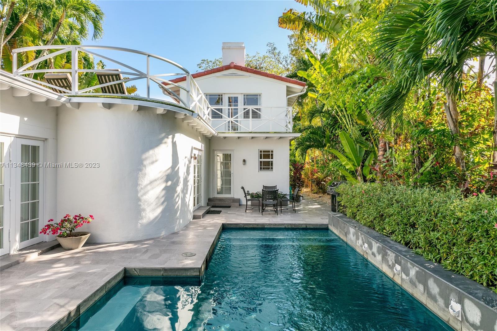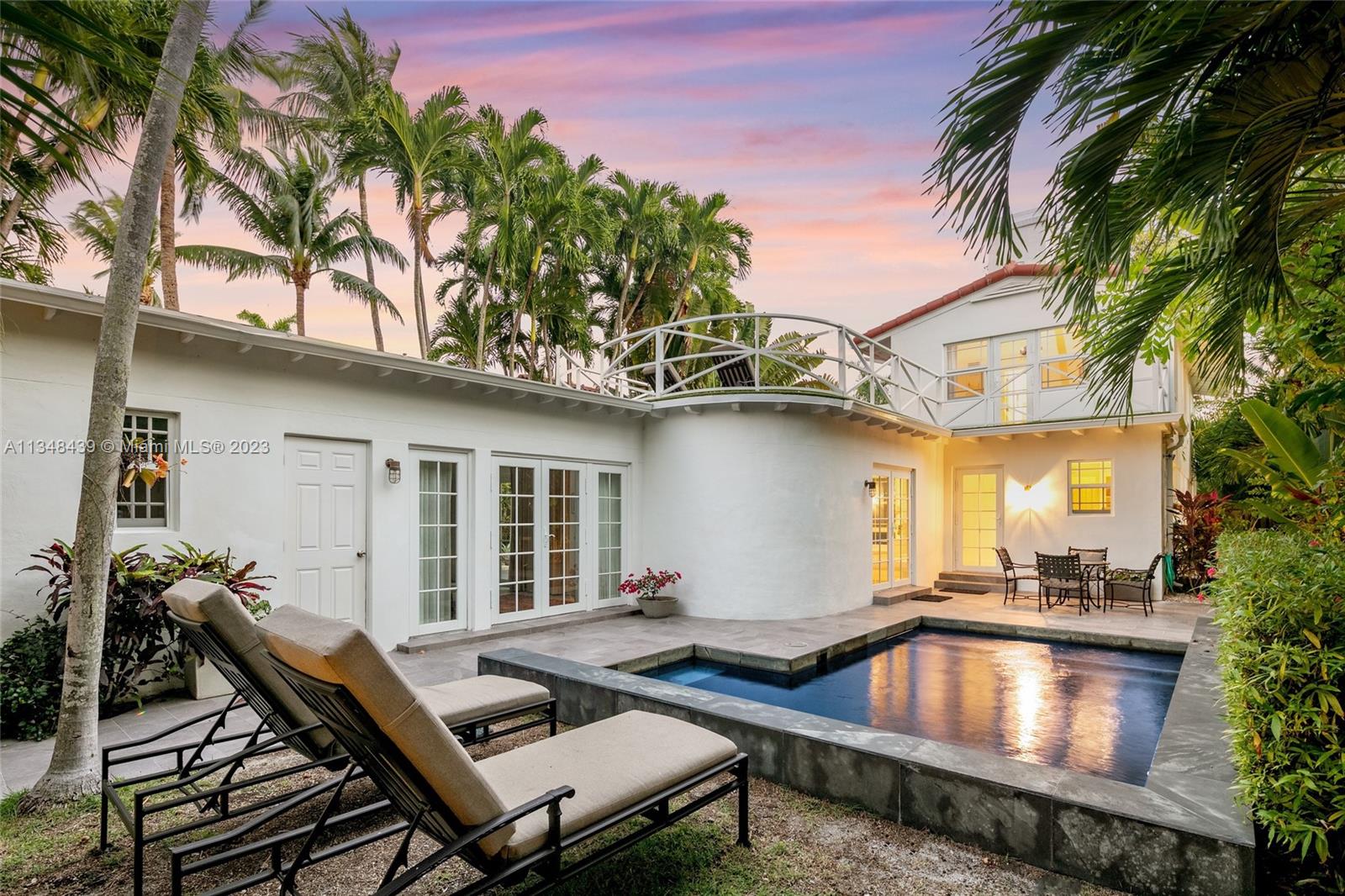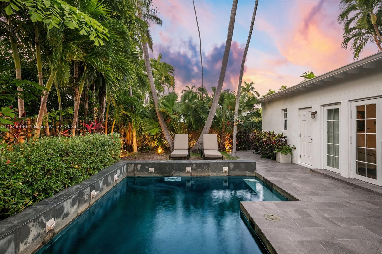 Tucked behind lush landscaping, this fully renovated Miami Beach Bungalow exudes charm & features vaulted ceilings, immaculate terrazzo floors, custom built-ins and abundant natural light through high impact floor-to-ceiling windows. A Gourmet kitchen has a Viking gas range stove & stunning white cabinetry. The home features Updated electric and plumbing as well as a brand new Roof. The ground floor primary suite has a large walk-in closet & spa-like bathroom w/ intricate tiles, free-standing tub & dual sinks. Enjoy a salt water pool & open patio which features French doors that lead into the dining room & access to the primary suite. 2 Car driveway w/ electric for charging. Walking distance to the trendiest shops, restaurants, Trader Joes, Fresh Market & fitness studios in Sunset Harbour.